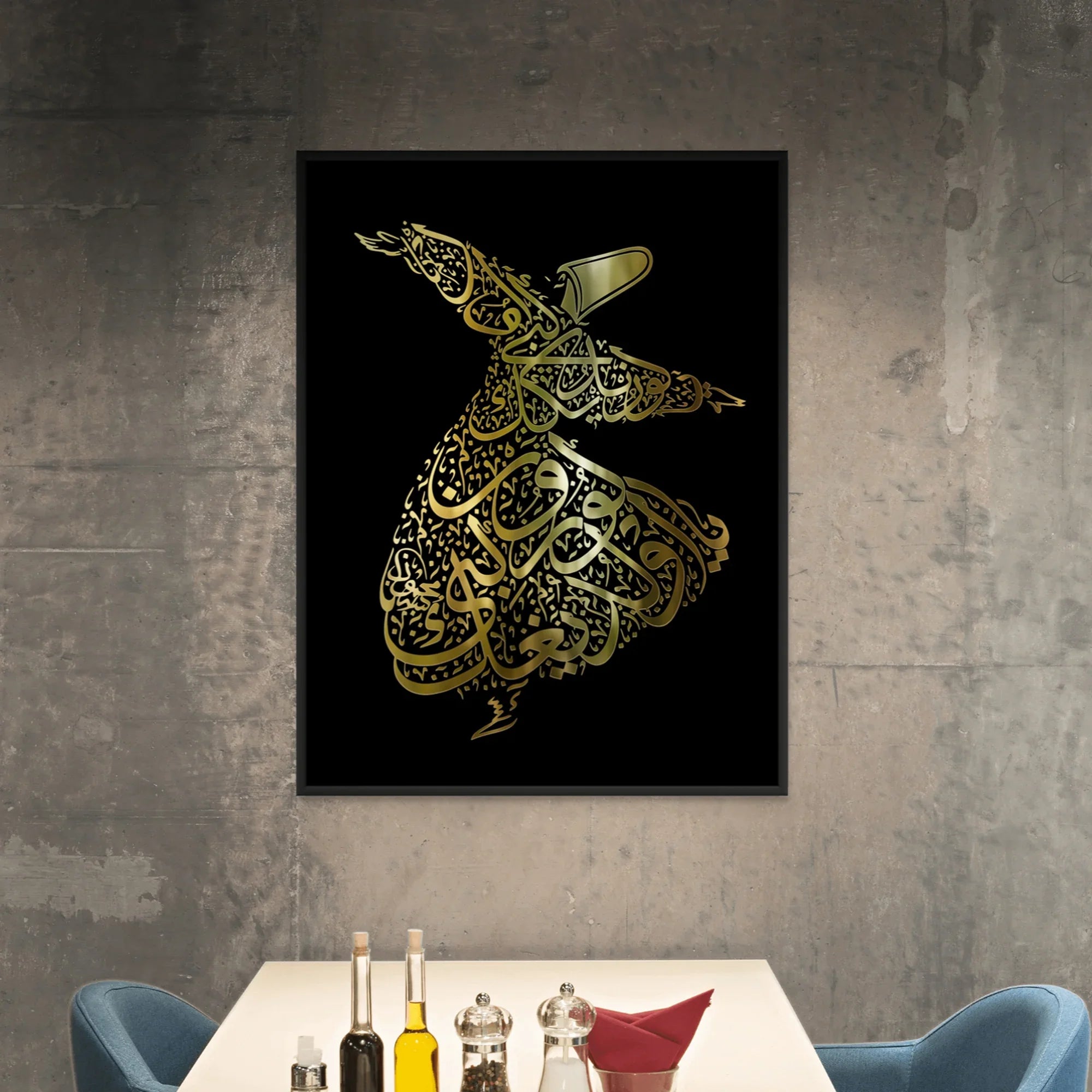 احتفل بجمال الرقص الصوفي وفن الخط العربي المتقن، معززًا بورق الذهب الحقيقي. مزيجٌ من التراث والأناقة، مثالي لأي غرفة في منزلك.