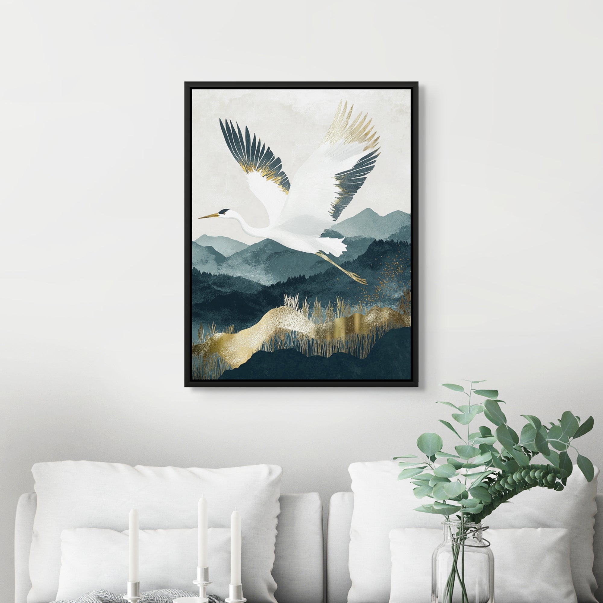 طائر كركي أبيض رشيق ينساب فوق جبال زرقاء ضبابية في هذه اللوحة المائية الهادئة. لمسات ذهبية ناعمة وخلفية شفقية تُضفي أناقةً على العمل الفني، مما يجعله مثاليًا لغرف المعيشة، أو الممرات، أو غرف النوم الهادئة.