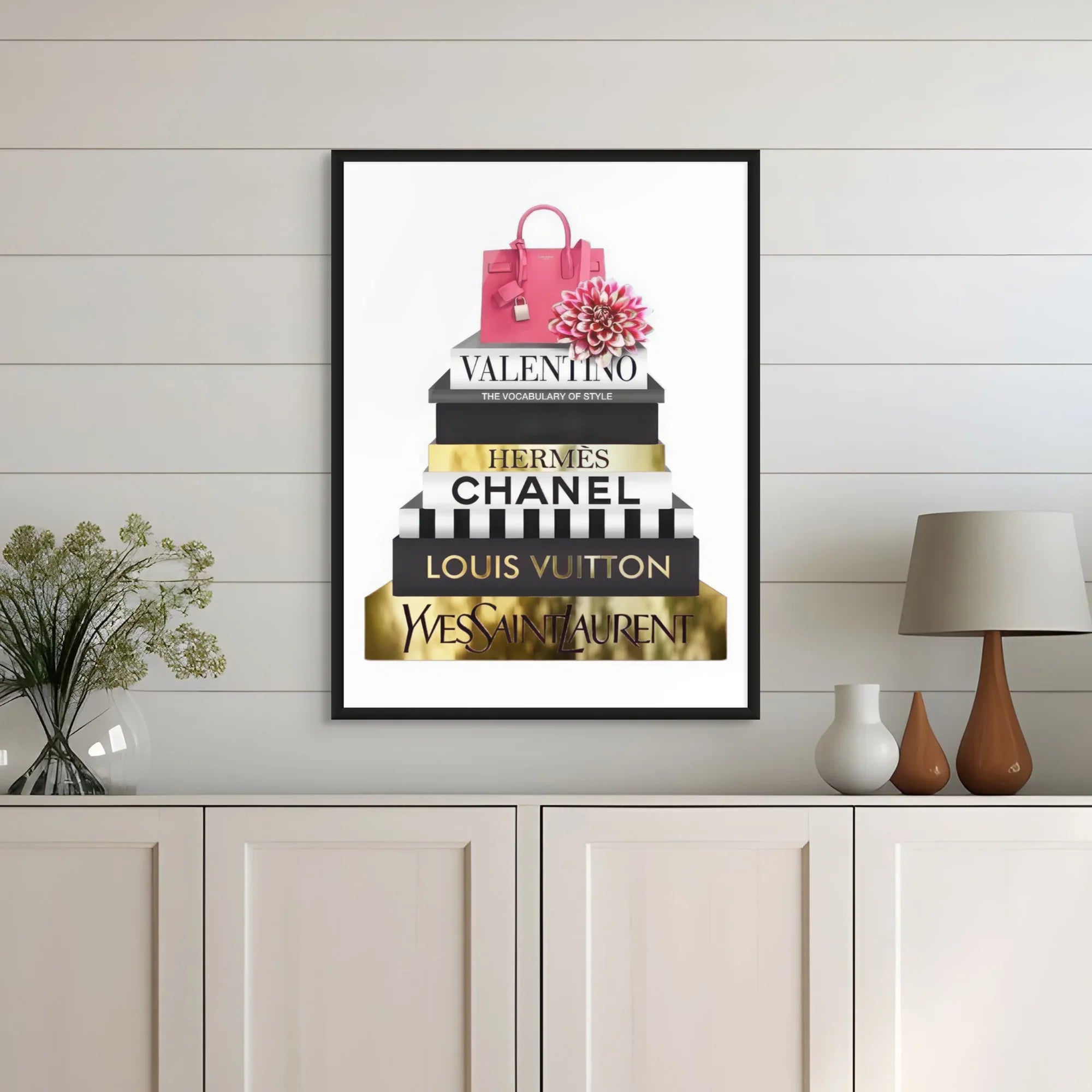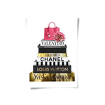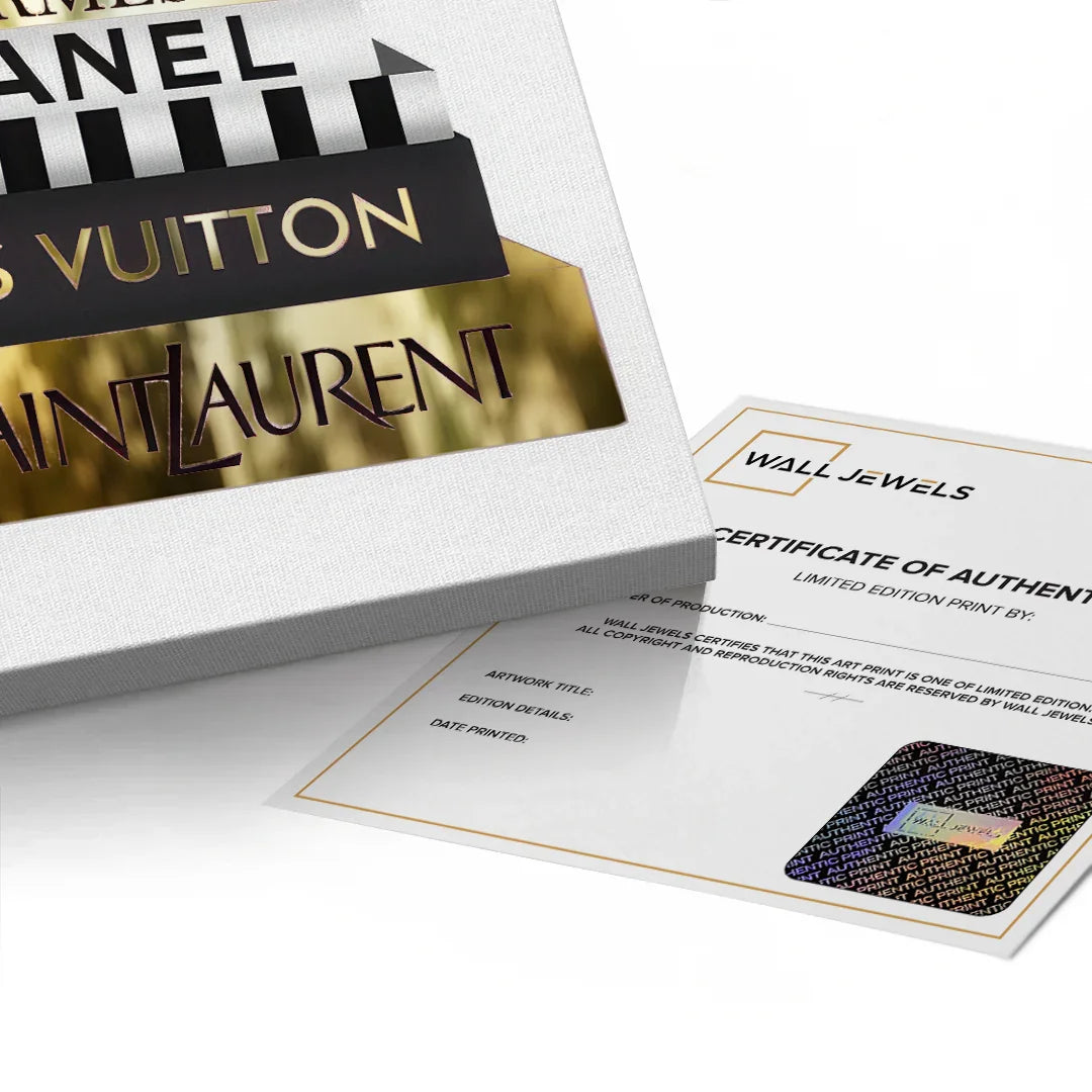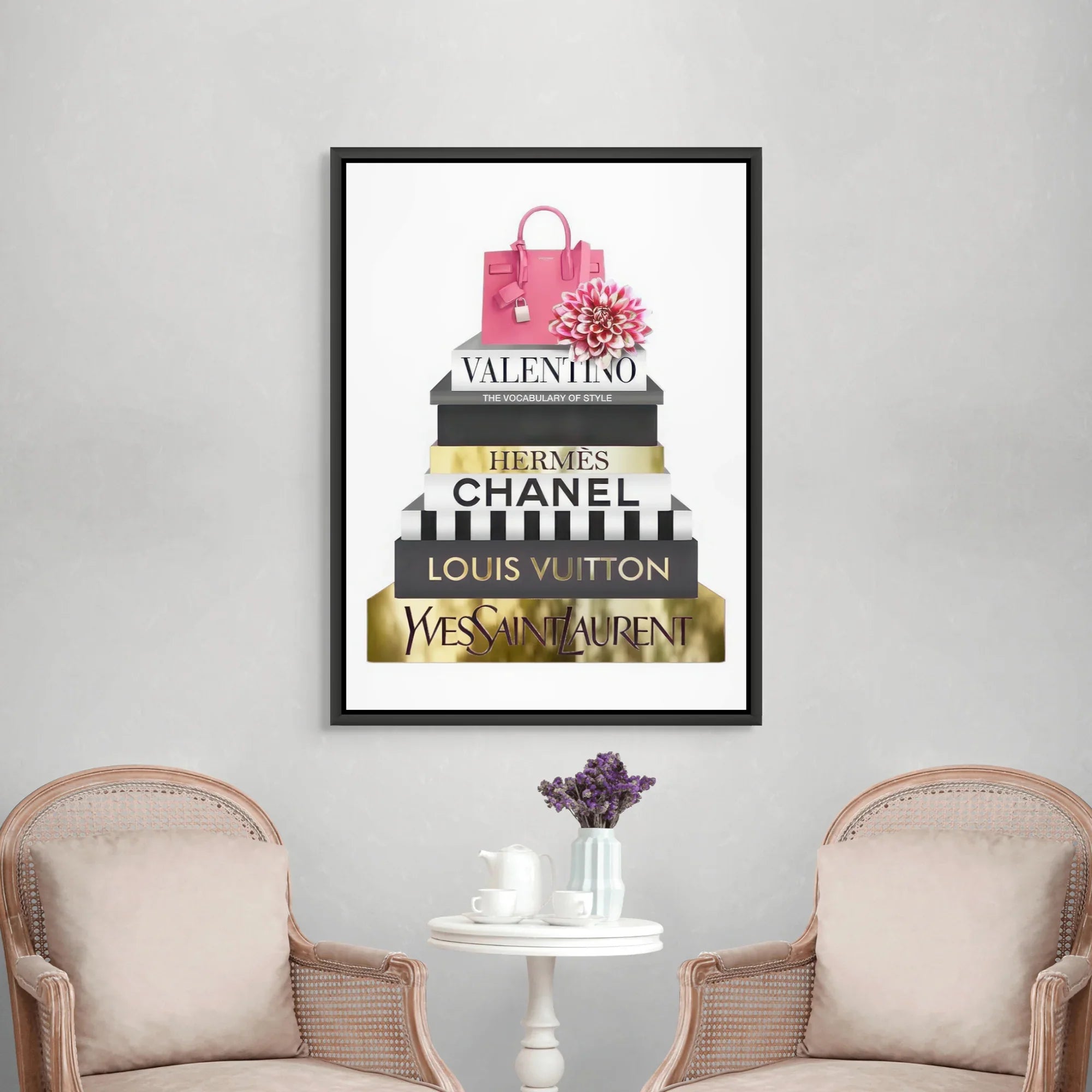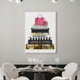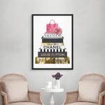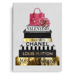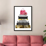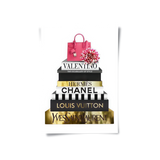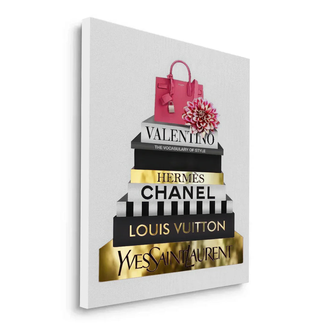 A luxe stack of high-end designer books, detailed in radiant gold foiling, crowned with a statement pink handbag and soft florals. Fashion Archives is perfect for glam spaces, closets, or style lovers who live for timeless fashion moments.