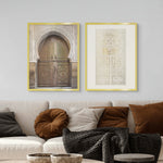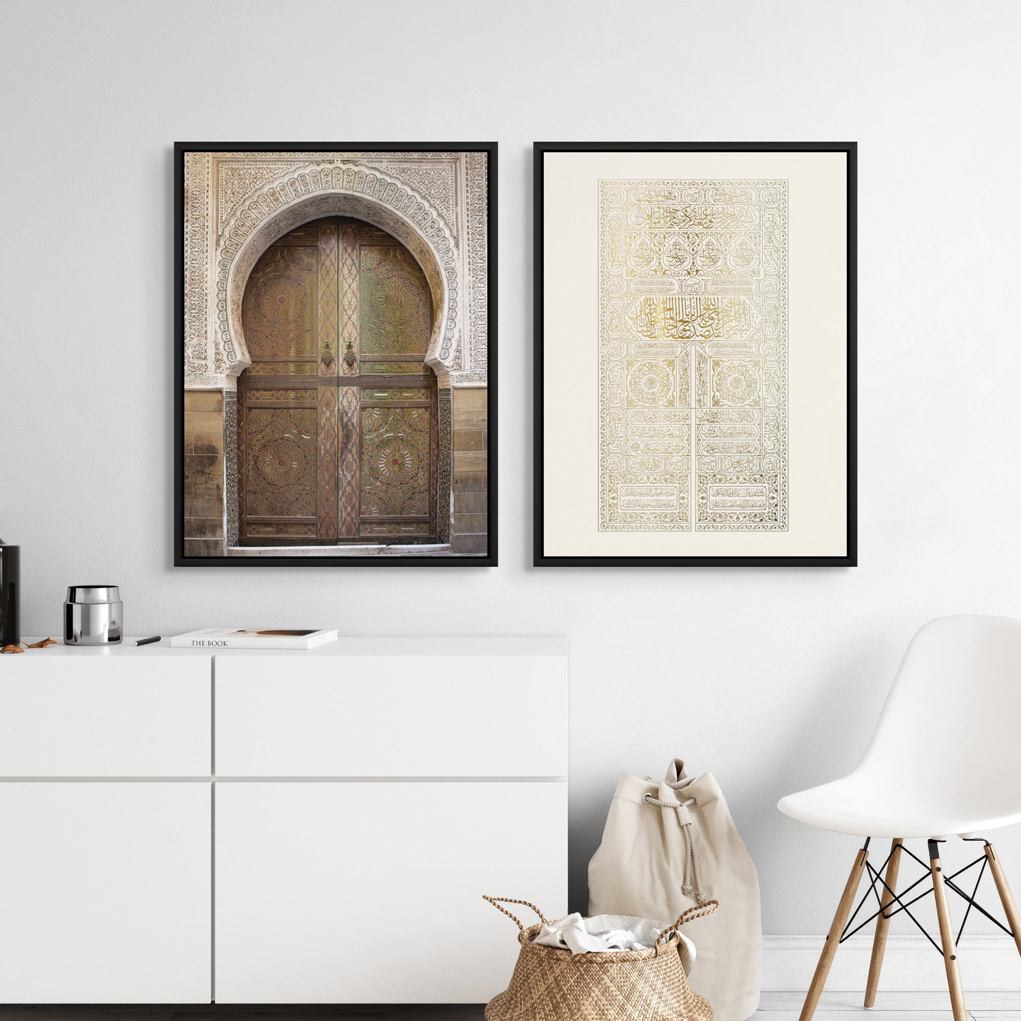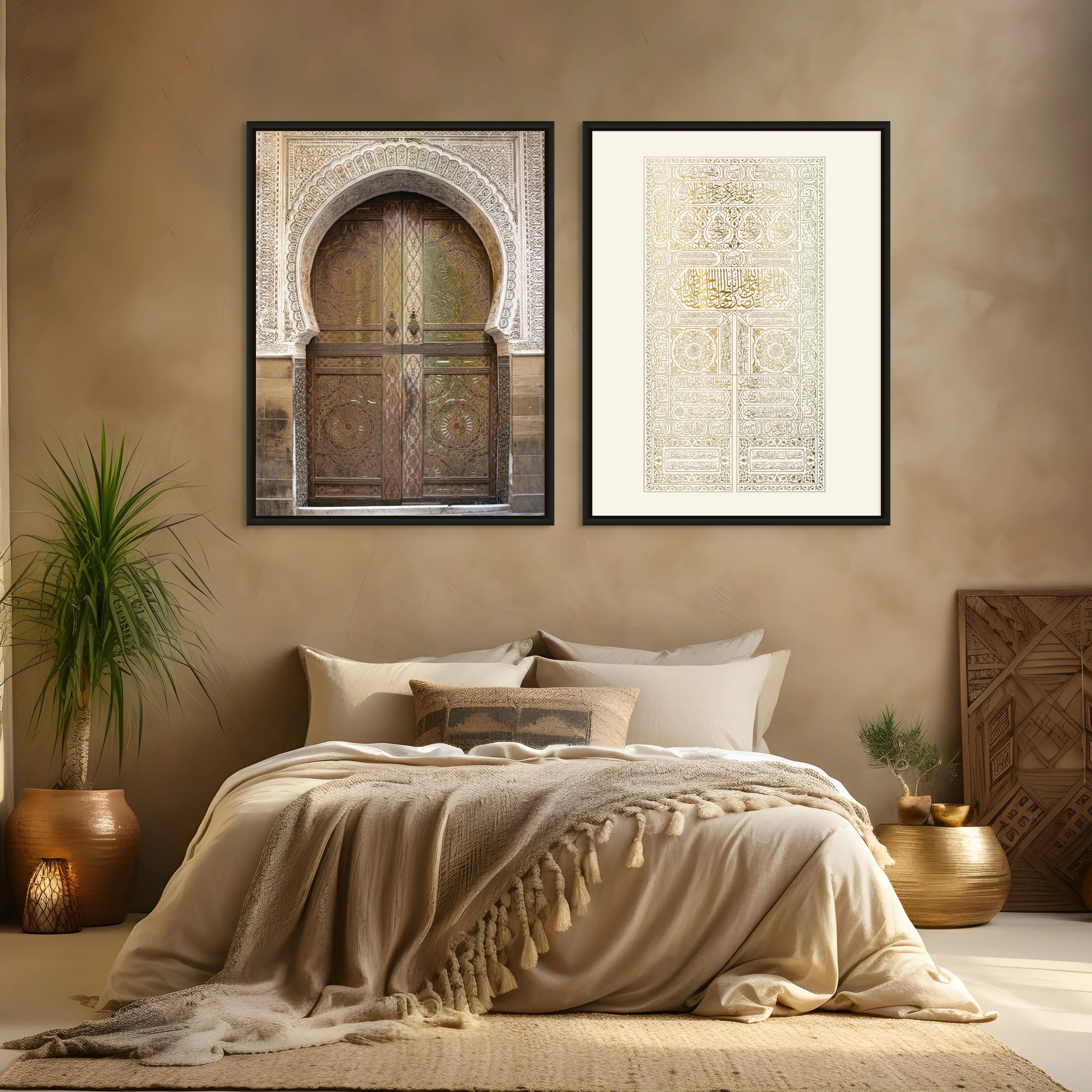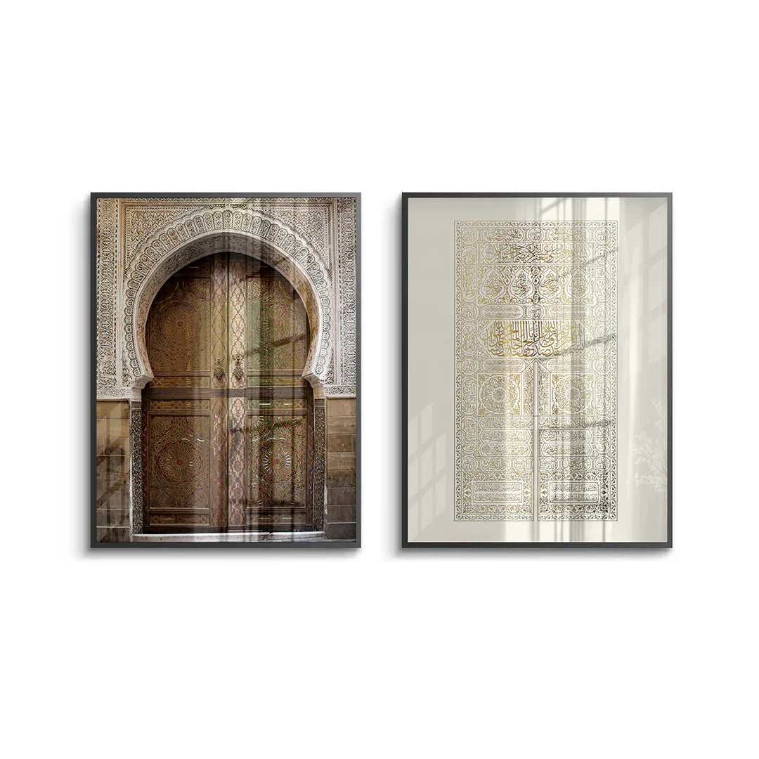 Bab al-Karam (Door of Generosity) presents a set of two gold-foiled artworks—one depicting the sacred door of the Kaabah, the other an ornate Islamic architectural entrance. Ideal for spiritual corners, prayer rooms, or contemplative spaces..