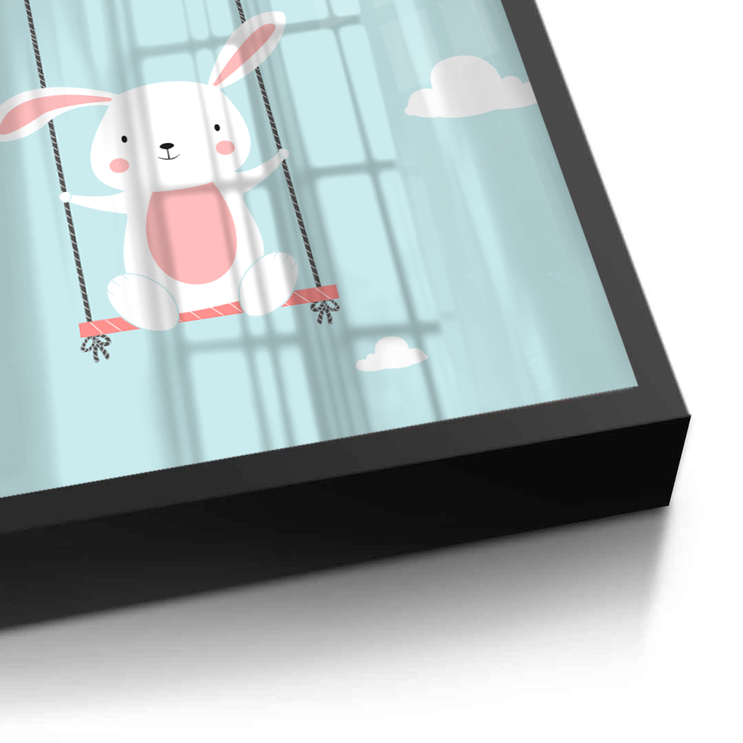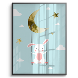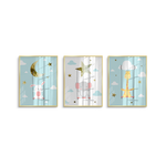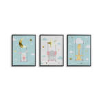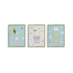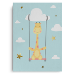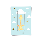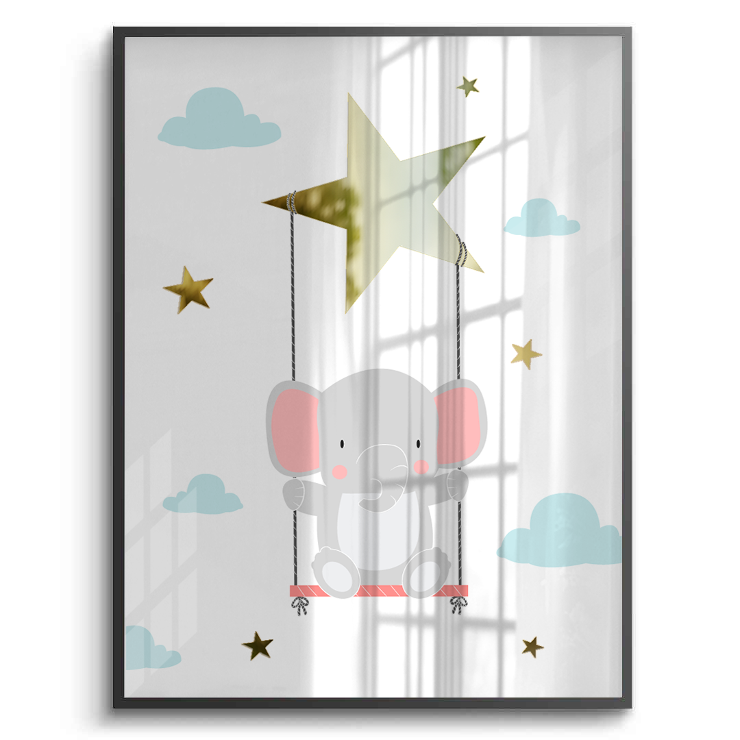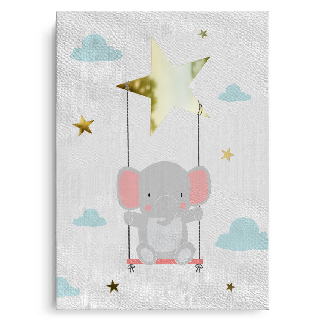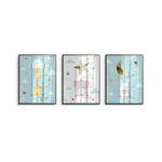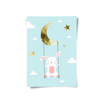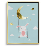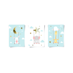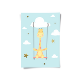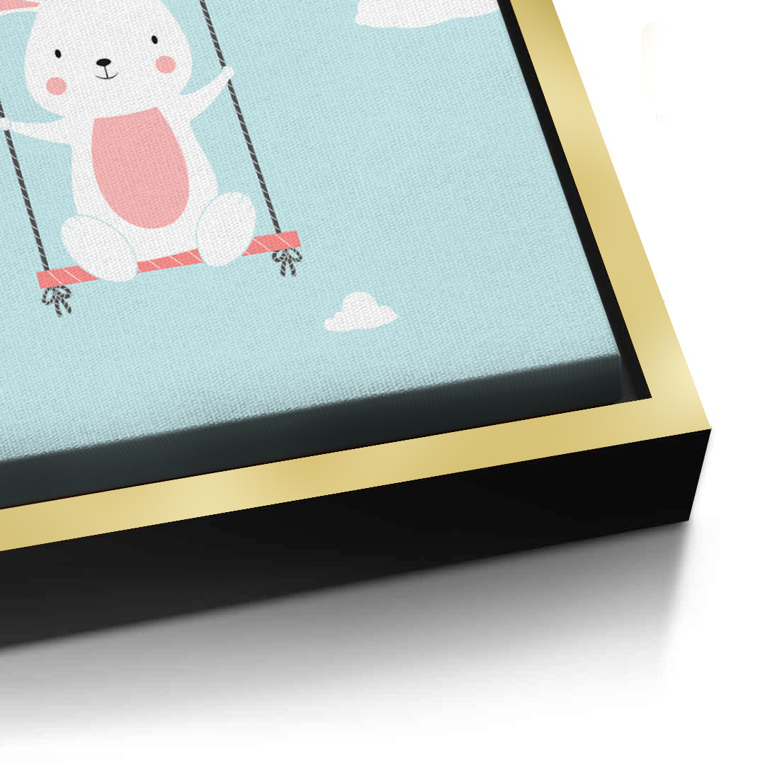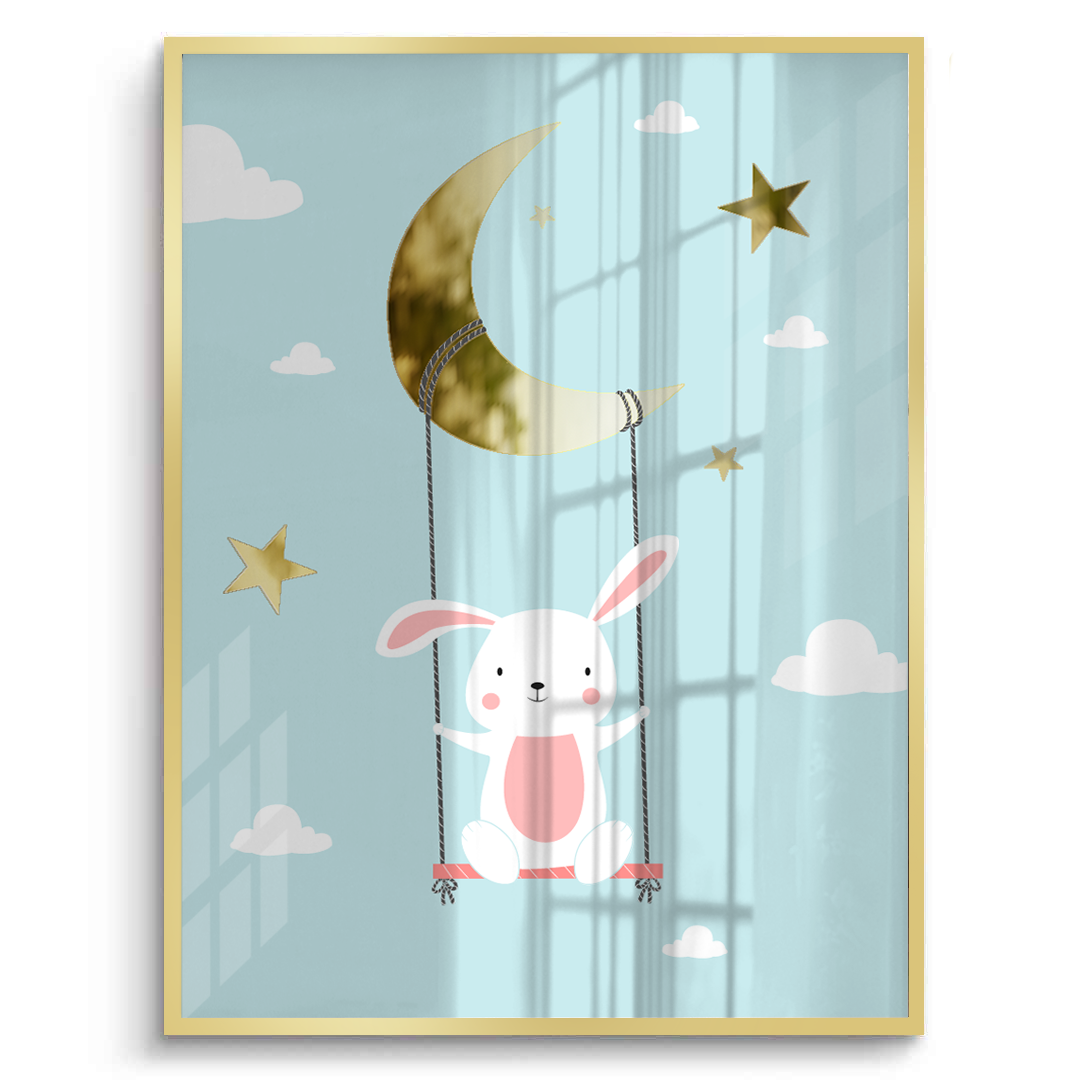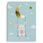 This adorable gold foiled kids’ art set features a playful bunny, elephant, and giraffe swinging among stars, moon, and clouds. Designed in soft pastel hues with shimmering gold details, it’s perfect for nurseries, playrooms, or children’s bedrooms.