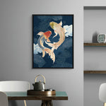 Inspired by Chinese artistry, this elegant piece showcases red koi fish gliding through deep navy waters. Accented with metallic gold-foiled scales, it radiates richness and balance—an eye-catching statement perfect for modern living rooms or tranquil corners.