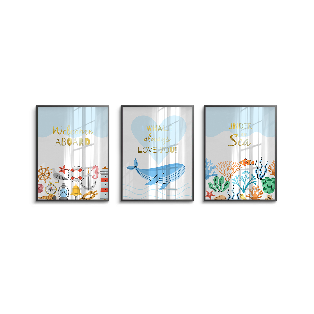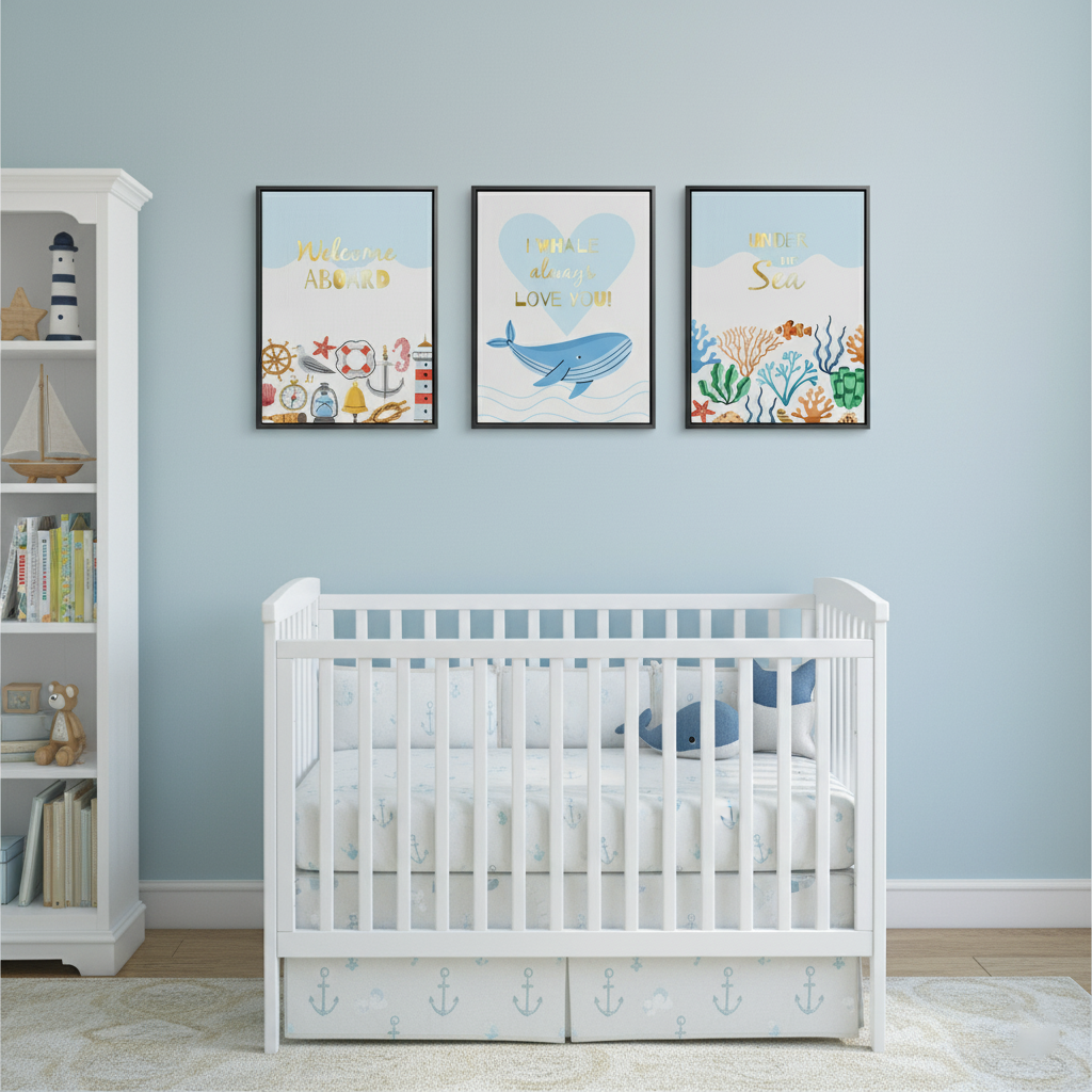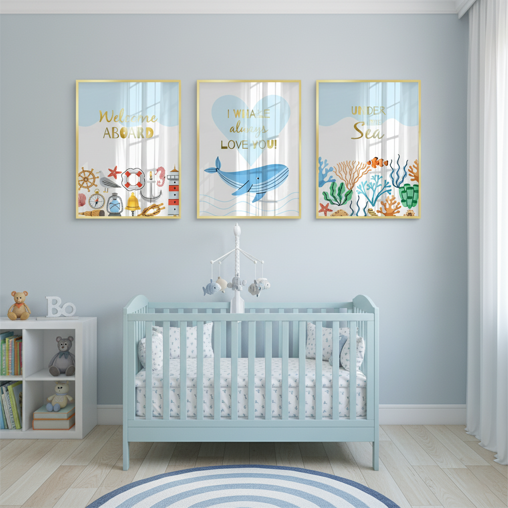 This playful gold foiled kids’ art set features nautical icons, a loving whale, and vibrant coral reefs with uplifting sea phrases. The shimmering gold foil details bring ocean charm, perfect for nurseries, playrooms, or children’s bedrooms.