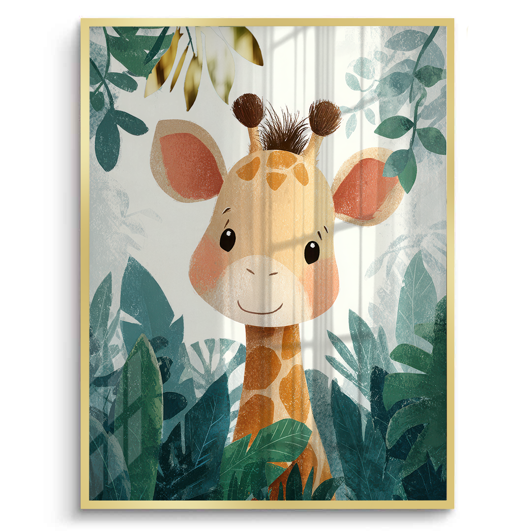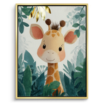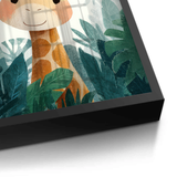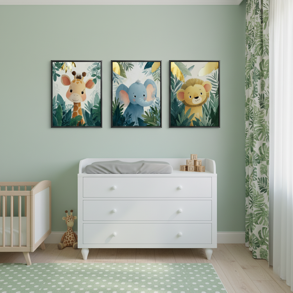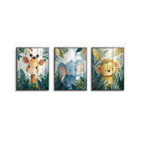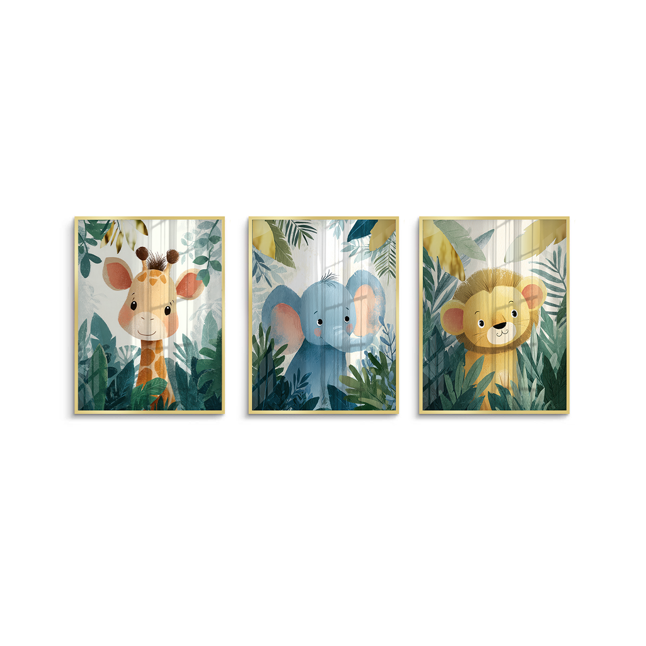 This adorable kids’ art set features a smiling giraffe, gentle elephant, and cheerful lion peeking through lush jungle leaves. With soft painted tones, it brings a playful safari charm to nurseries, playrooms, or children’s bedrooms.