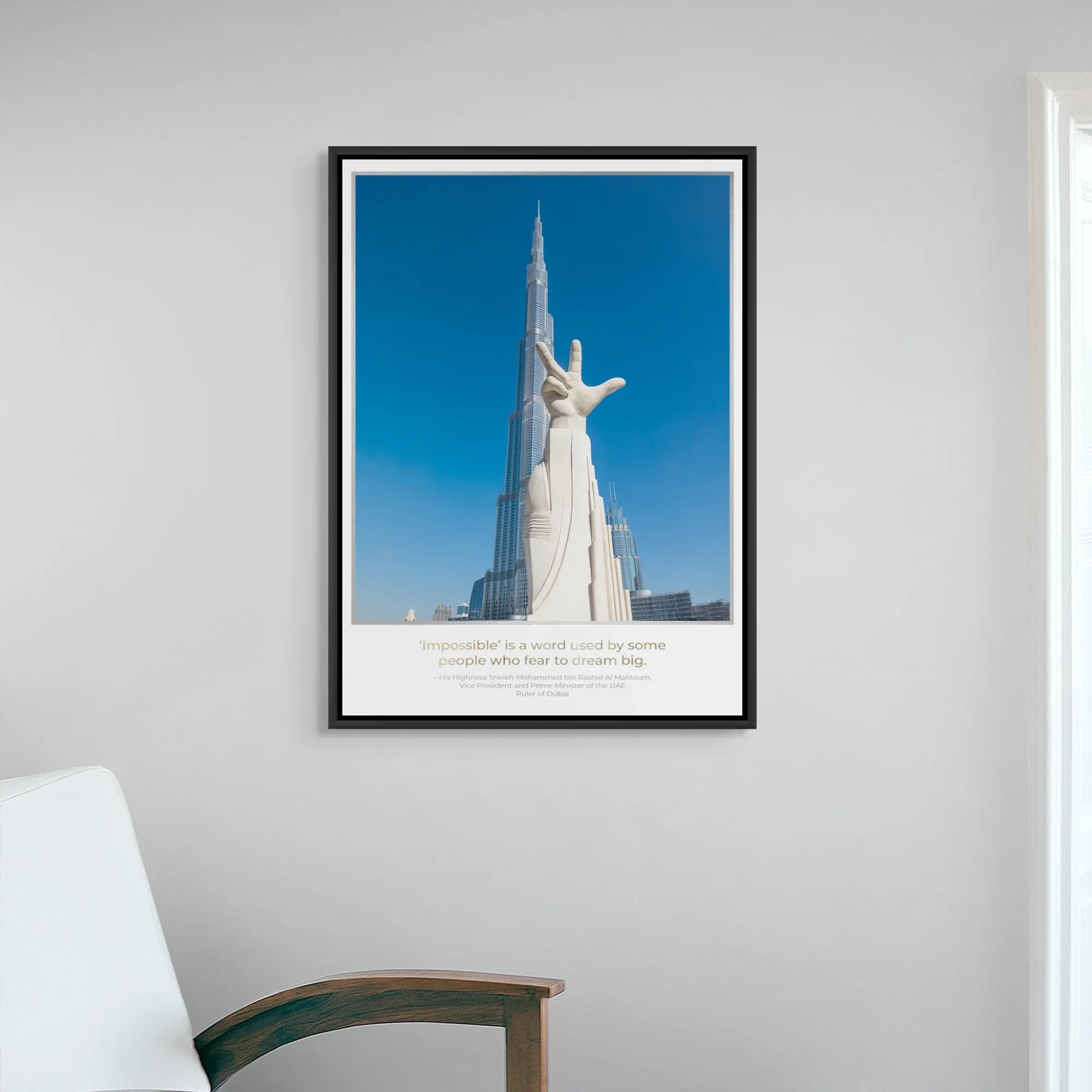 Set before Burj Khalifa and the Three-Finger Salute statue, this artwork echoes Sheikh Mohammed’s words: “‘Impossible’ is a word used by some people who fear to dream big.” A bold ode to limitless ambition.