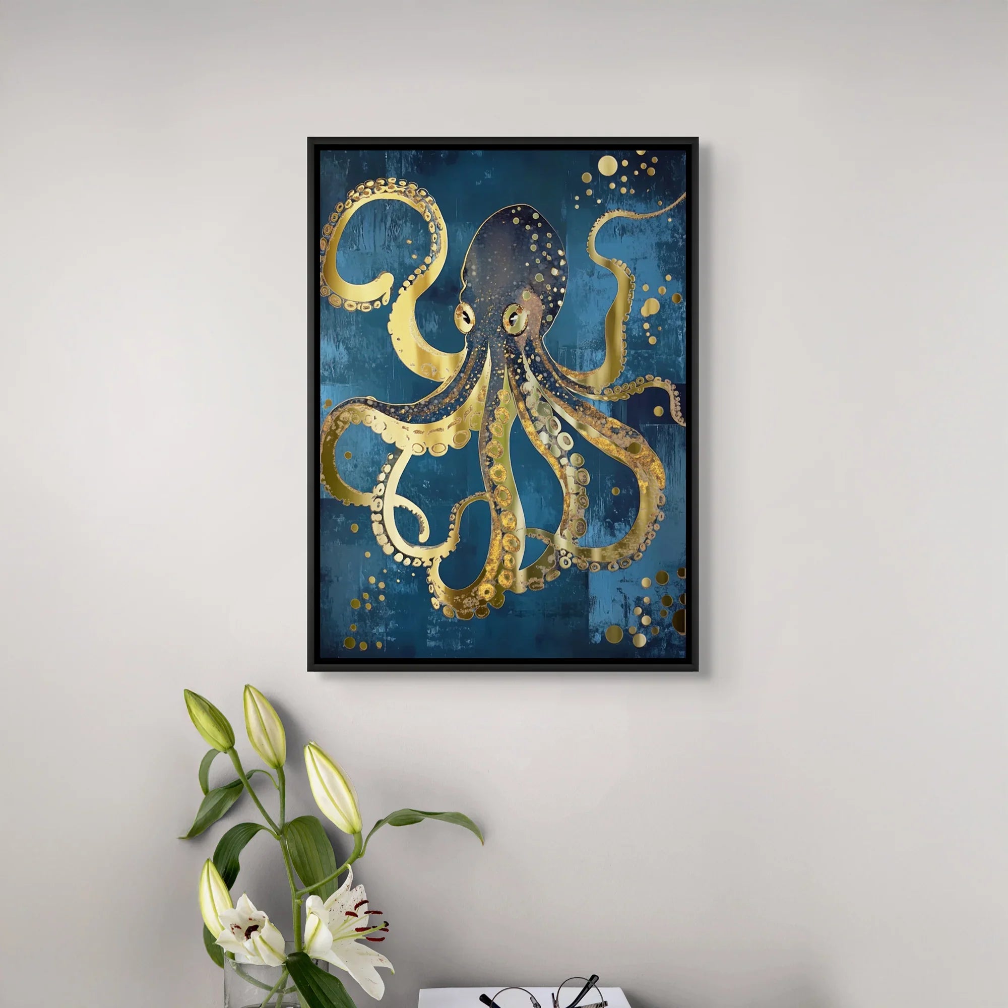 حوتان يسبحان في مياه الياقوت الأزرق المتدرجة تحت قمر ذهبي متوهج ونجوم. تُضفي القوام الغني واللمسات المعدنية منظرًا بحريًا سماويًا دراماتيكيًا مثاليًا لجدران مميزة في غرف النوم أو الصالات أو المساحات الإبداعية.