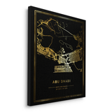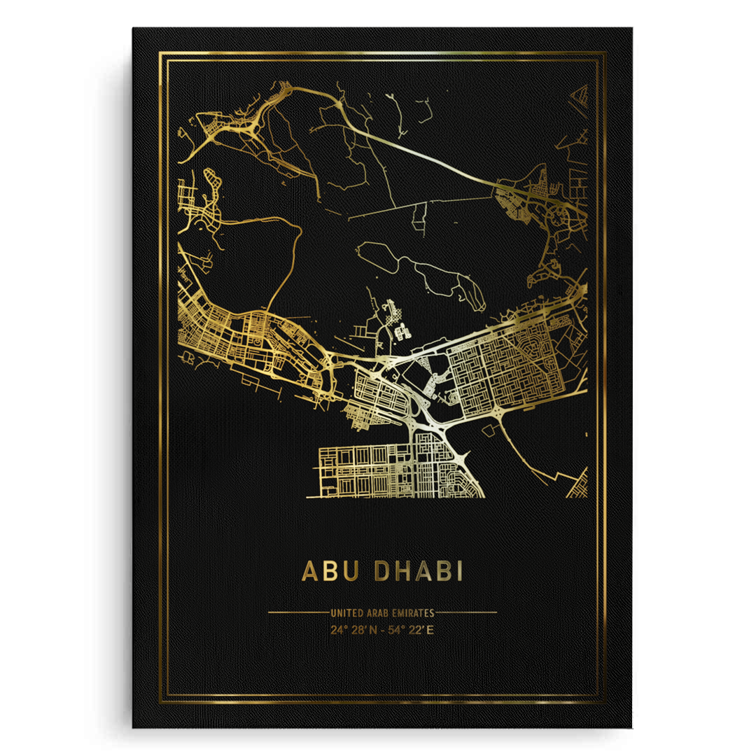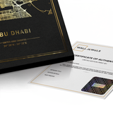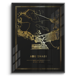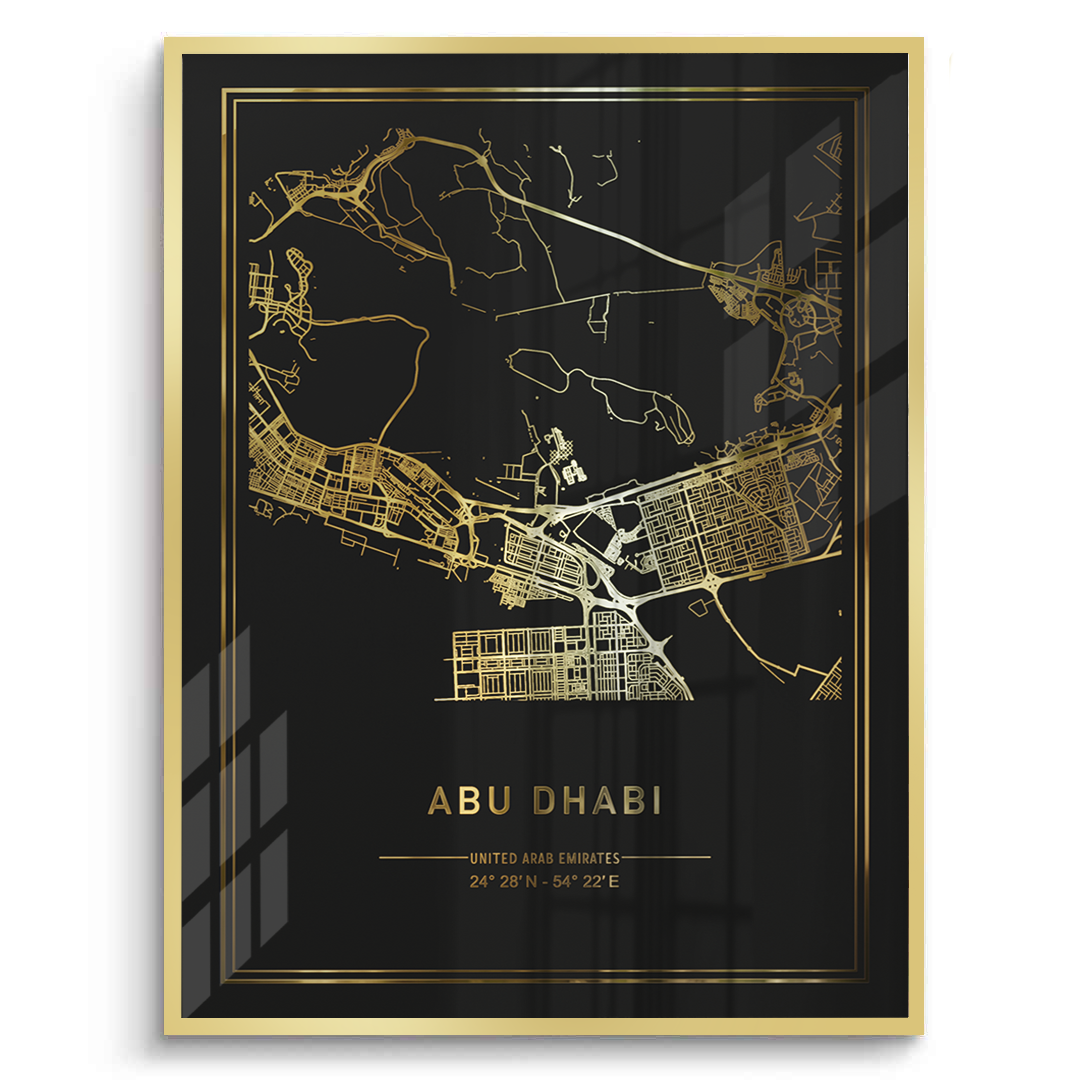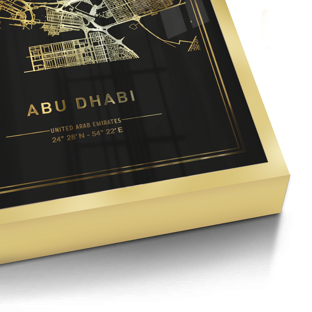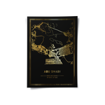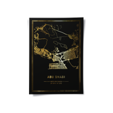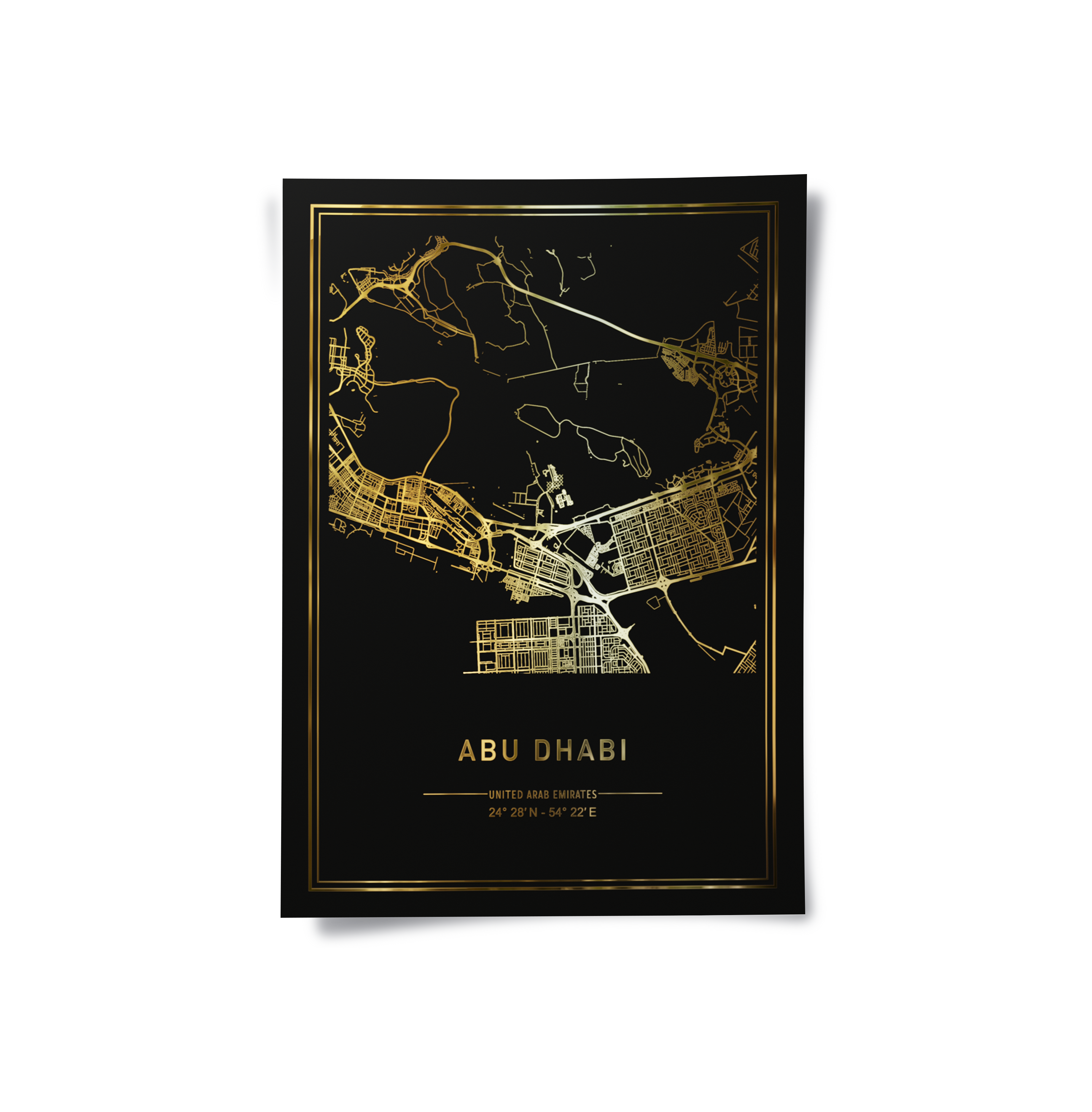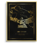A striking gold foiled city map artwork of Abu Dhabi, United Arab Emirates, capturing its unique layout in bold detail. Perfect for offices, airports, hotels, corporate spaces, or modern homes, it celebrates the Emirates’ spirit and appeals to UAE art lovers.