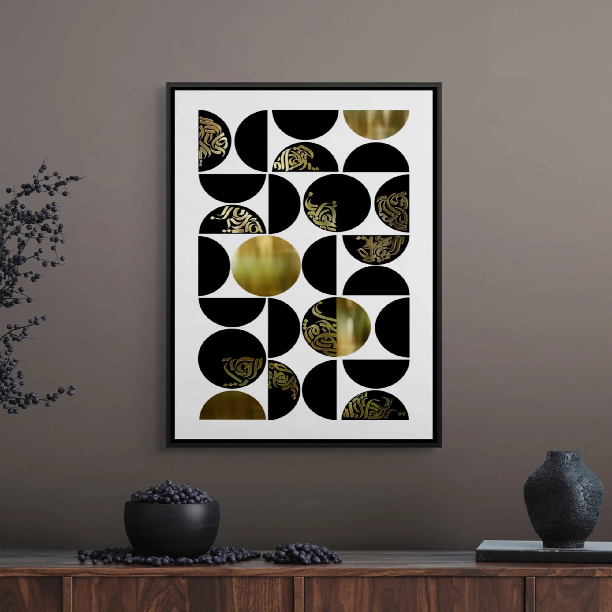 A contemporary fusion of Bauhaus geometry and deconstructed Arabic letterforms. Foiled in gold, this artwork balances bold structure with fluid calligraphic strokes — a visually arresting piece that adds movement, heritage, and design-forward style to any space.