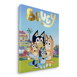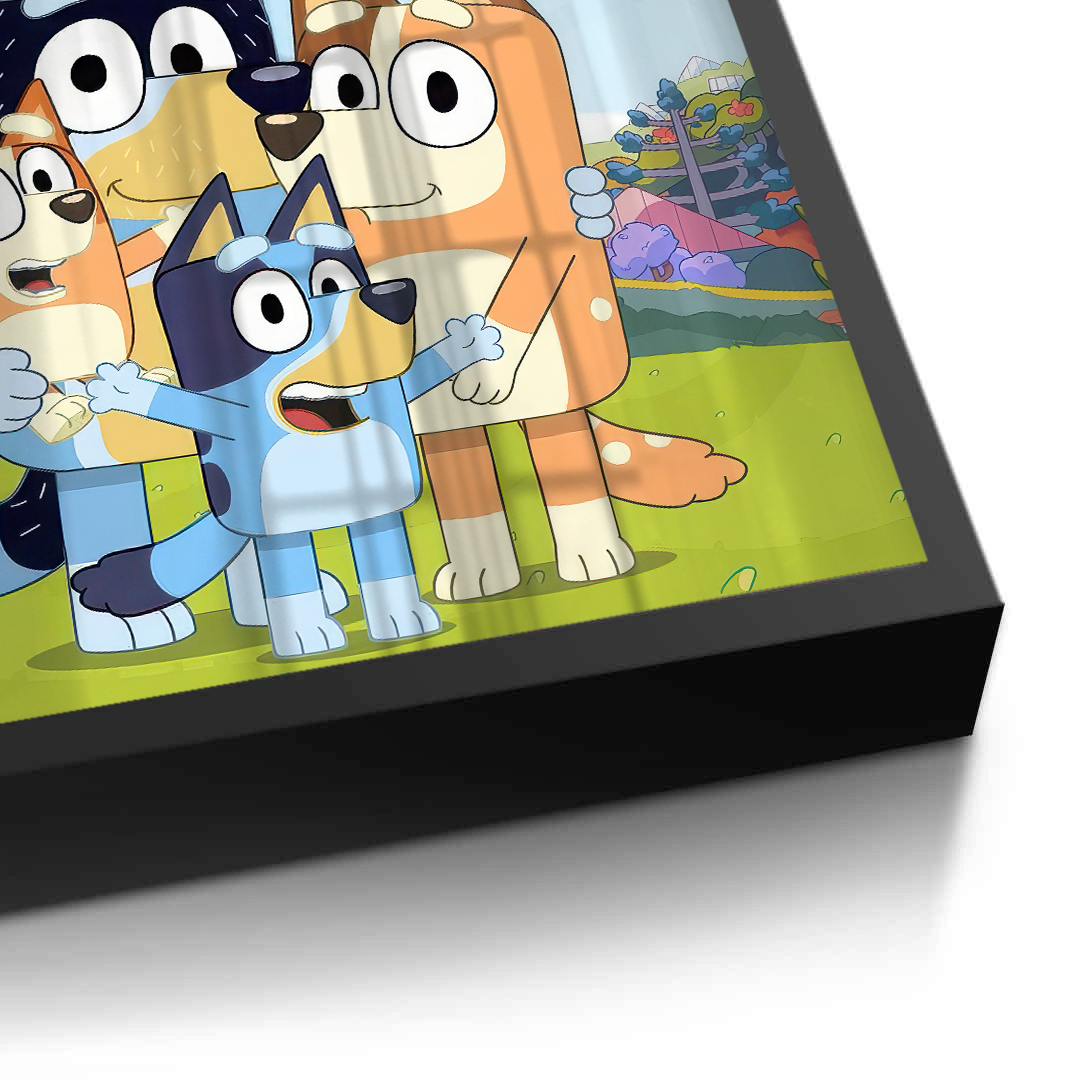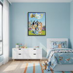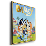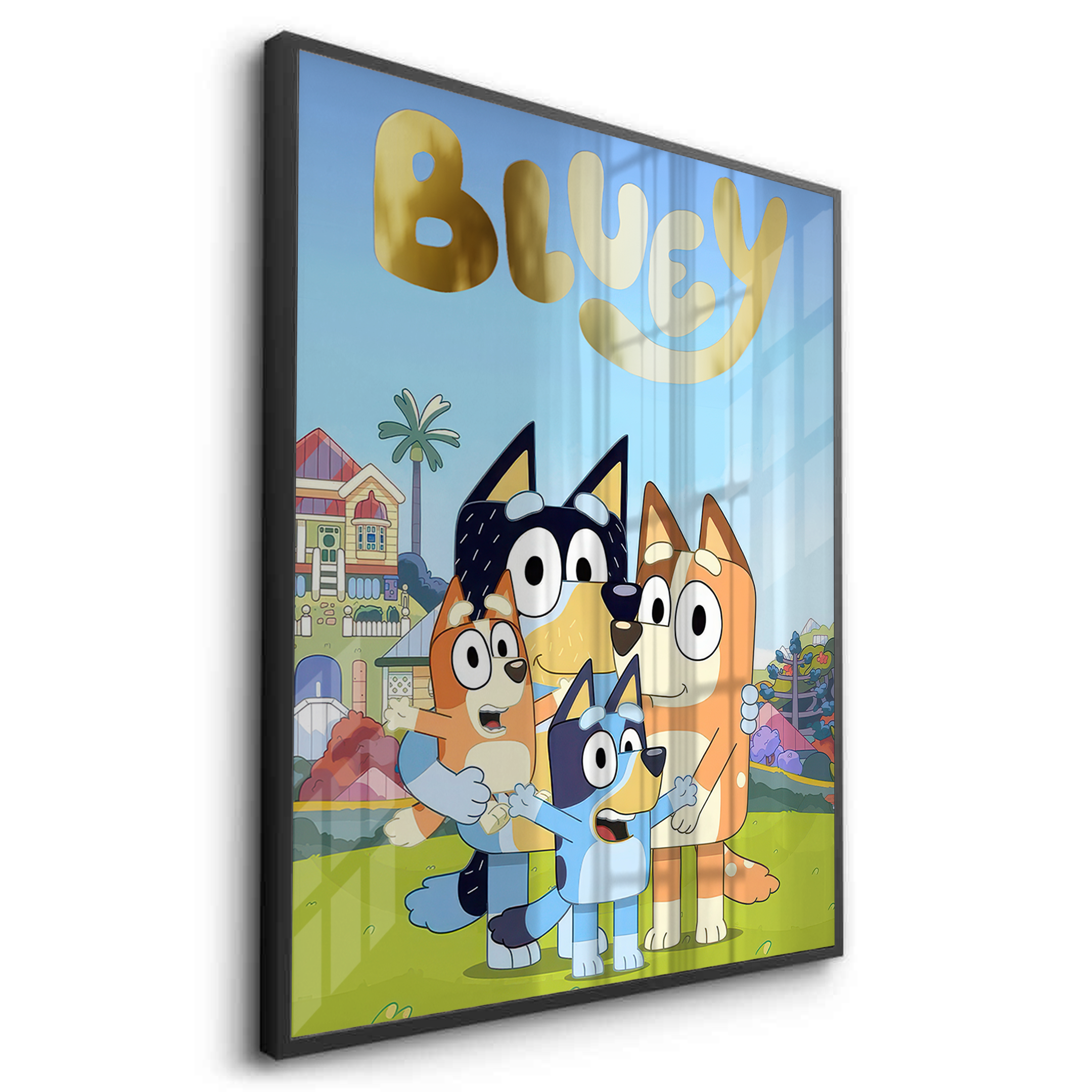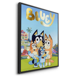 A cheerful gold-foiled artwork inspired by the popular kids’ TV show Bluey. Featuring Bluey, Bingo, and their parents in a sunny outdoor scene, it celebrates family, laughter, and everyday adventures - a perfect piece to brighten children’s spaces and playrooms.