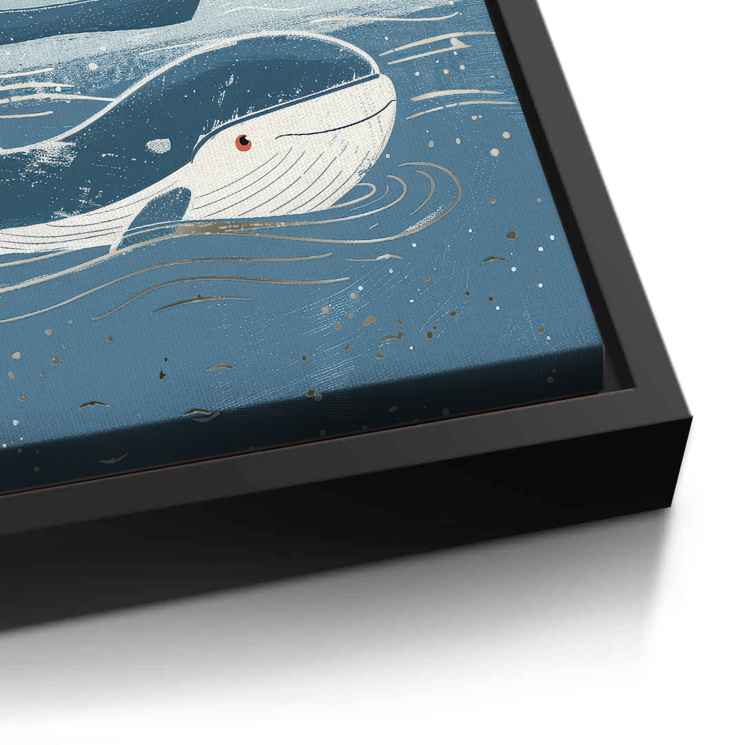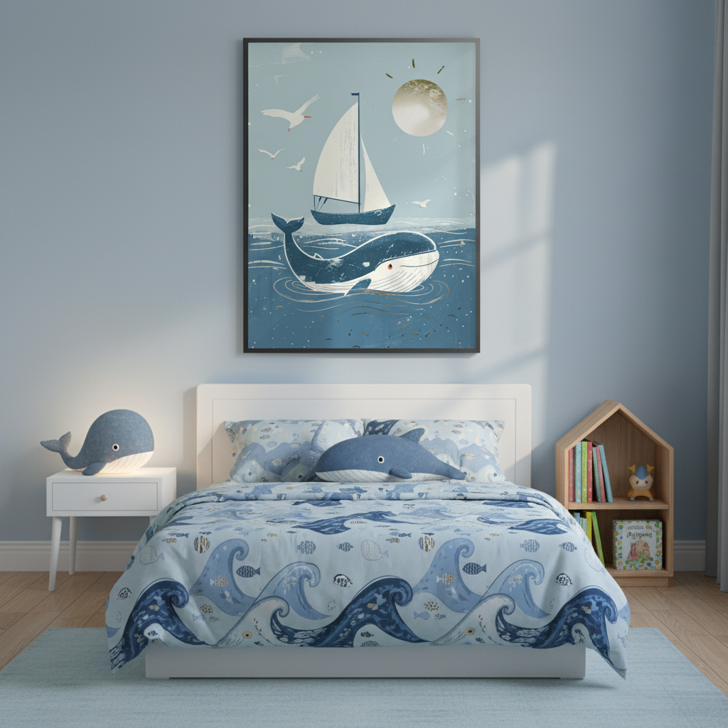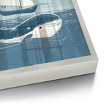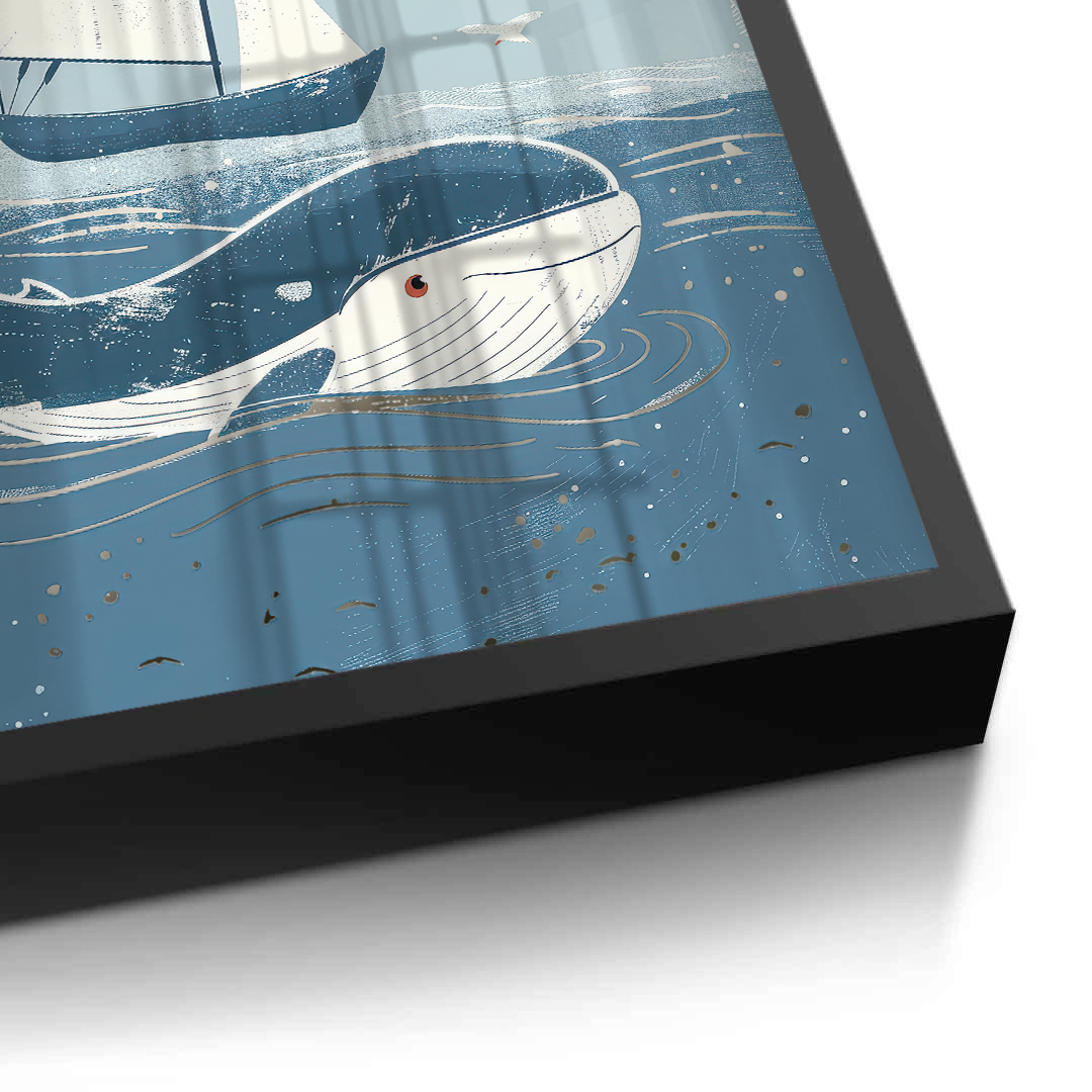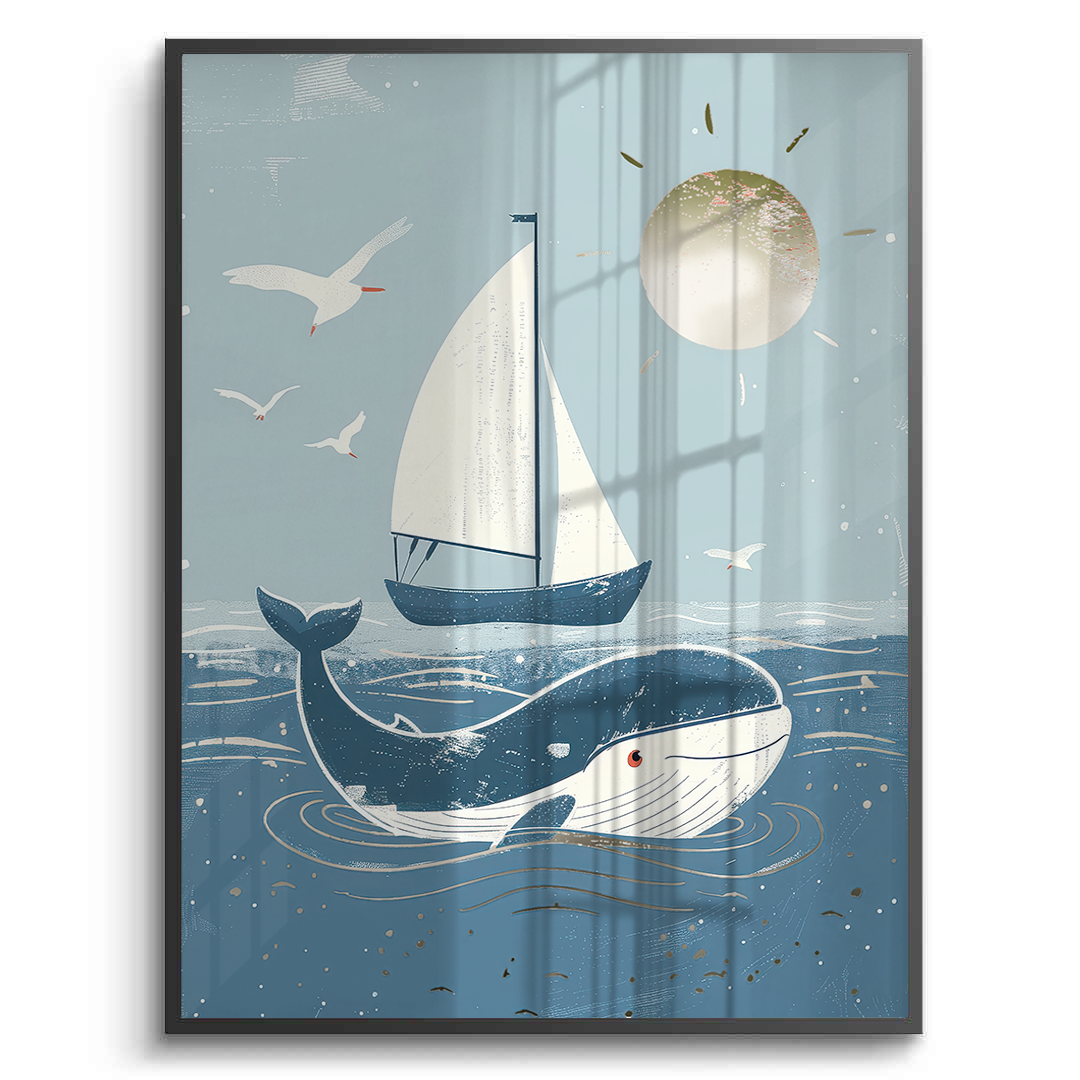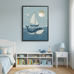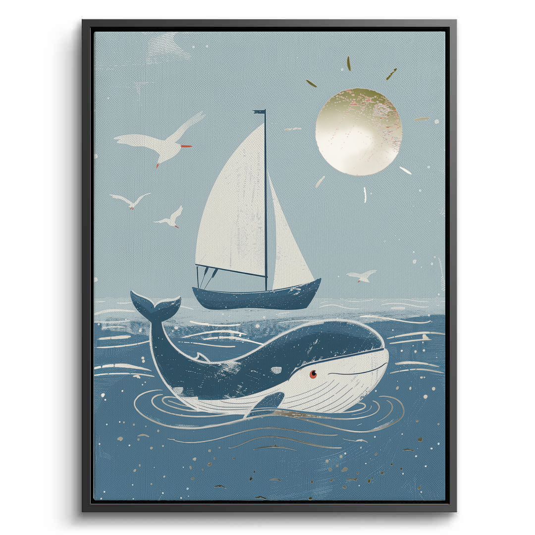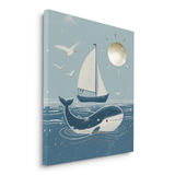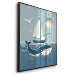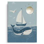 A serene ocean artwork featuring a gentle whale beside a sailboat under a soft sun, detailed with silver foiling for a glimmering sea effect. Perfect for kids’ spaces or beach-inspired rooms, adding calm coastal charm and imagination.