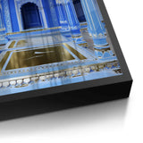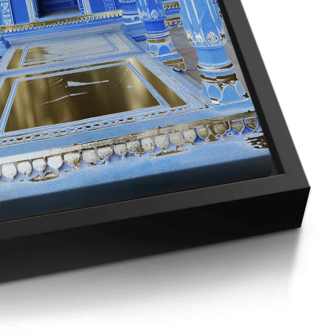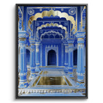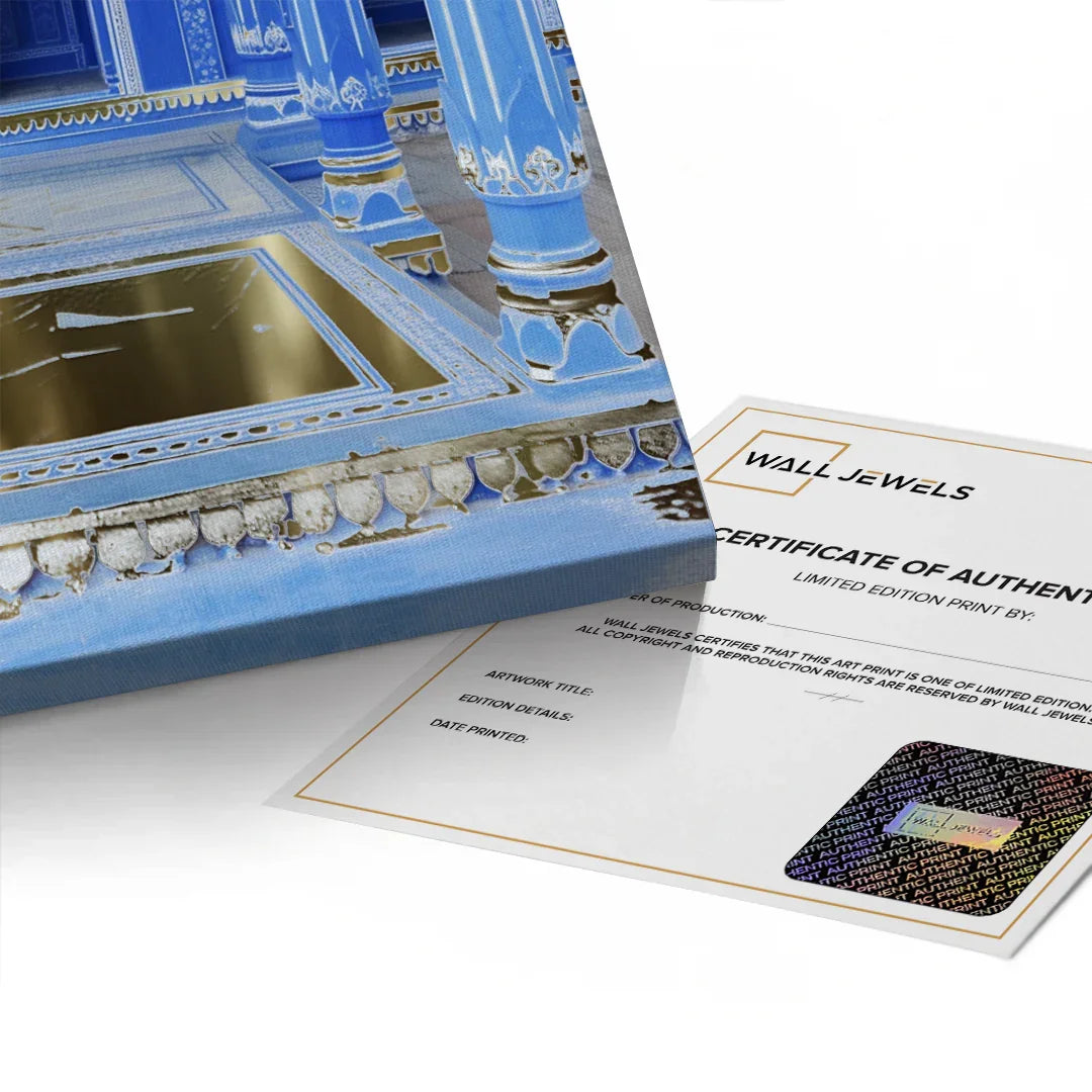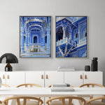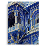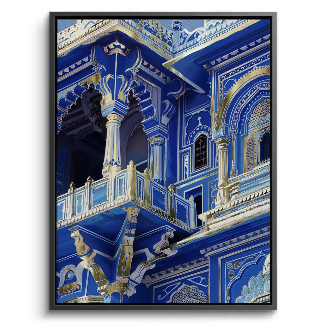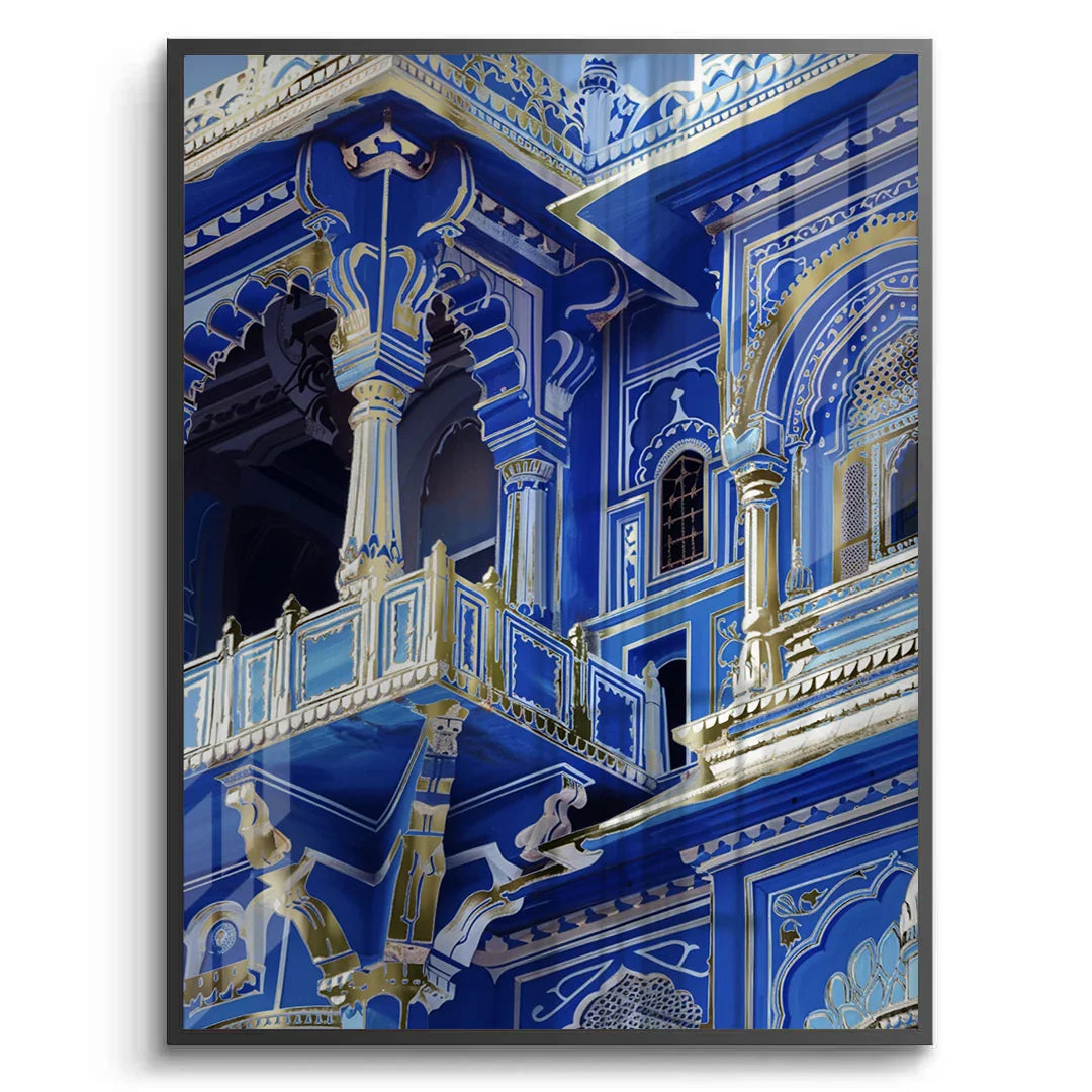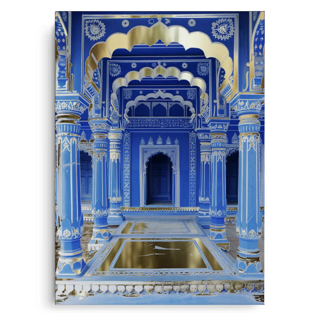 An opulent pairing of deep cobalt architecture and gold foil accents, echoing imperial grandeur. The majestic arches and intricate detailing reflect regal elegance with a modern gaze. A timeless statement for luxurious, traditional interiors.