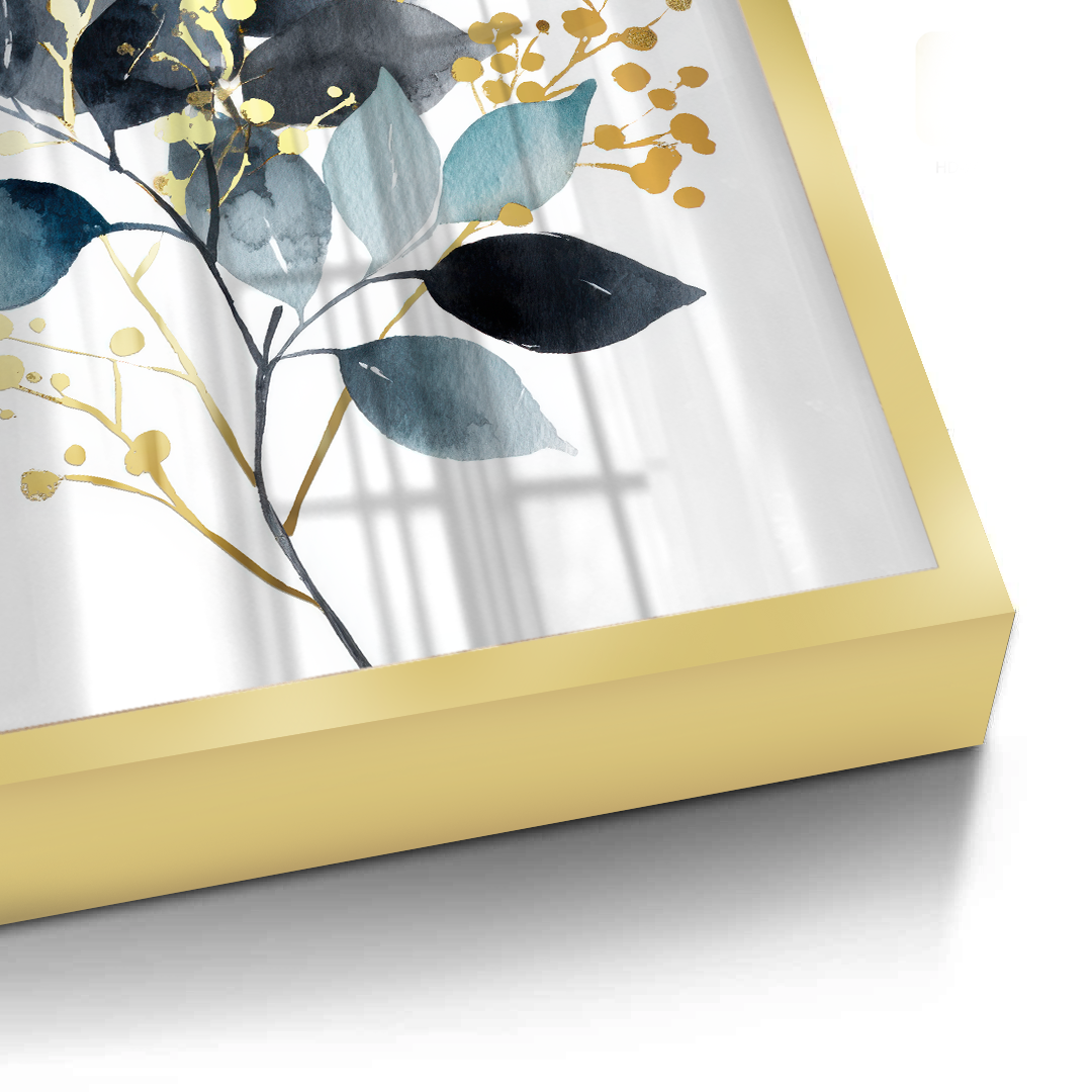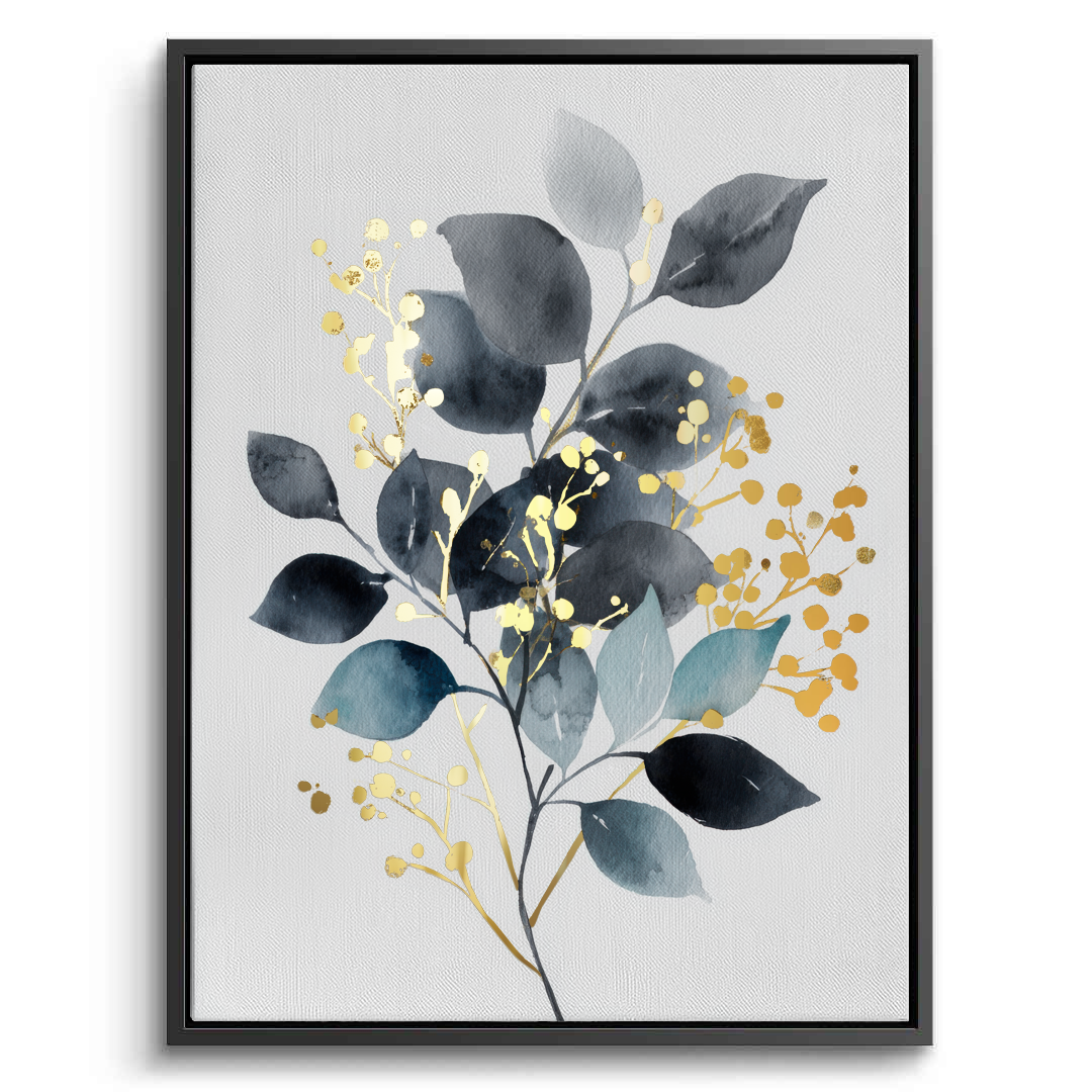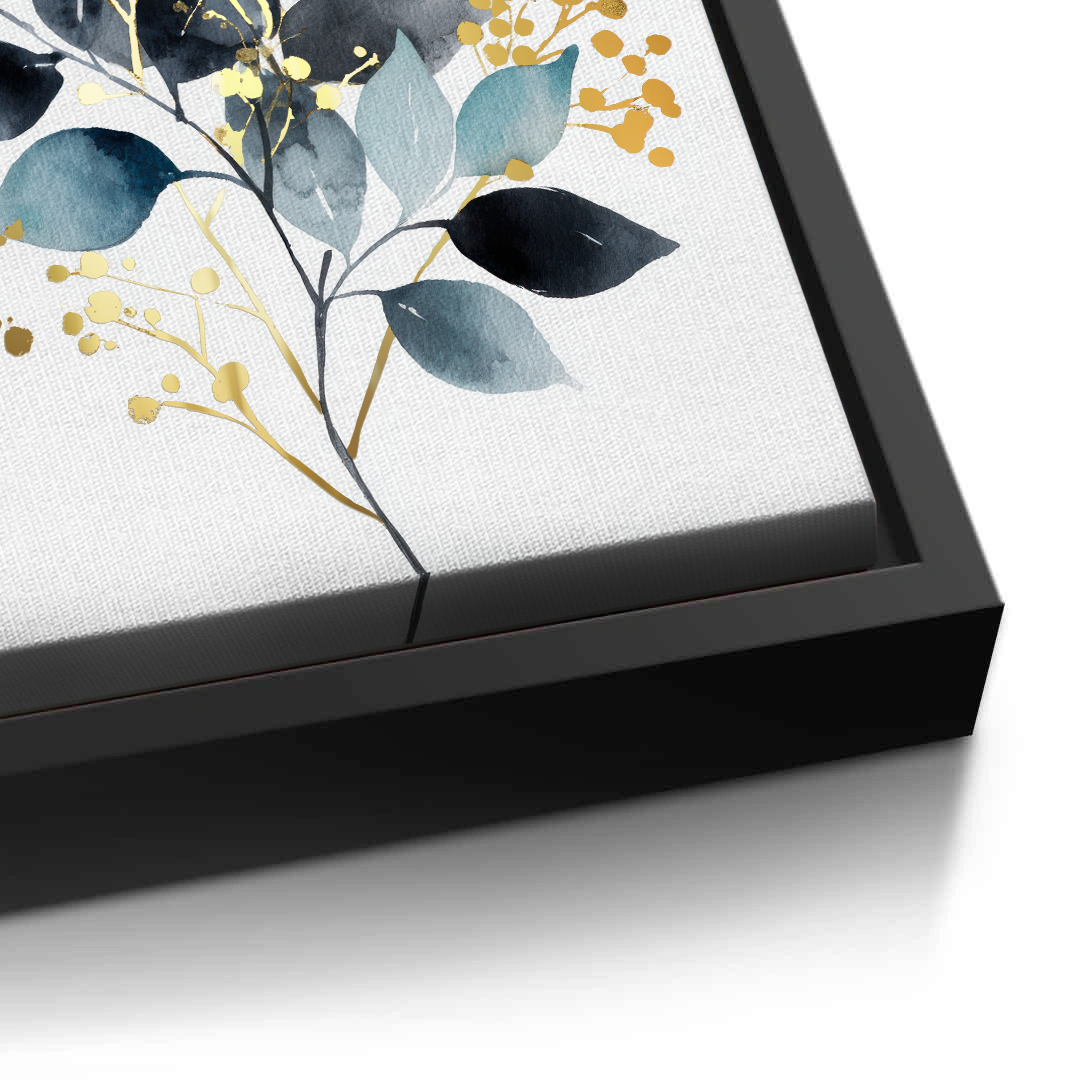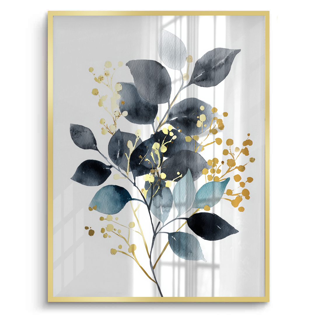 A botanical artwork featuring layered leaves in deep midnight tones, balanced by soft neutrals and spacing. Gold foiling adds luminous highlights and contrast, creating an elegant statement ideal for living rooms, bedrooms, offices, and contemporary interior spaces.