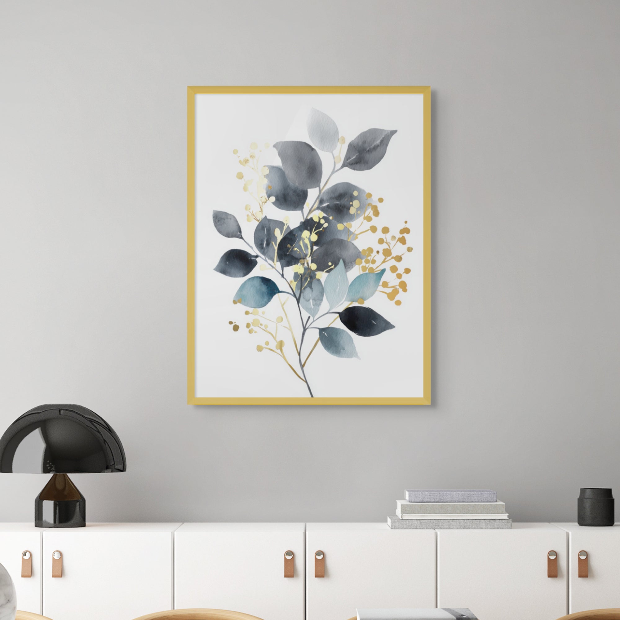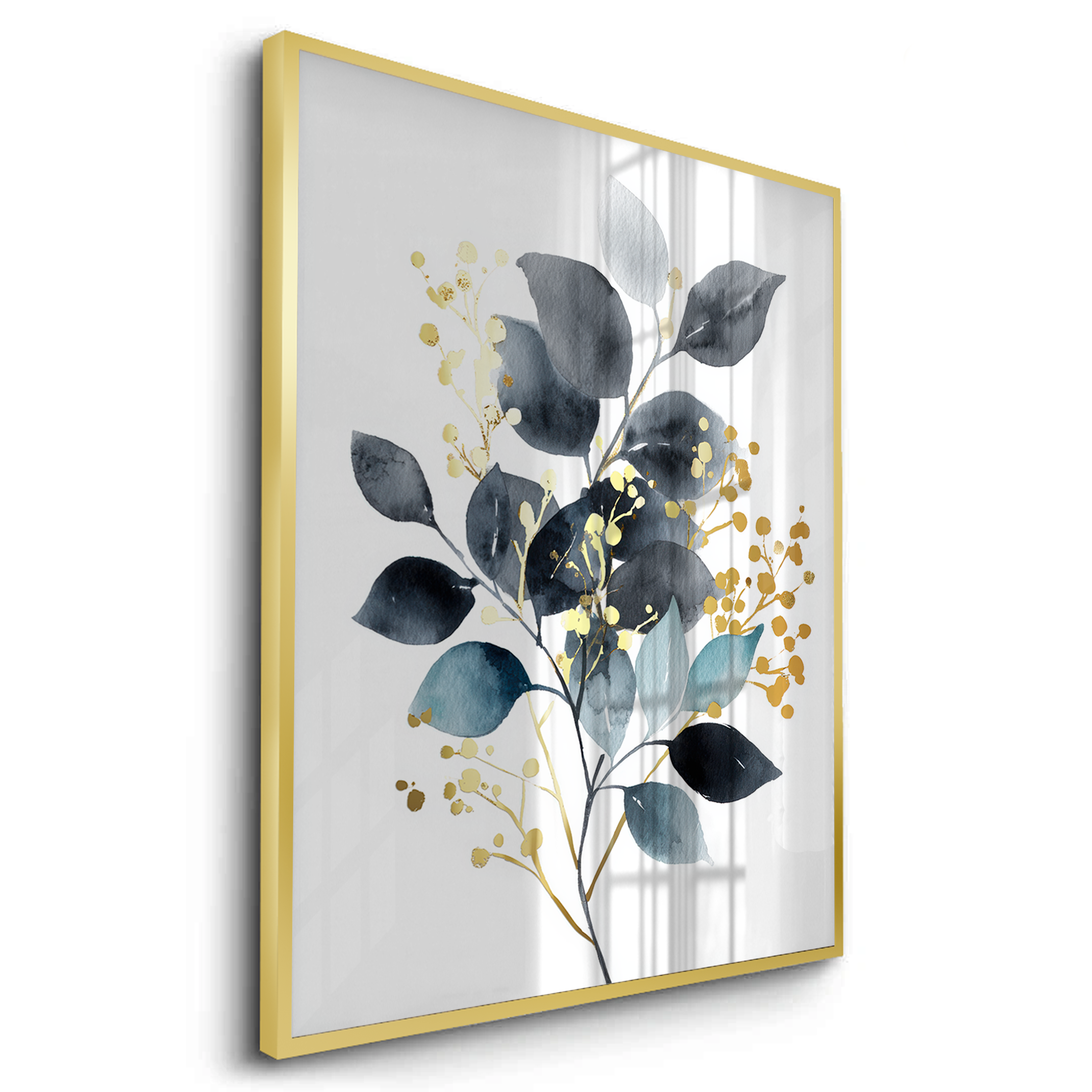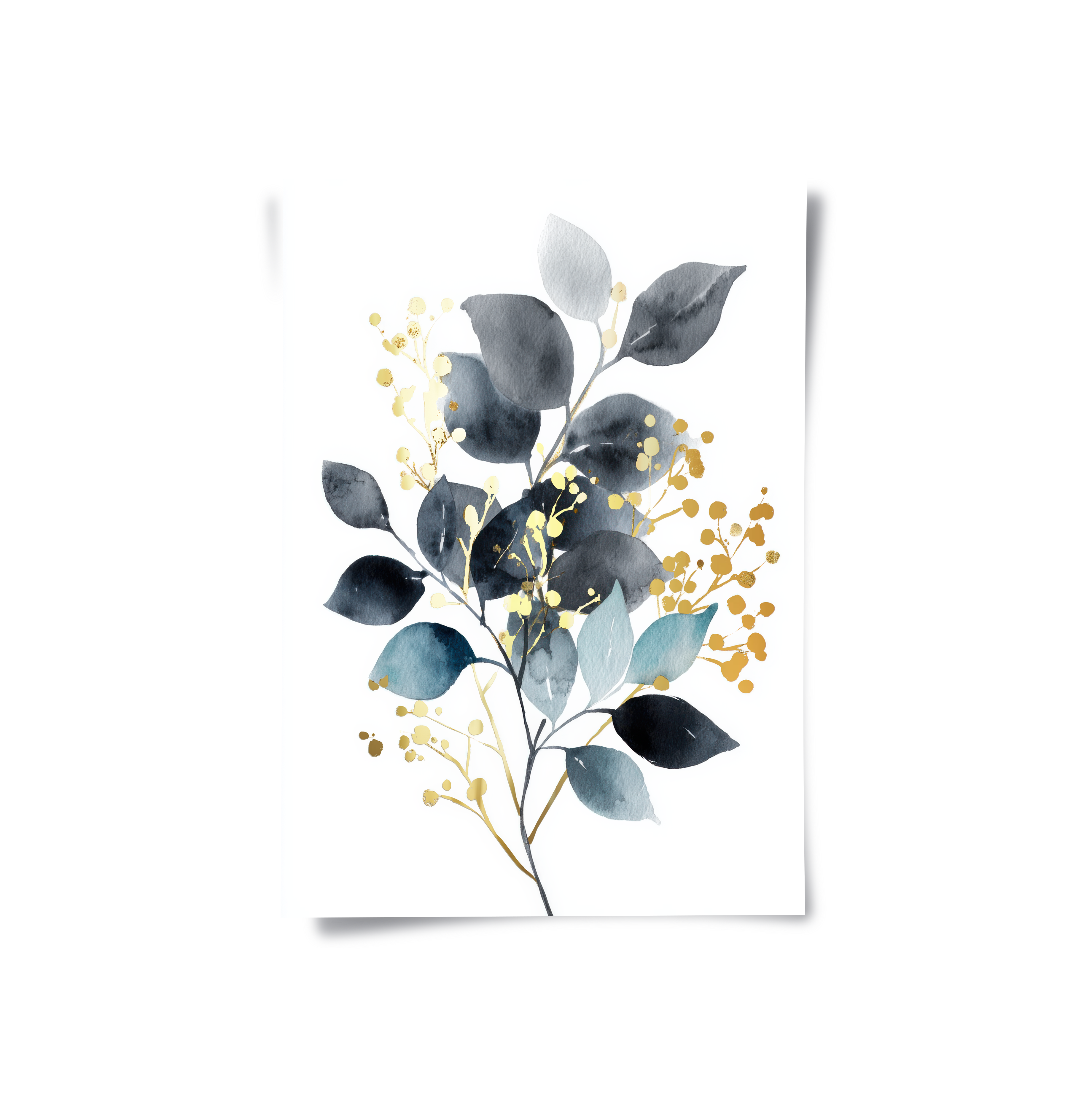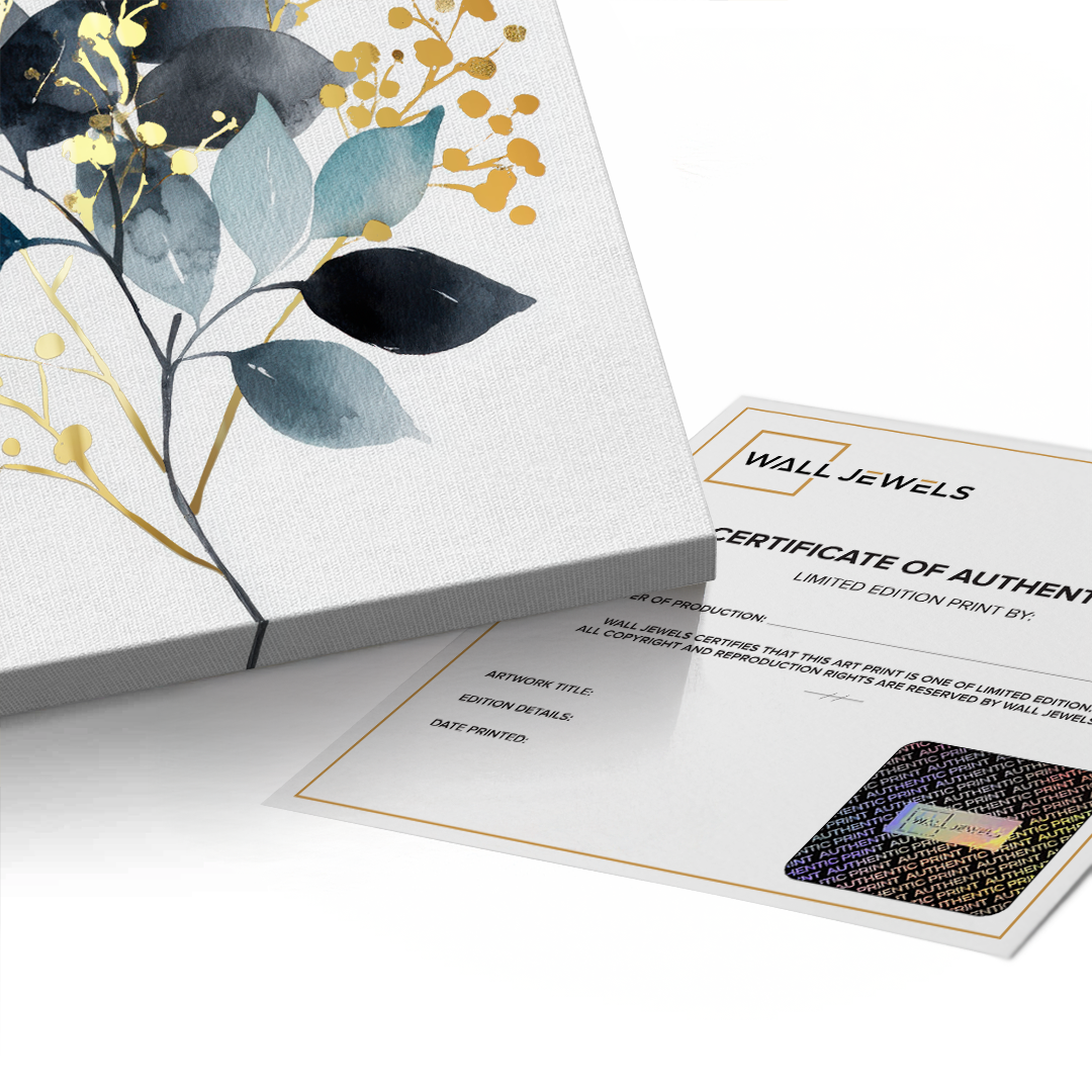 A botanical artwork featuring layered leaves in deep midnight tones, balanced by soft neutrals and spacing. Gold foiling adds luminous highlights and contrast, creating an elegant statement ideal for living rooms, bedrooms, offices, and contemporary interior spaces.