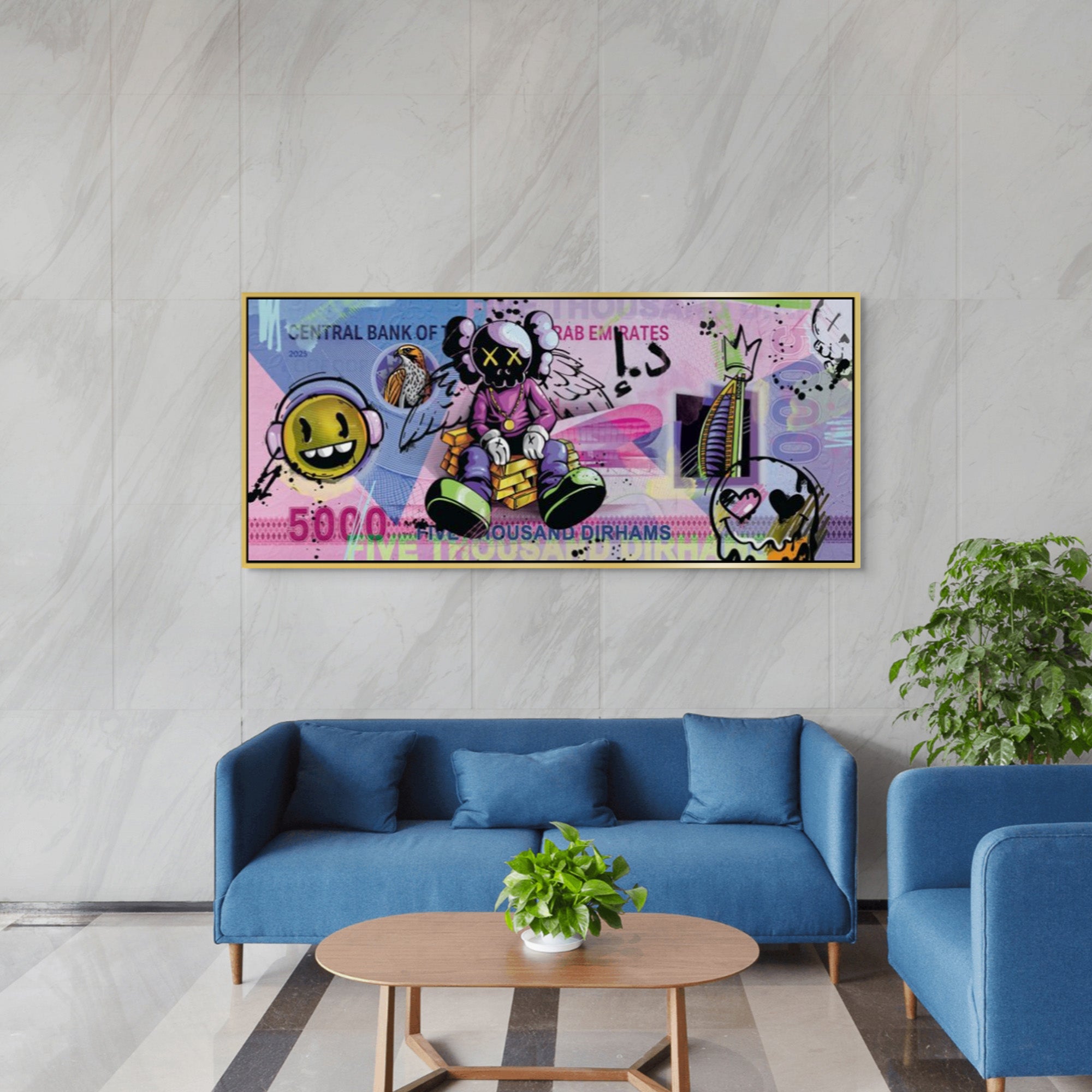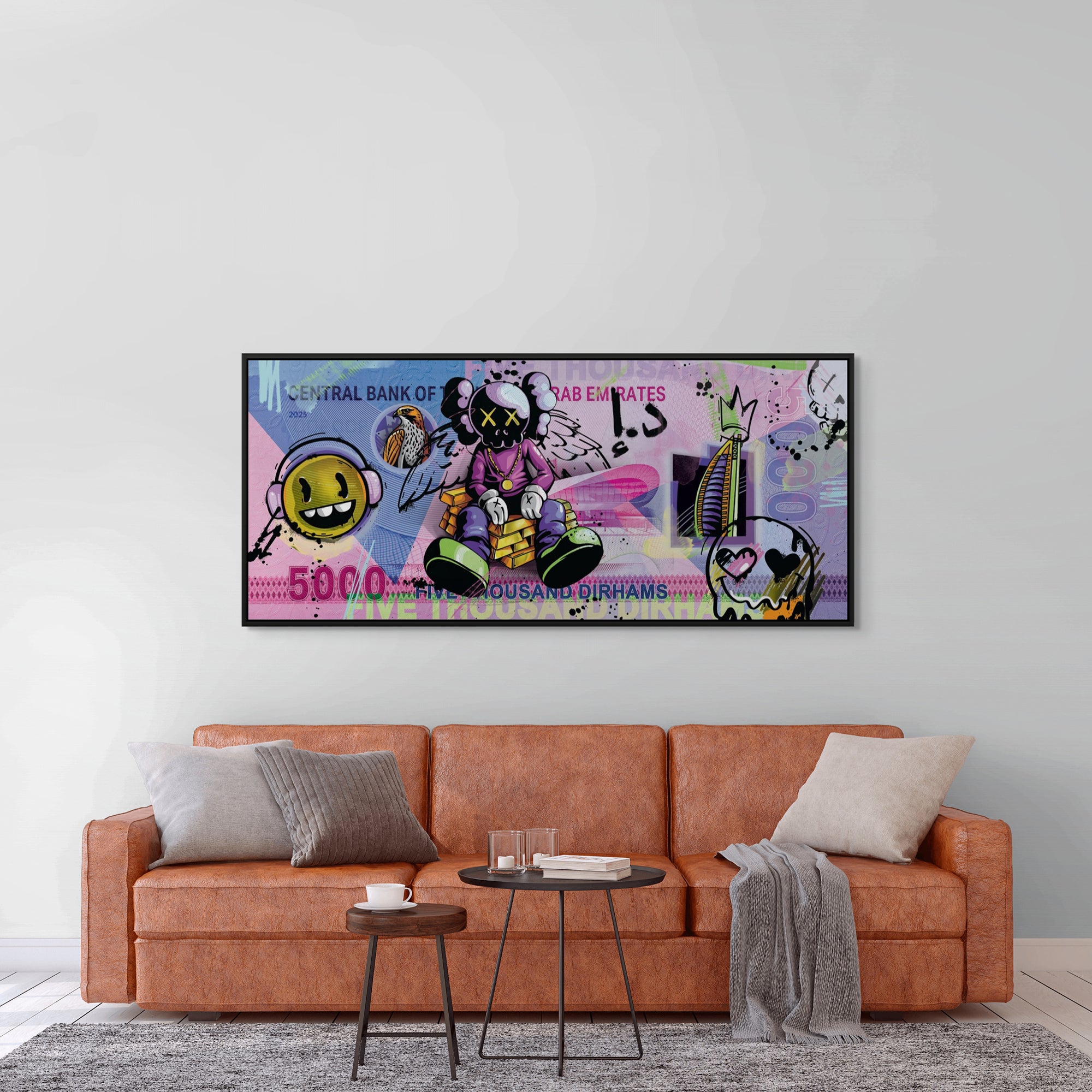 A bold reimagination of the AED 5000 note through a KAWS-inspired pop art lens. This custom artwork fuses local currency with global street culture—playful, rebellious, and instantly iconic. Ideal for eclectic, urban, or contemporary interiors that celebrate bold expression.