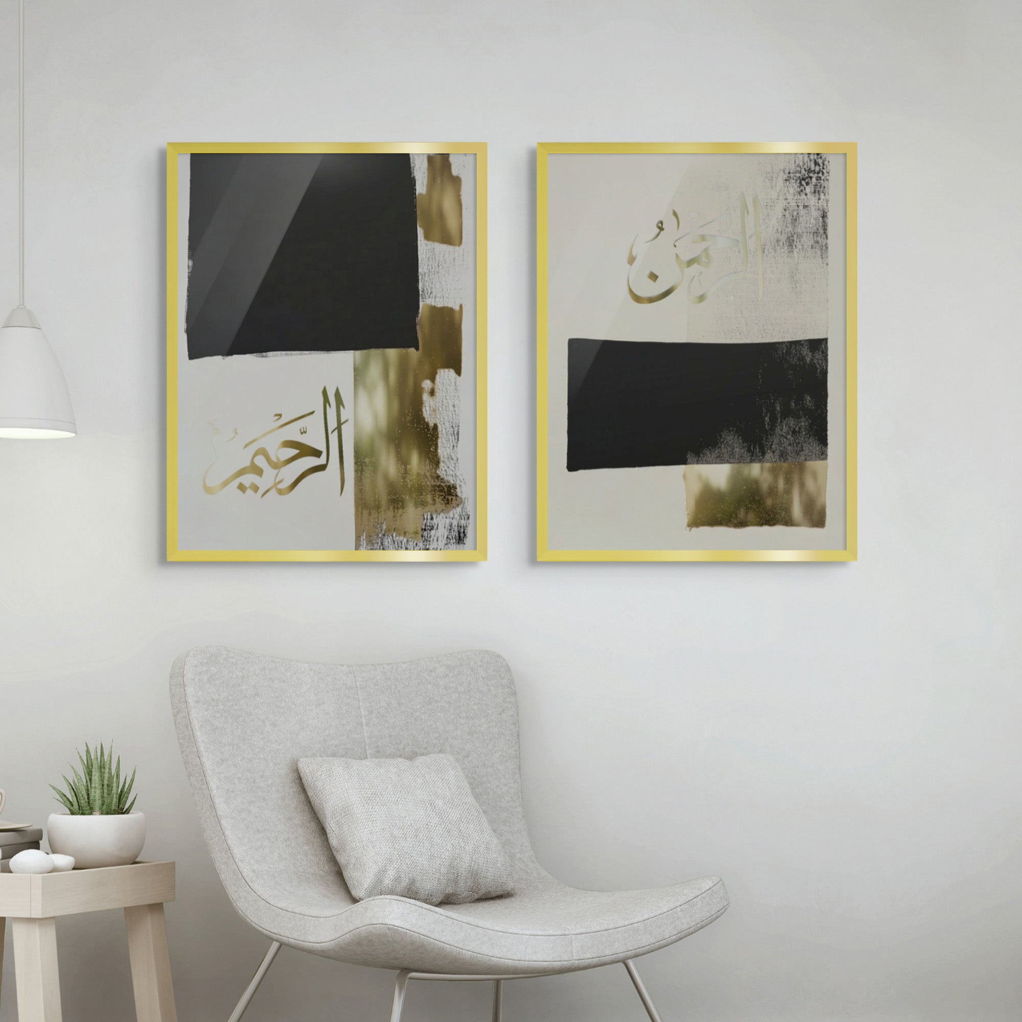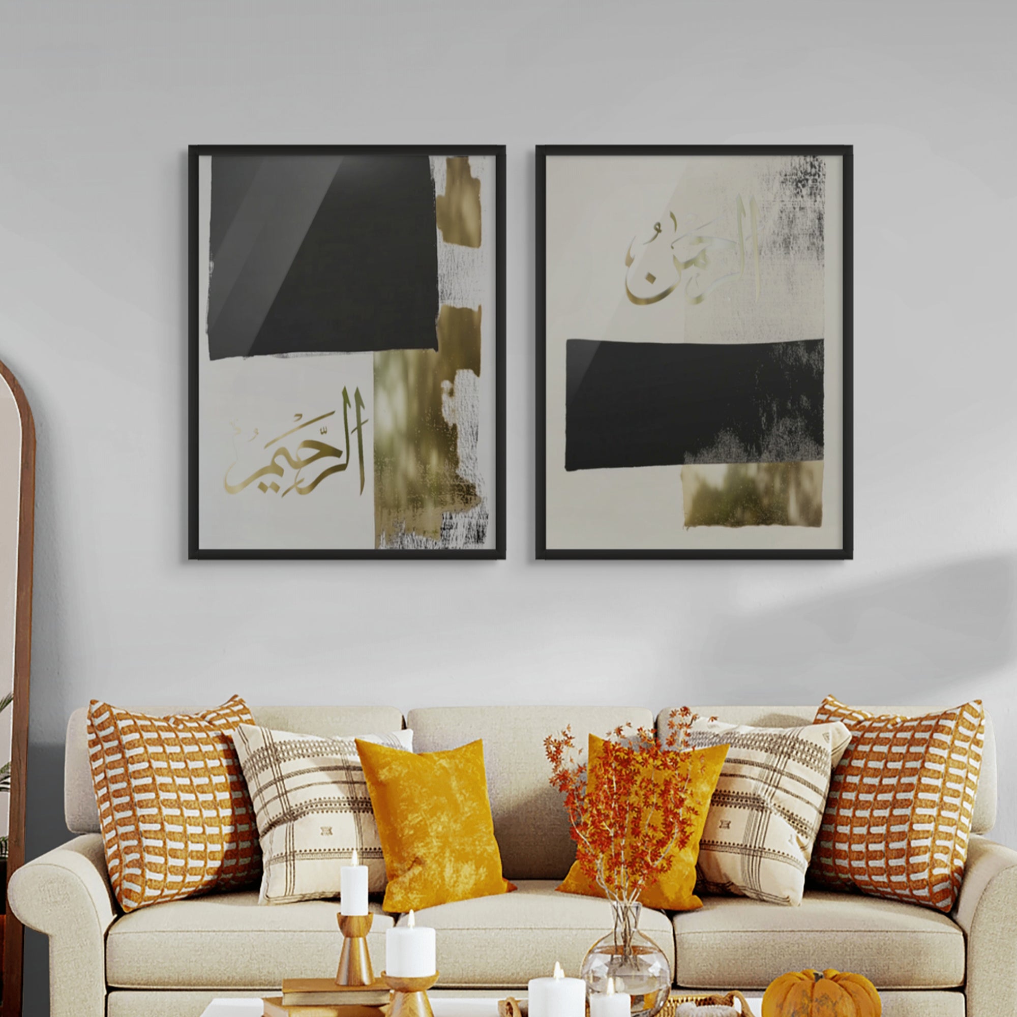 Celebrate the beauty of Allah’s mercy with this elegant set featuring “Ar-Rahman” and “Ar-Raheem” in radiant gold foiled Arabic calligraphy. Bold black strokes meet textured contrasts for a refined finish. Perfect for living rooms, entryways, or prayer areas.