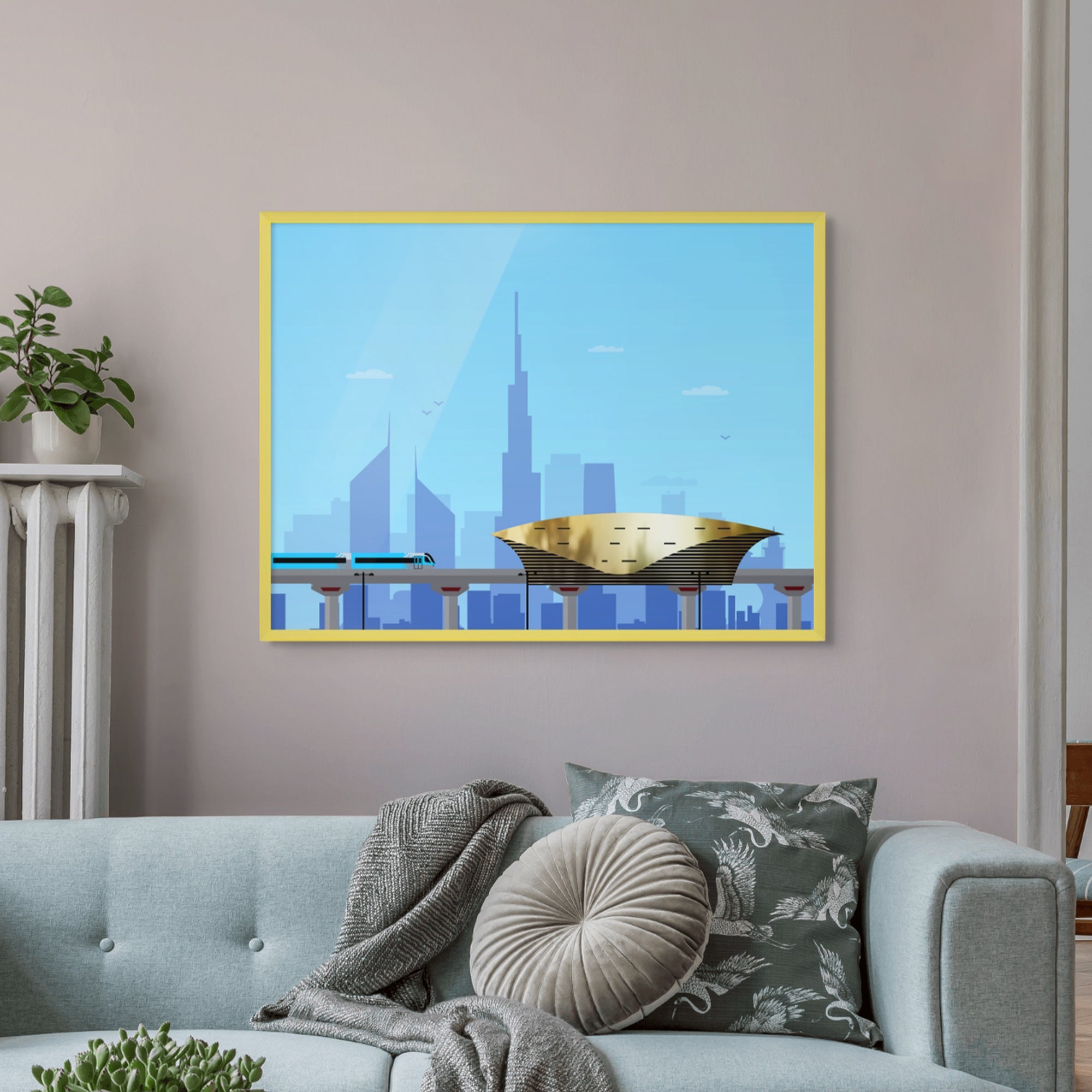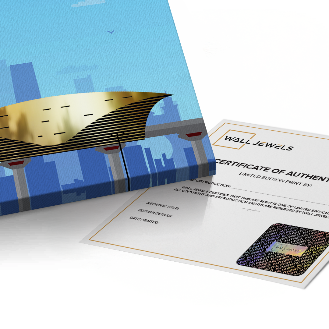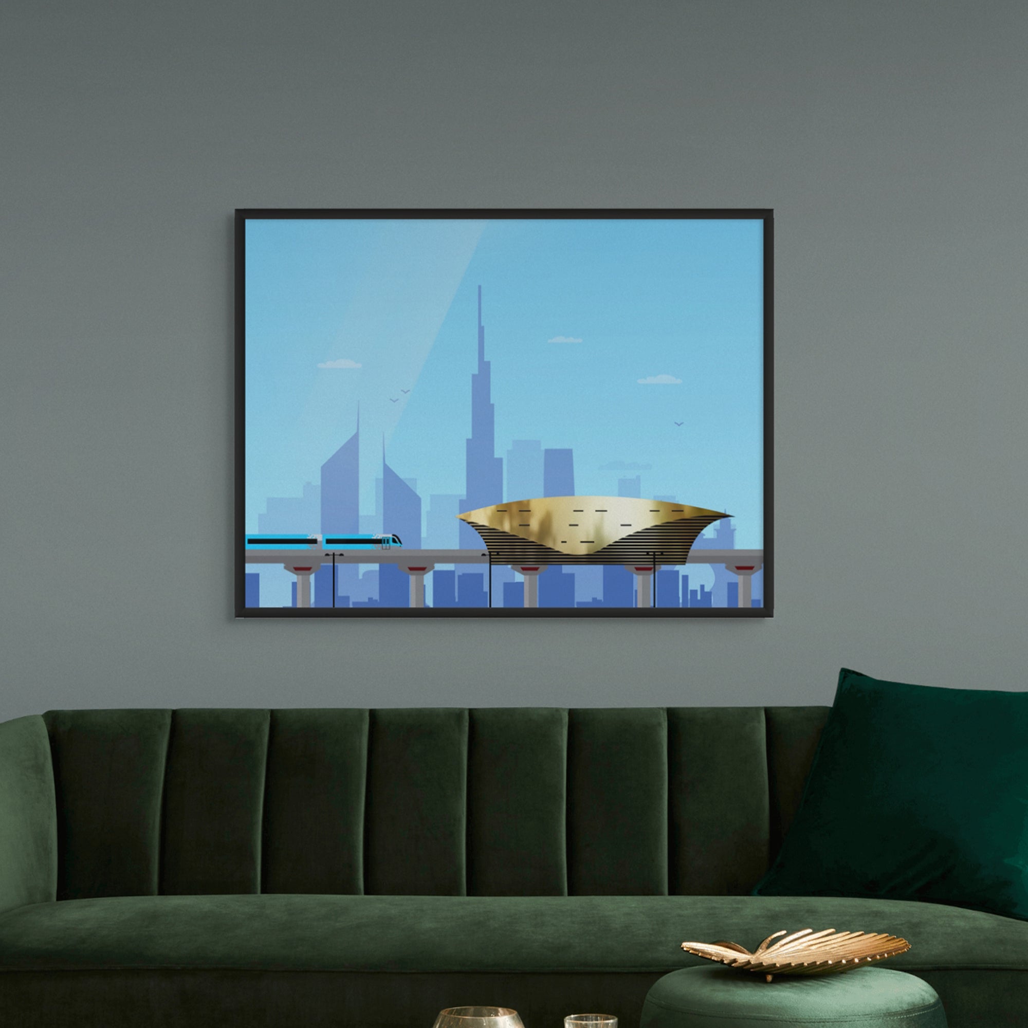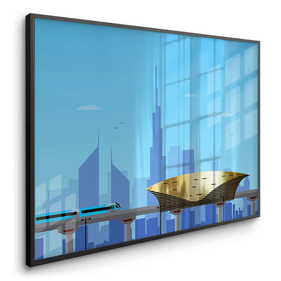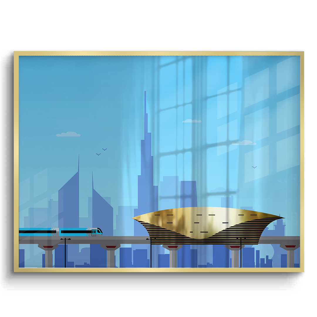 A vibrant gold-foiled artwork of Dubai’s golden metro station and sleek skyline. Combining architectural detail with urban motion, it makes a striking statement for hallways, lounges, or modern homes with a love for city life.