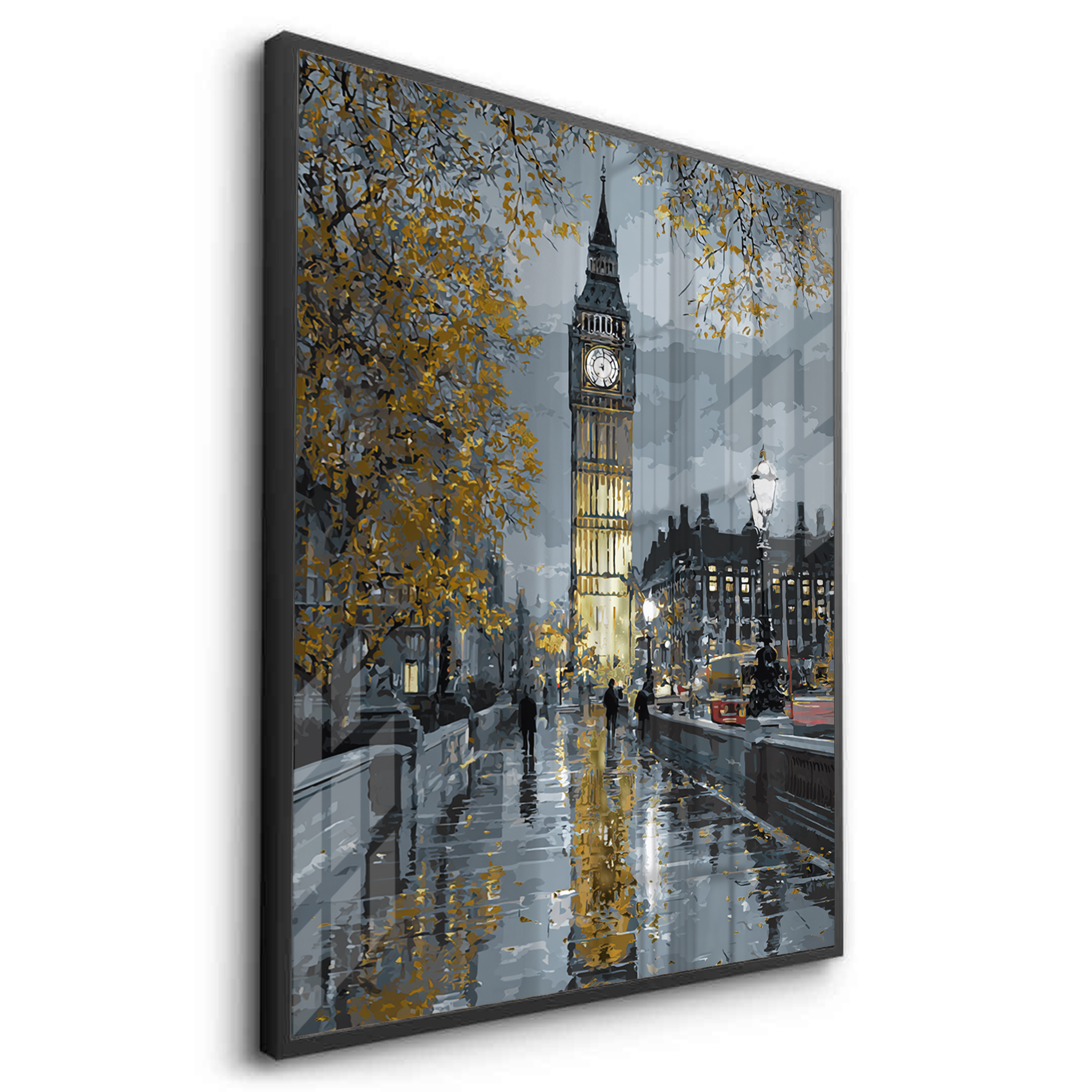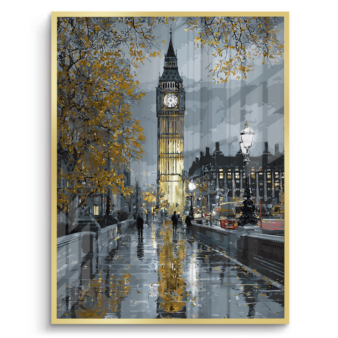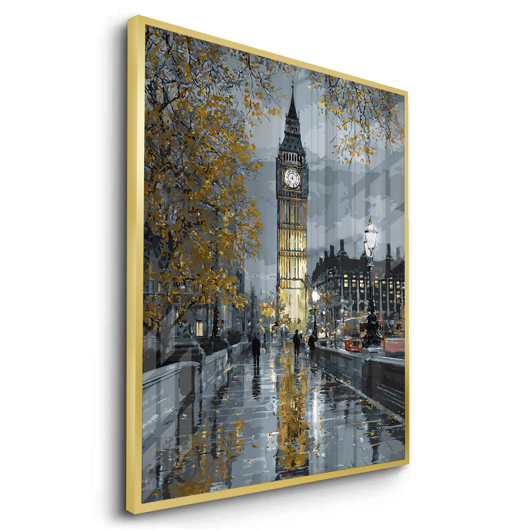 A striking gold-foiled artwork of Big Ben surrounded by autumn hues and glowing reflections. Its refined style makes it an eye-catching centerpiece for contemporary living rooms, workspaces, or interiors inspired by global landmarks.