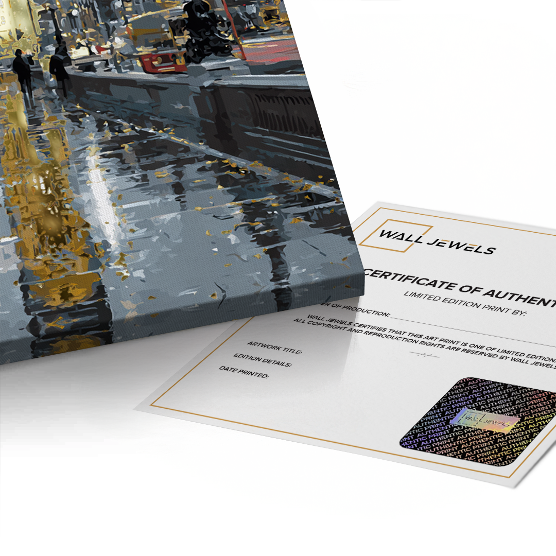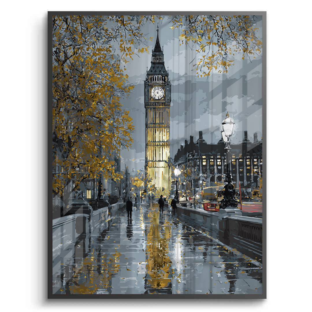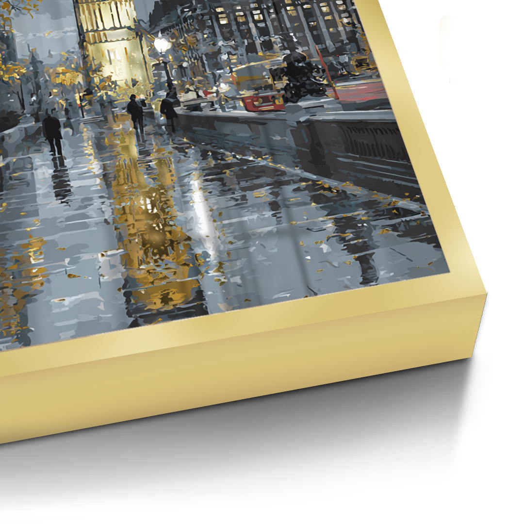 A striking gold-foiled artwork of Big Ben surrounded by autumn hues and glowing reflections. Its refined style makes it an eye-catching centerpiece for contemporary living rooms, workspaces, or interiors inspired by global landmarks.