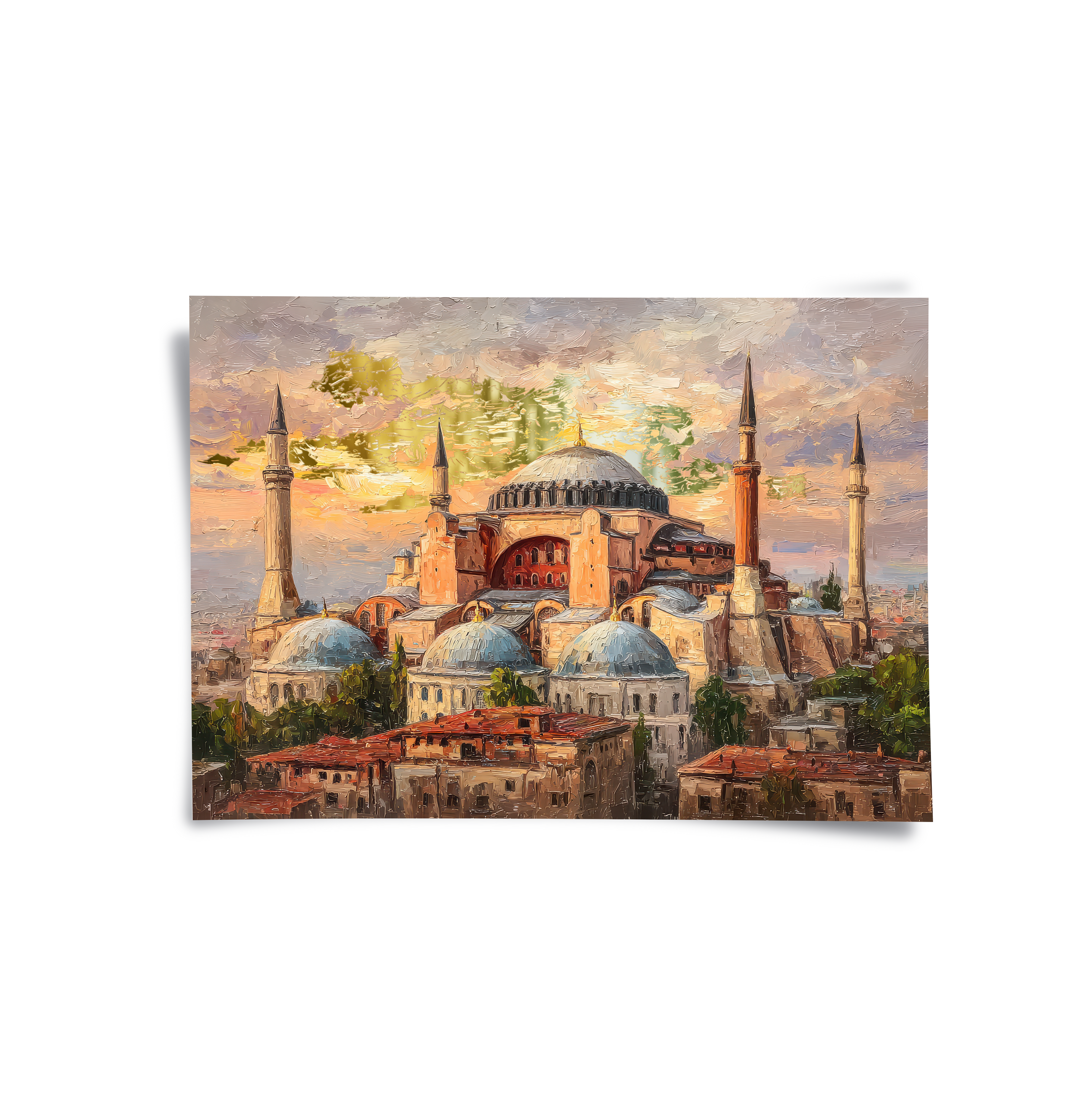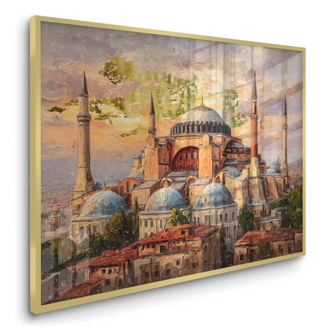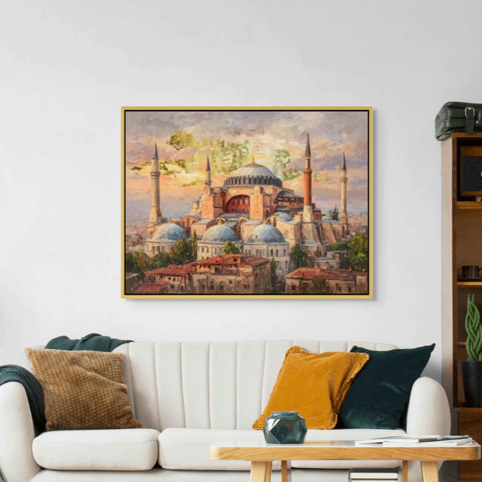 A gold-foiled depiction of Istanbul’s Hagia Sophia, glowing beneath a radiant sunset sky. This timeless artwork celebrates history and architecture, making it a stunning addition to living rooms, offices, or homes styled with cultural elegance.