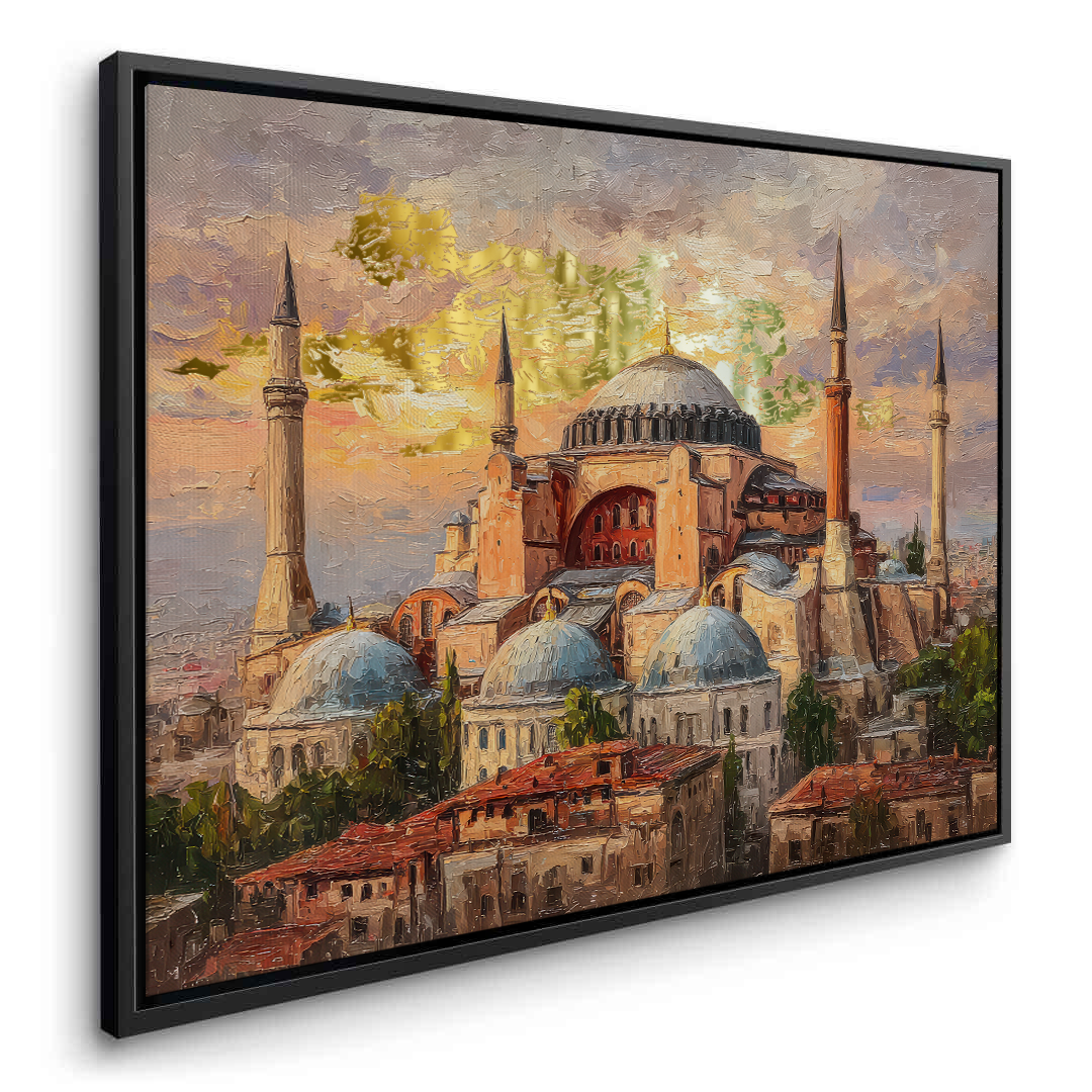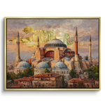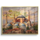 A gold-foiled depiction of Istanbul’s Hagia Sophia, glowing beneath a radiant sunset sky. This timeless artwork celebrates history and architecture, making it a stunning addition to living rooms, offices, or homes styled with cultural elegance.