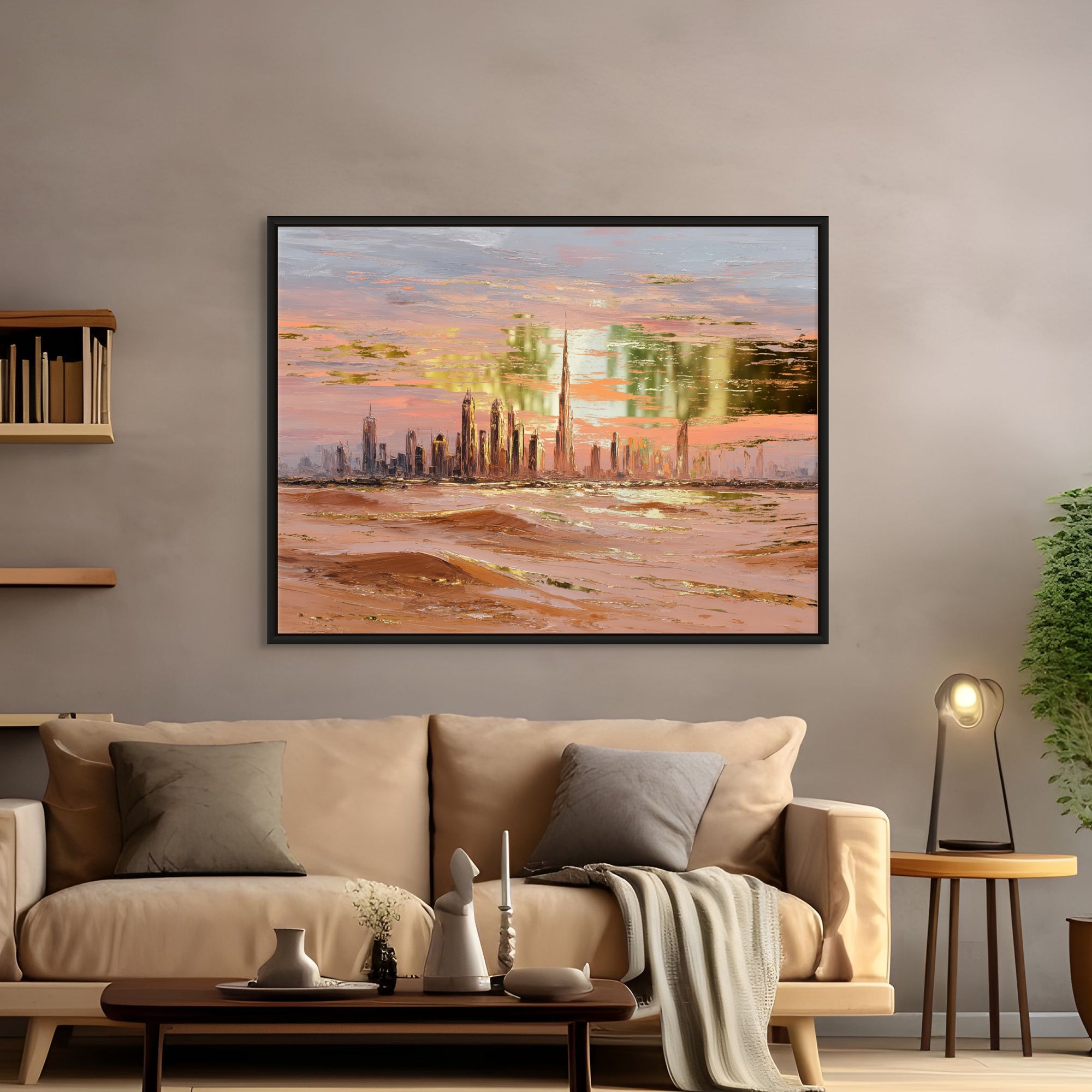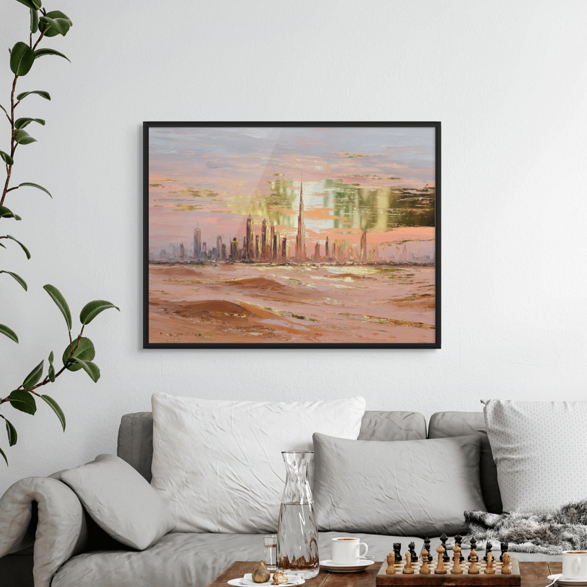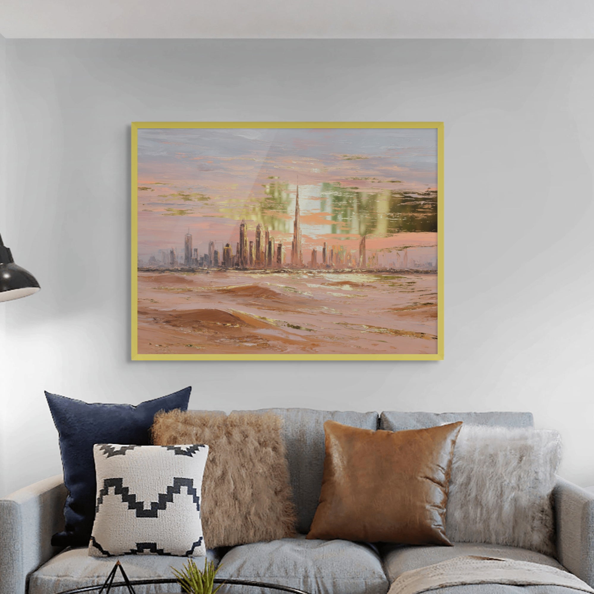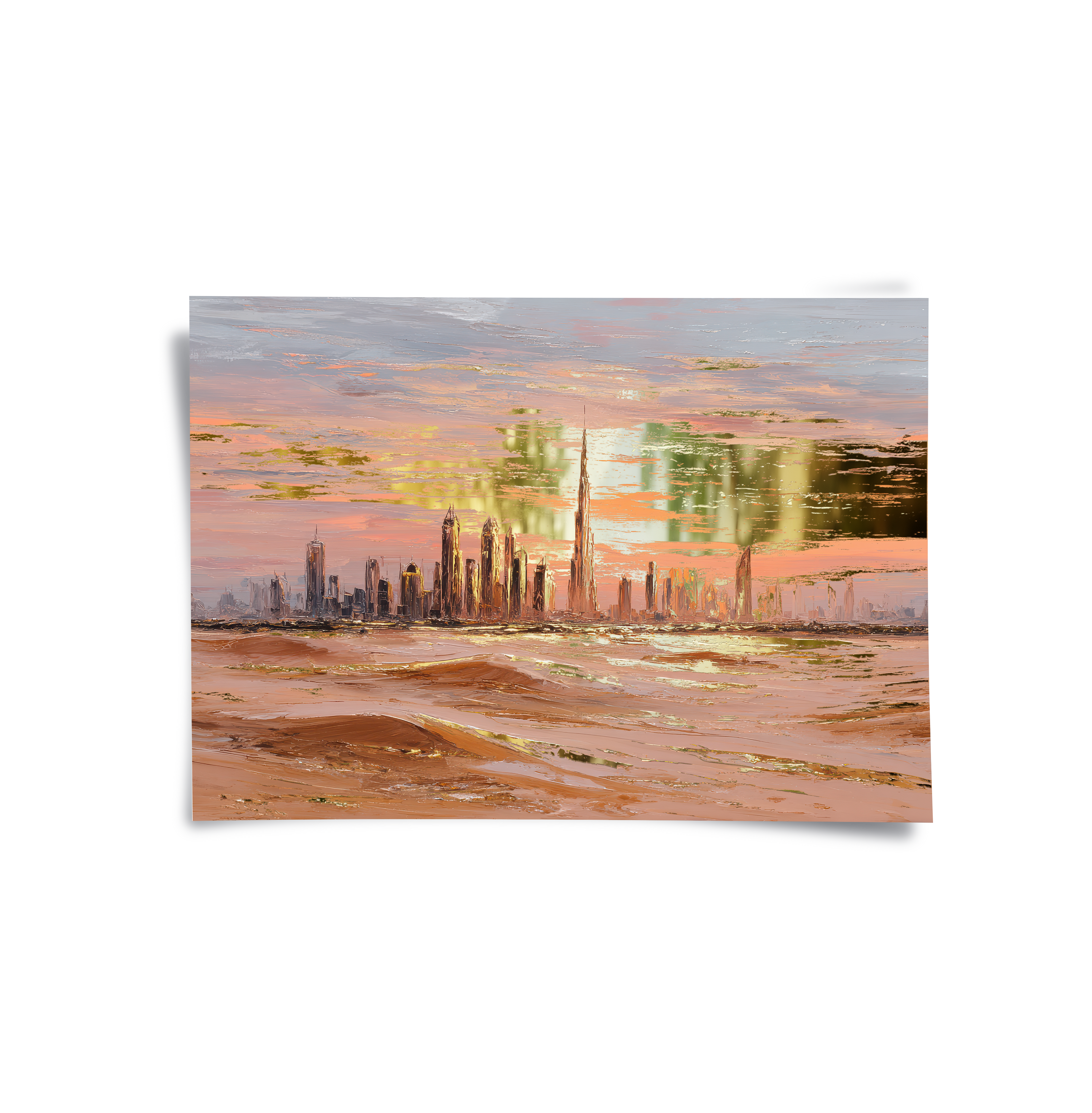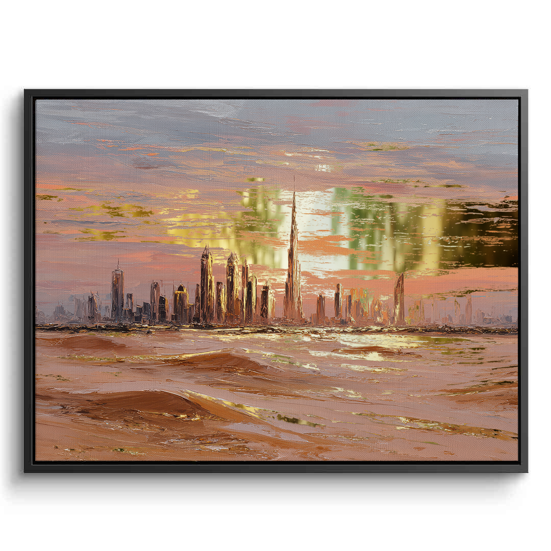 A gold-foiled artwork of Dubai’s skyline at sunset, framed by glowing desert dunes. The warm hues and metallic shimmer create a stunning blend of tradition and modernity, perfect for living rooms, lounges, or luxury interiors.