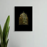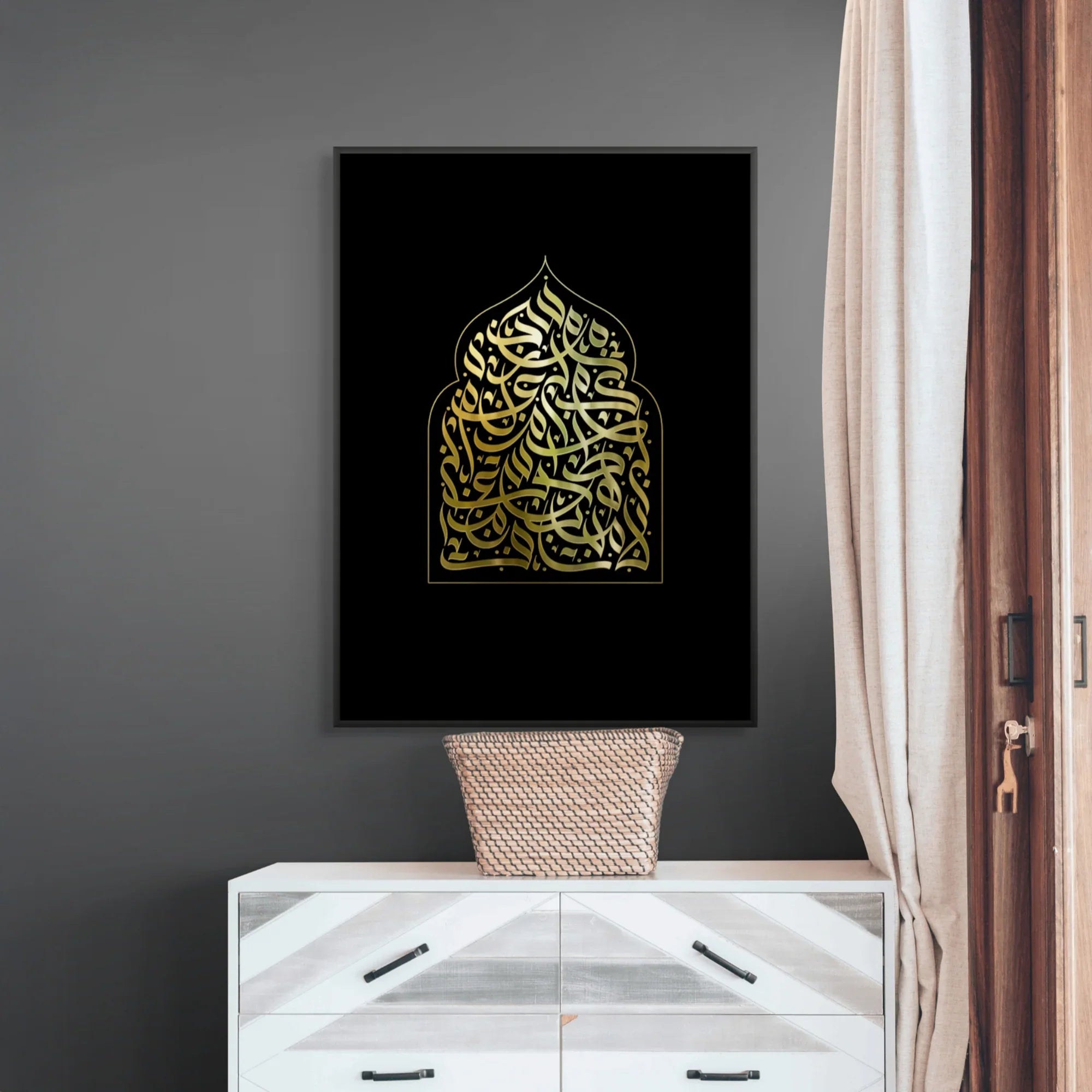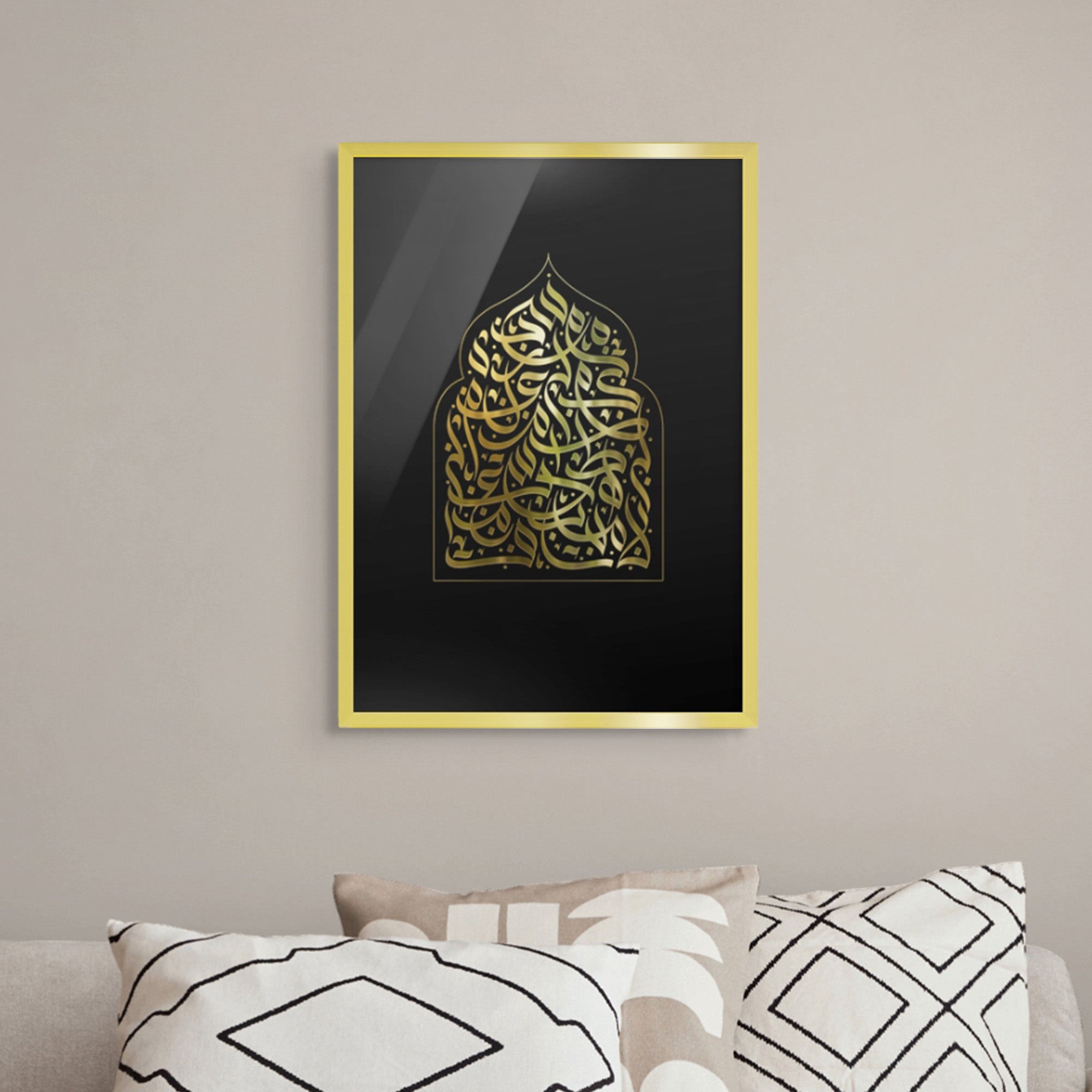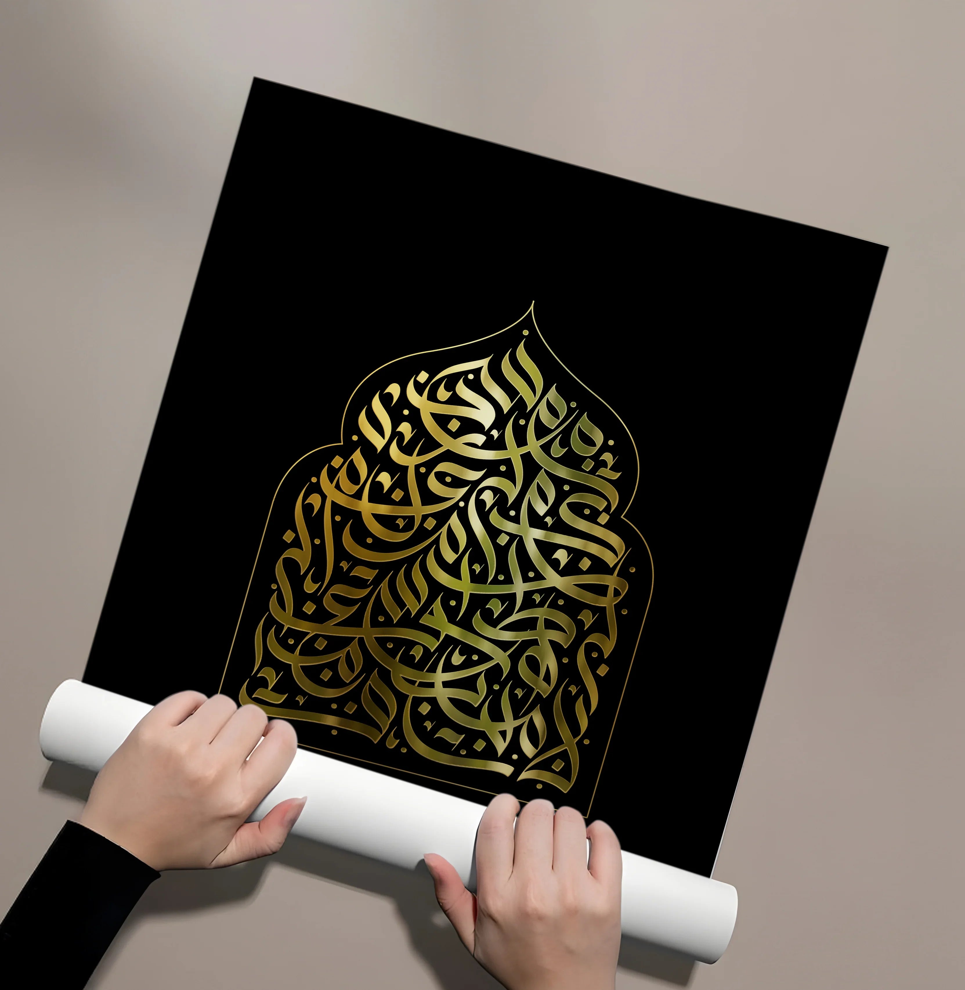 A contemporary artwork where fluid Arabic calligraphy forms a golden arch silhouette, blending tradition with modern aesthetics. Foiled in gold against a deep black backdrop, it creates a striking visual balance of structure and ornamental rhythm.