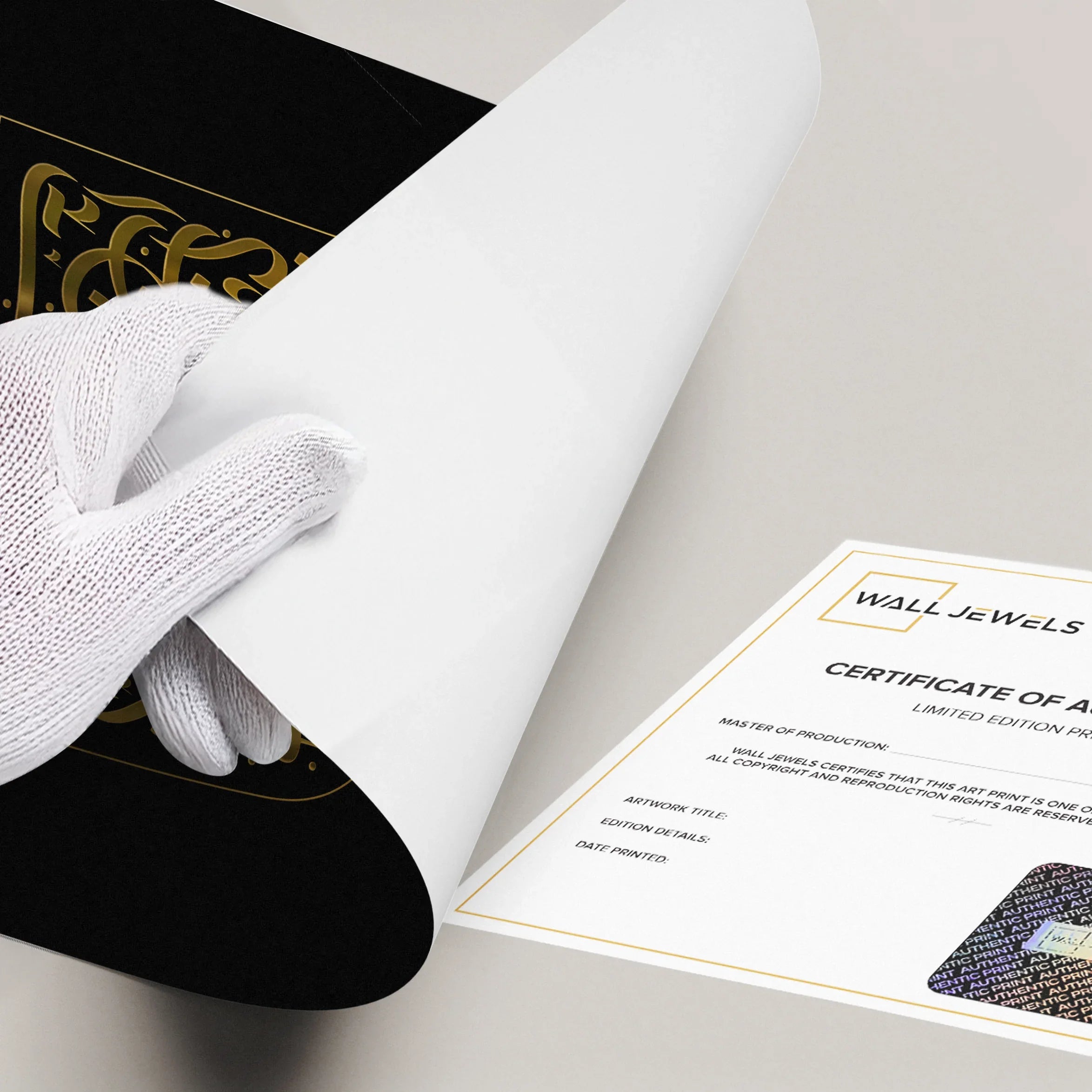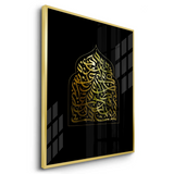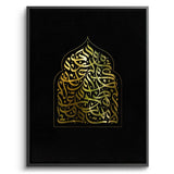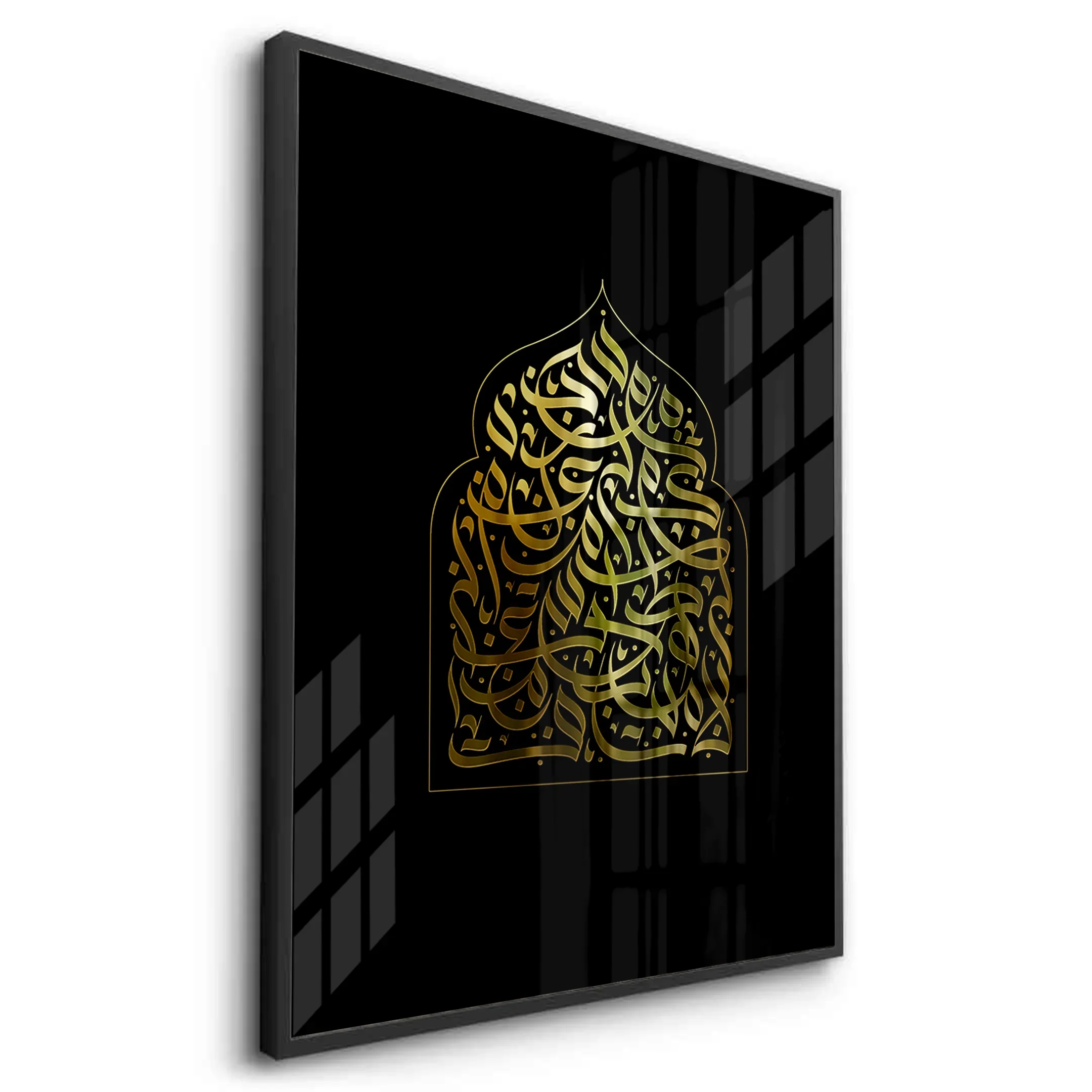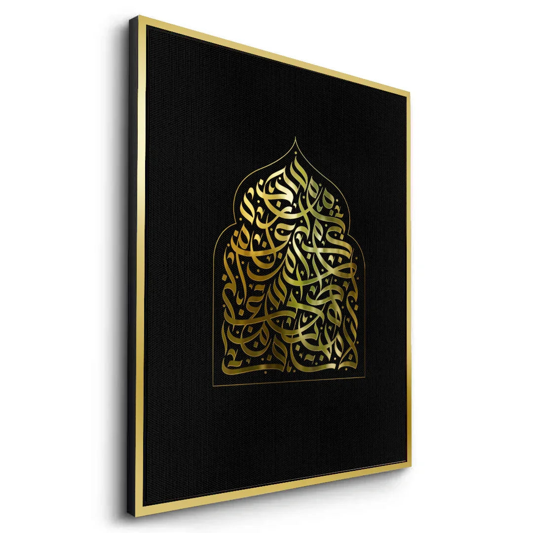 A contemporary artwork where fluid Arabic calligraphy forms a golden arch silhouette, blending tradition with modern aesthetics. Foiled in gold against a deep black backdrop, it creates a striking visual balance of structure and ornamental rhythm.