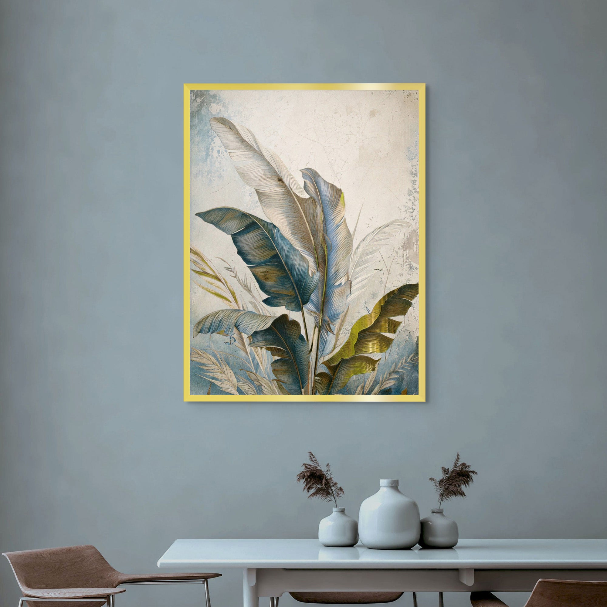 A sophisticated botanical composition featuring sweeping banana fronds rendered in soft gradients of blue and beige, highlighted with delicate gold accents. This artwork brings an elegant tropical essence to any space — calming, organic, and timeless.