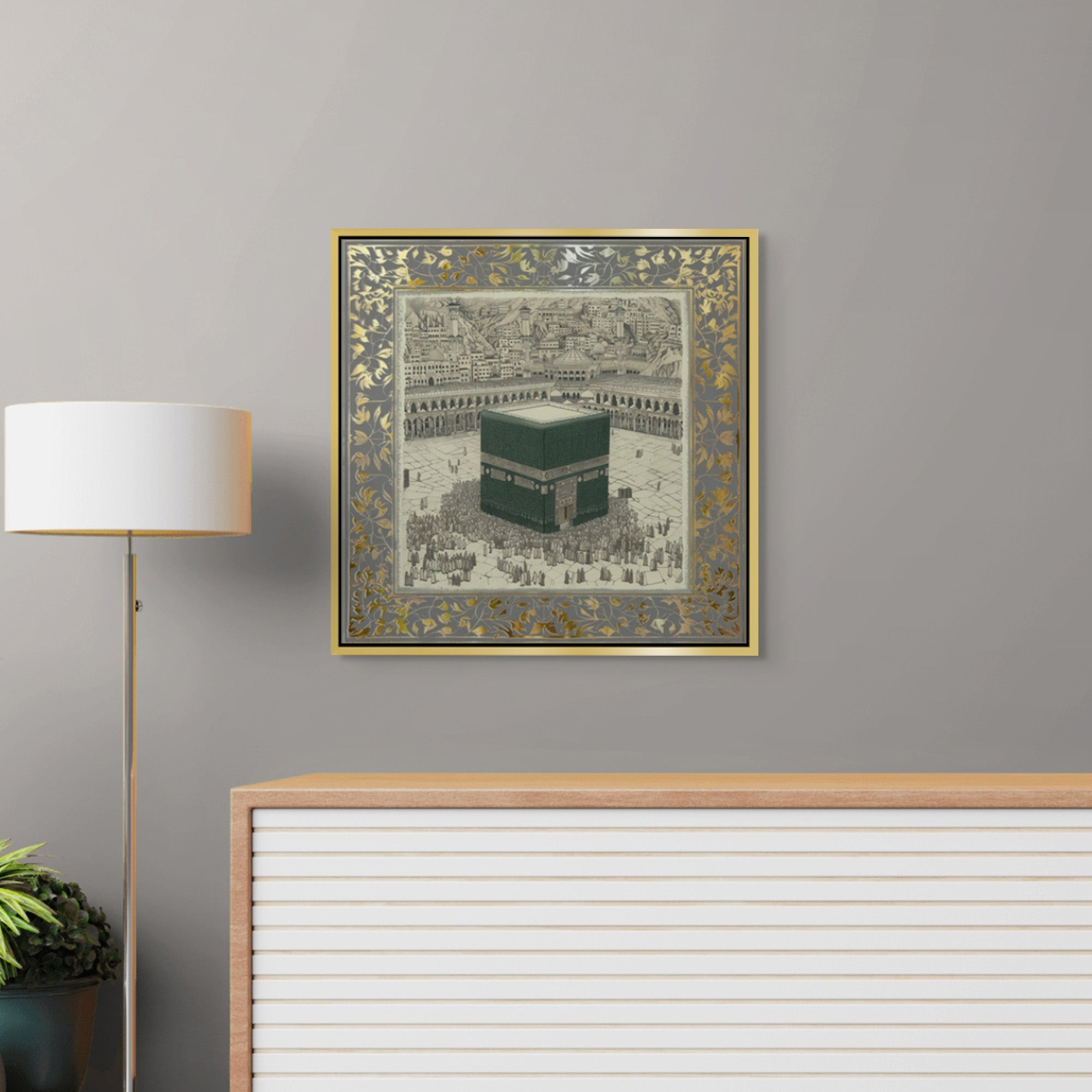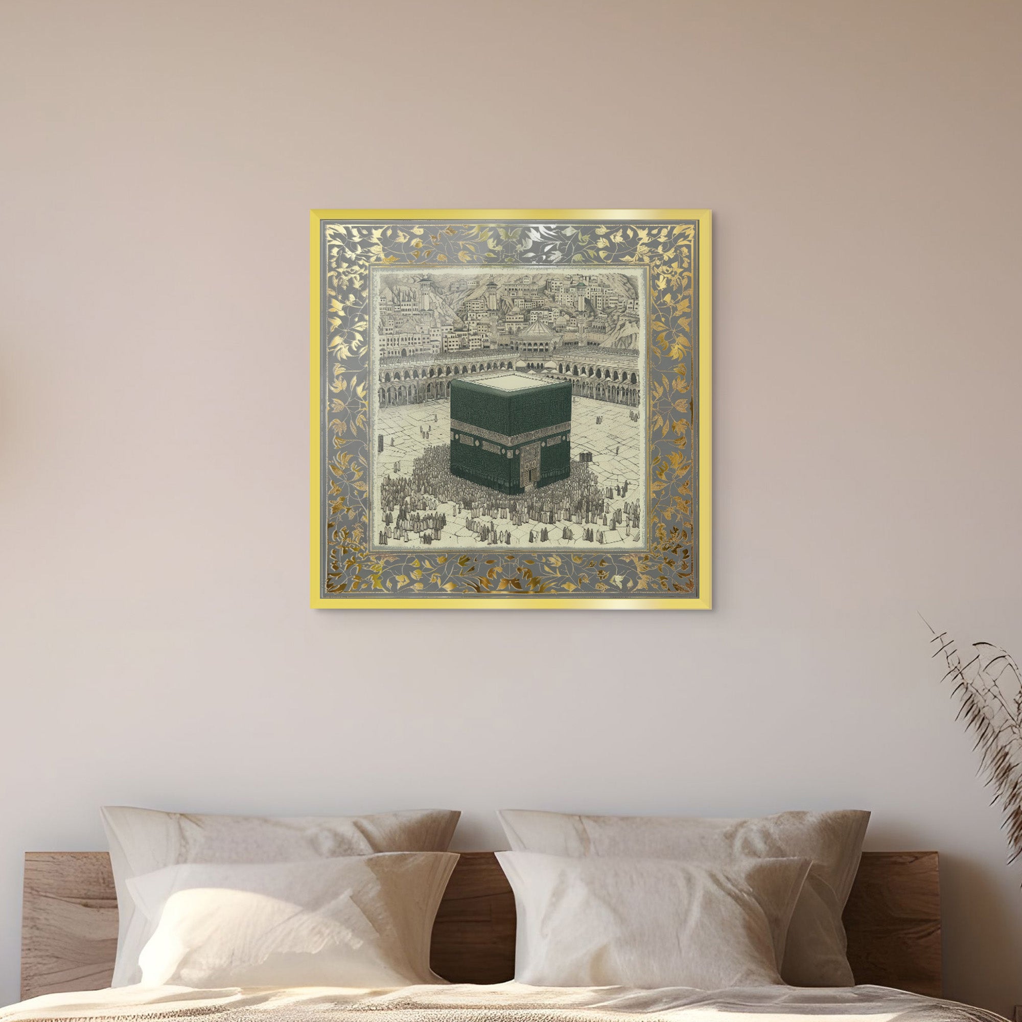 A classical illustration of the Kaaba, Bayt al-Ḥaram (The Sacred House), encircled by worshippers in reverence. Framed in an ornate gold leaf motif, it evokes timeless devotion. Ideal for living rooms, halls, or Islamic centers.