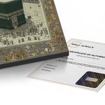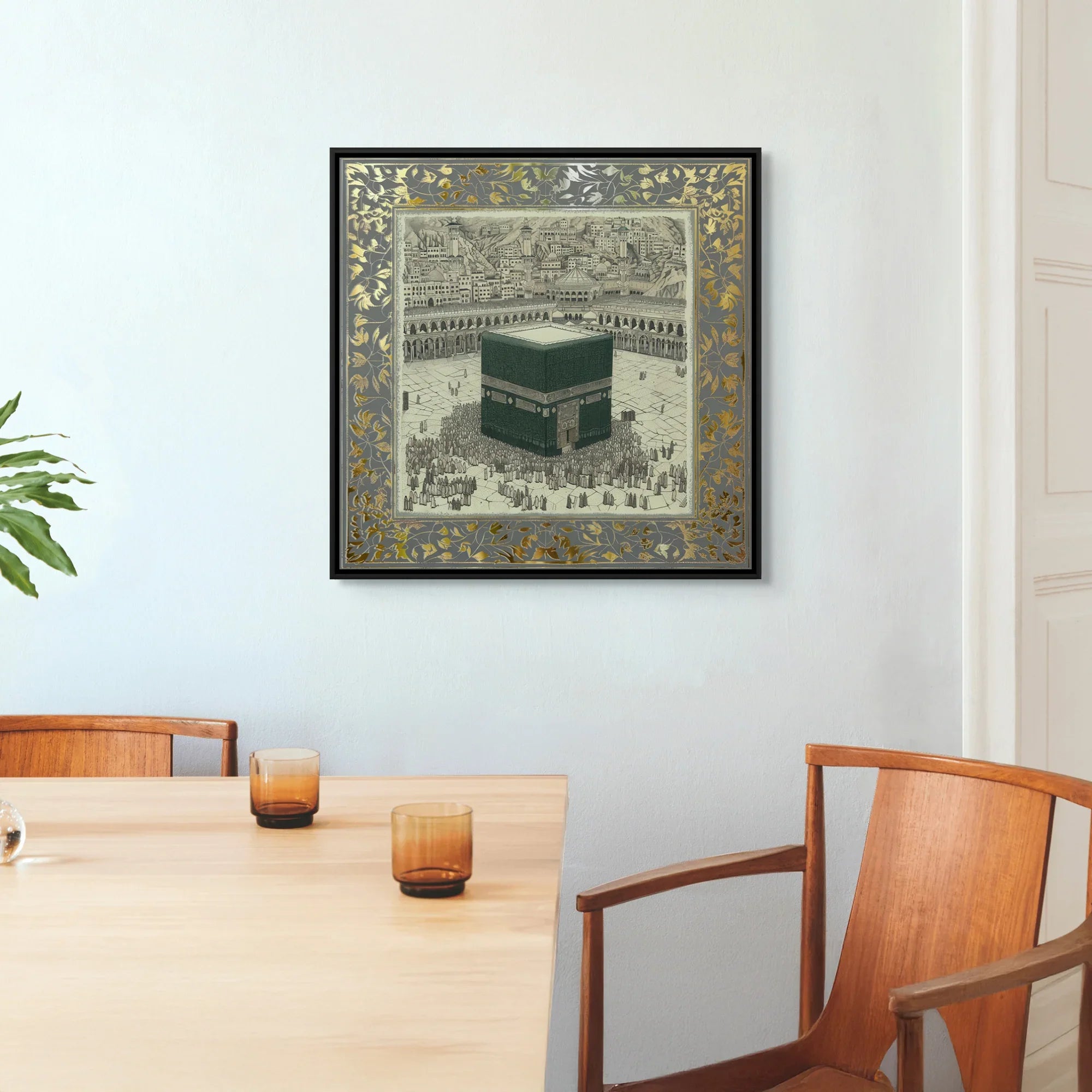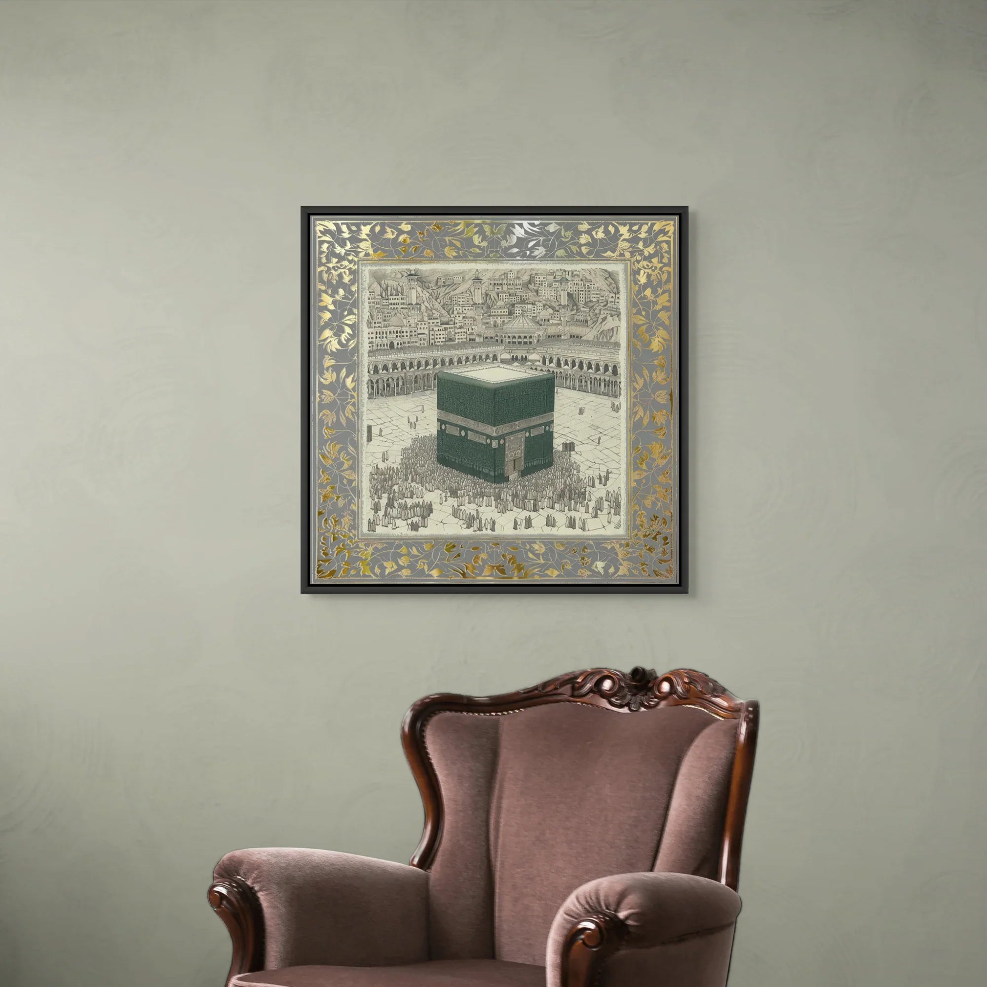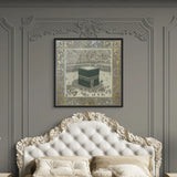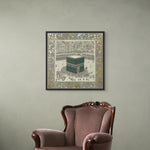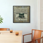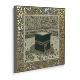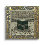 A classical illustration of the Kaaba, Bayt al-Ḥaram (The Sacred House), encircled by worshippers in reverence. Framed in an ornate gold leaf motif, it evokes timeless devotion. Ideal for living rooms, halls, or Islamic centers.