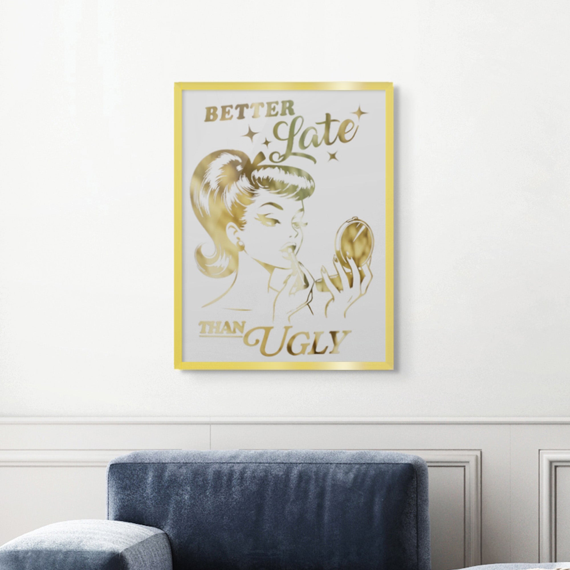 A fun and fabulous artwork celebrating the motto “Better Late Than Ugly,” this gold-foiled beauty piece is perfect for makeup lovers and glam queens. Ideal for vanities, salons, or dressing spaces that thrive on style.