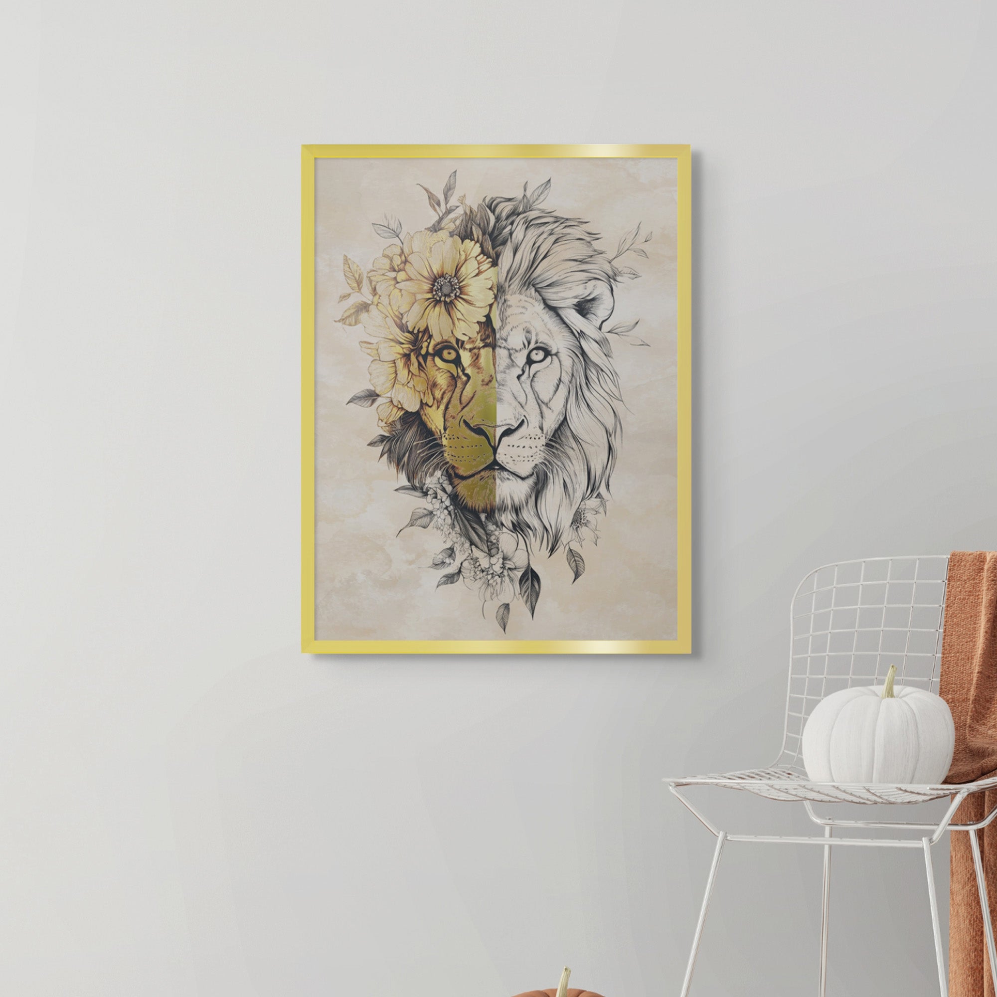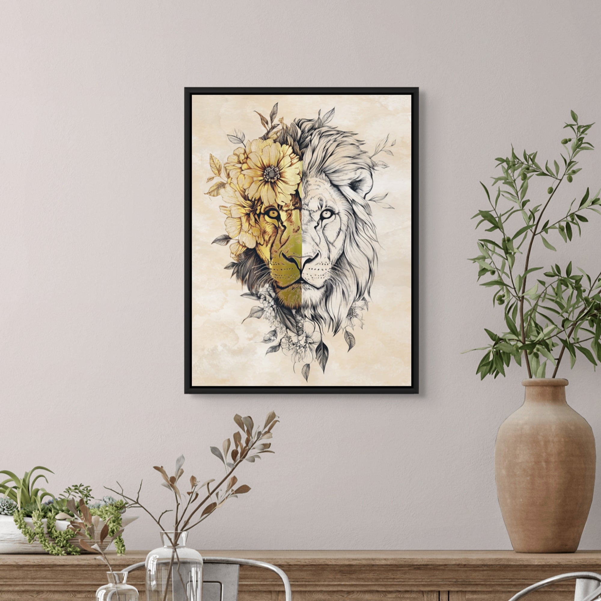 A striking lion portrait that blends strength and softness—half crowned in golden florals, half etched in monochrome lines. This balanced artwork adds character and grace to living rooms, entryways, home offices, or creative studio walls.
