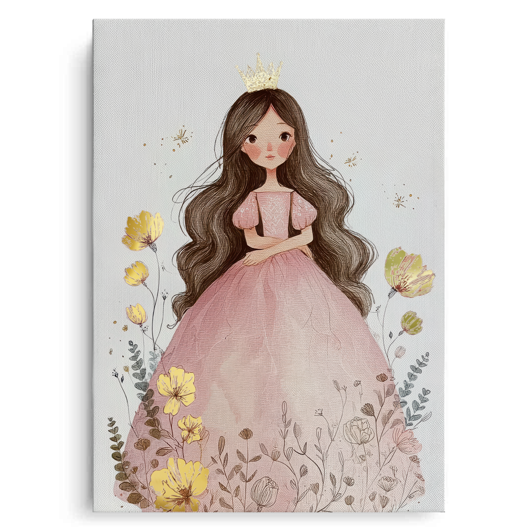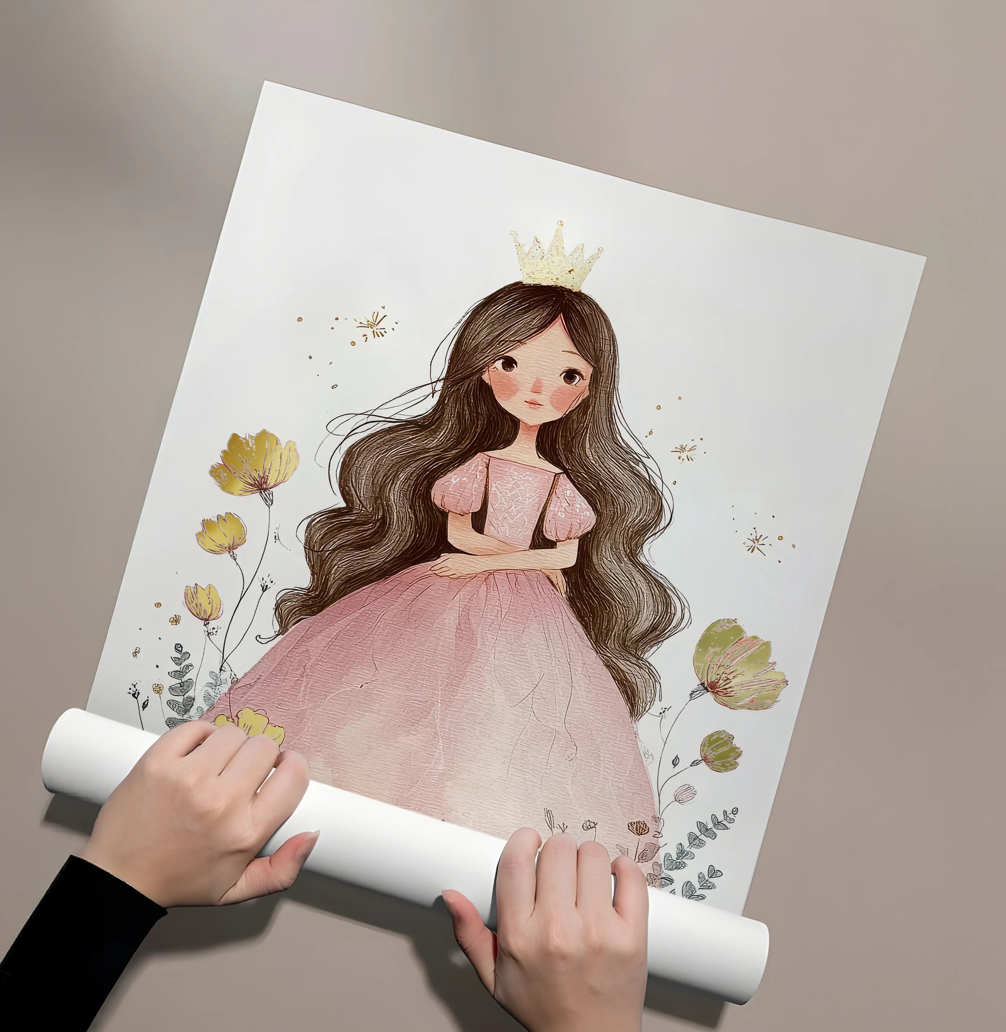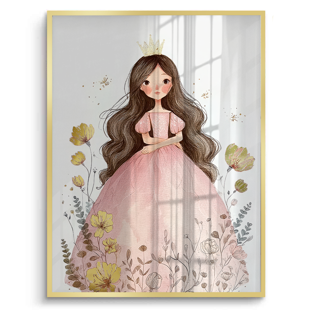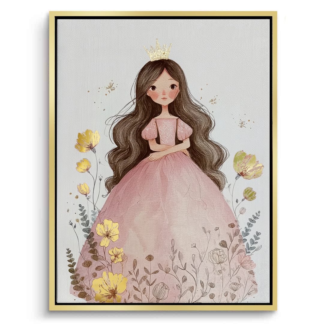 This gold-foiled artwork captures a sweet princess in her flowing blush gown, surrounded by whimsical blooms. With soft pink and golden tones, it brings a dreamy fairytale charm to nurseries, playrooms, or little girls’ royal spaces.