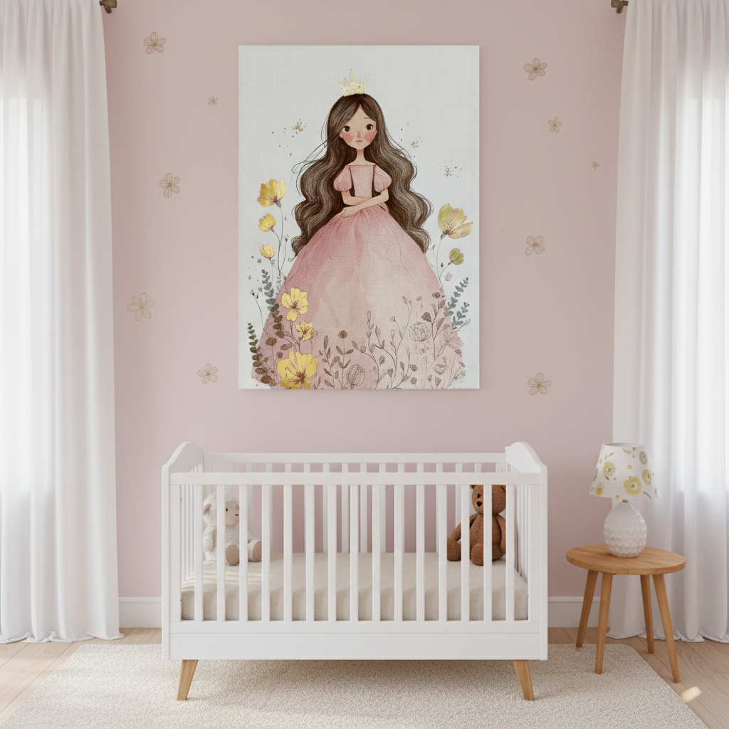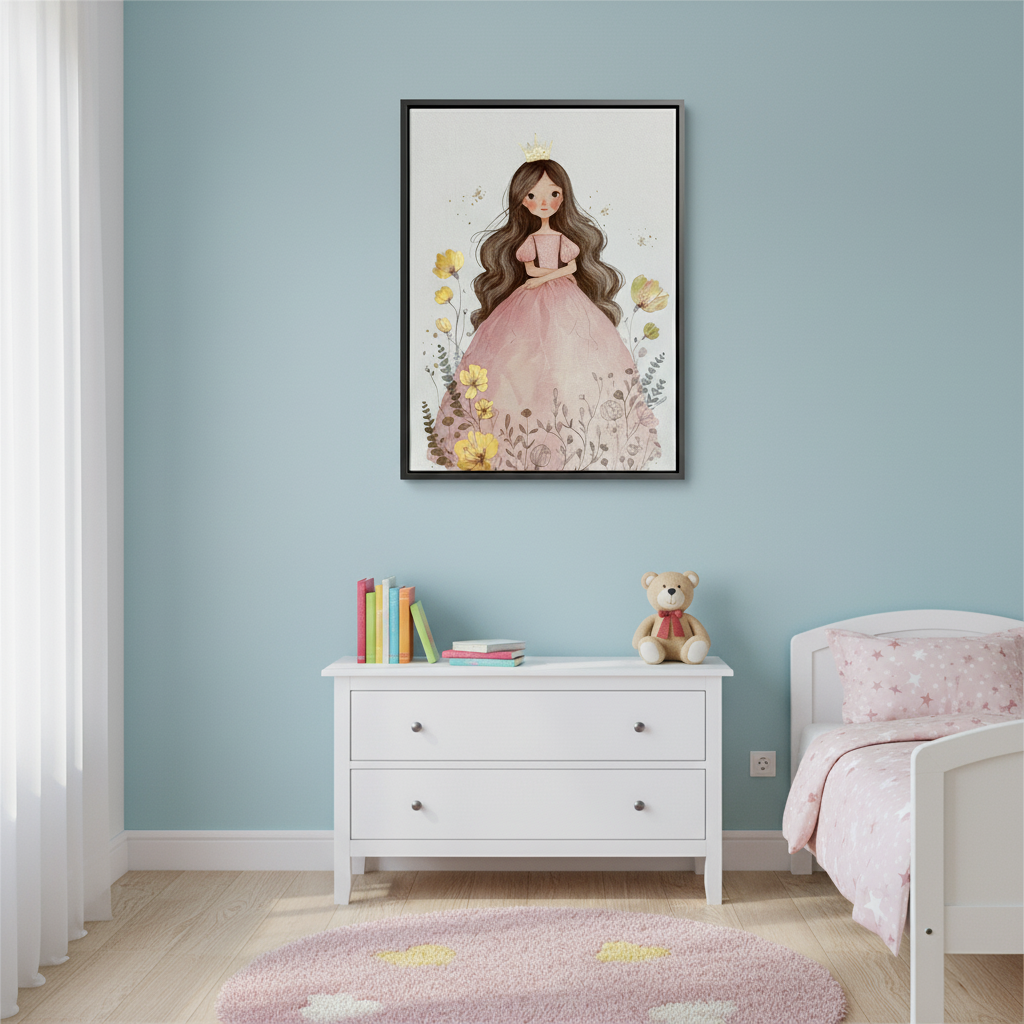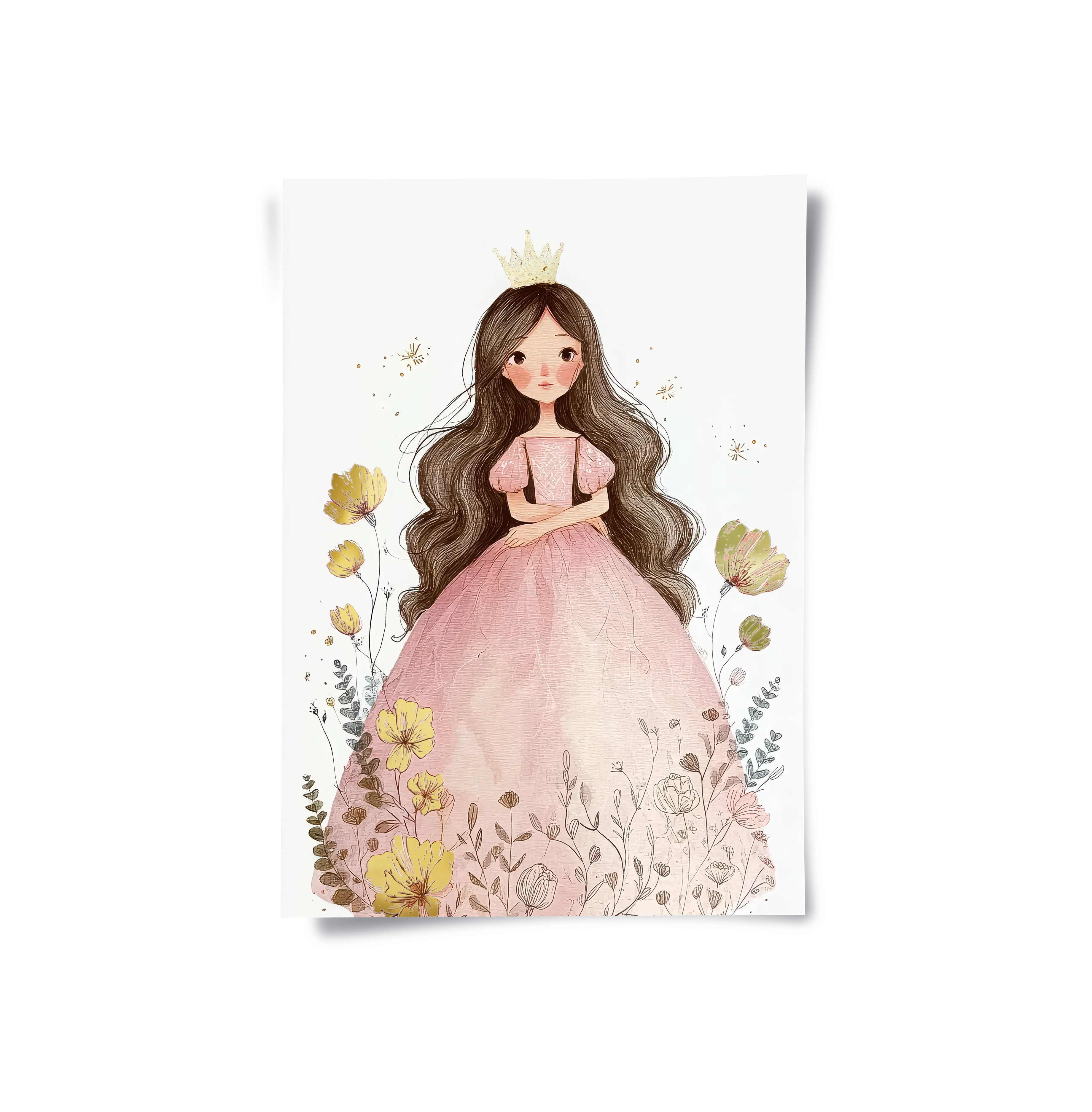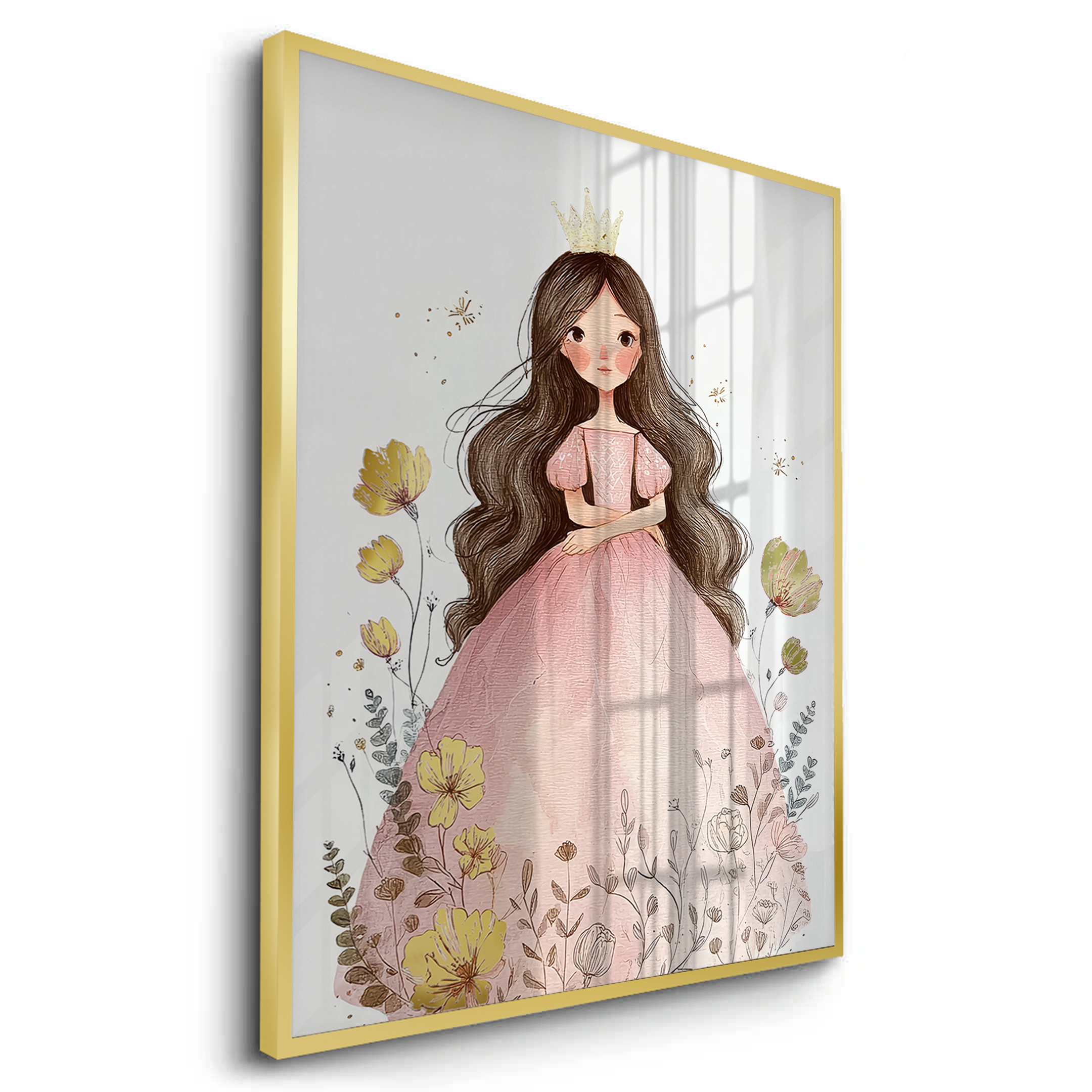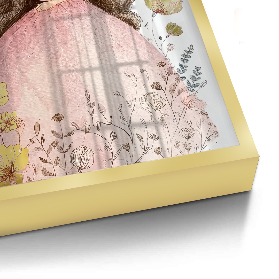 This gold-foiled artwork captures a sweet princess in her flowing blush gown, surrounded by whimsical blooms. With soft pink and golden tones, it brings a dreamy fairytale charm to nurseries, playrooms, or little girls’ royal spaces.