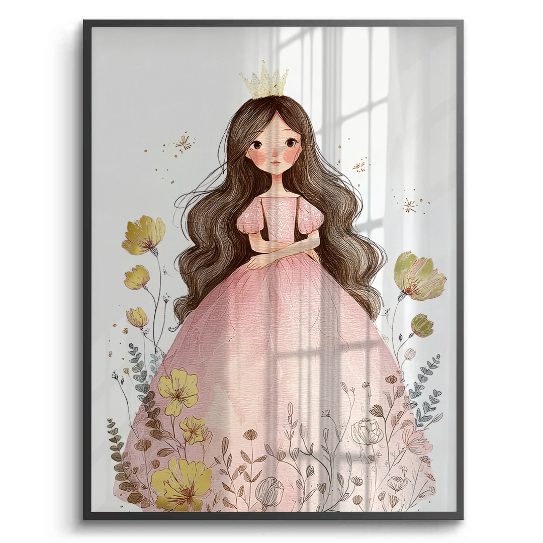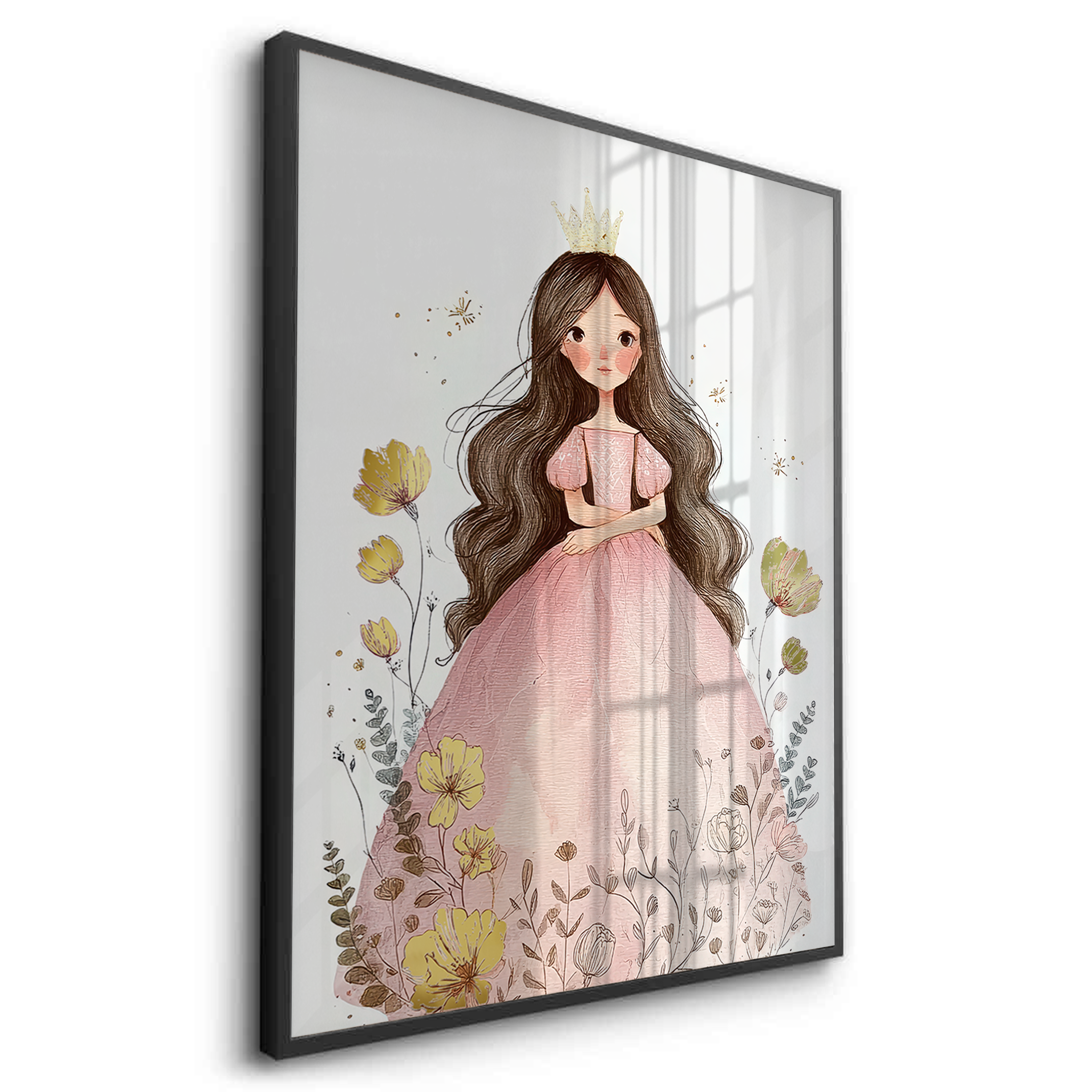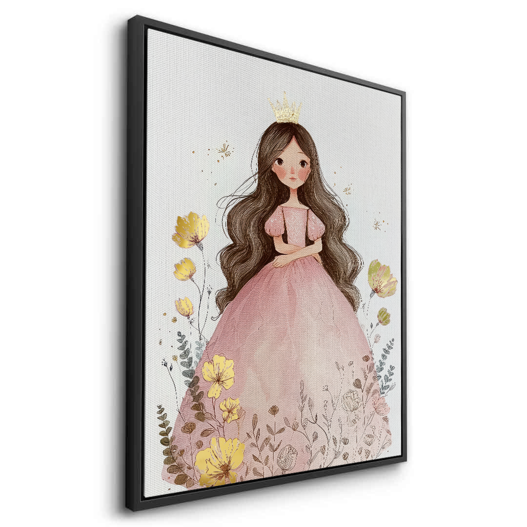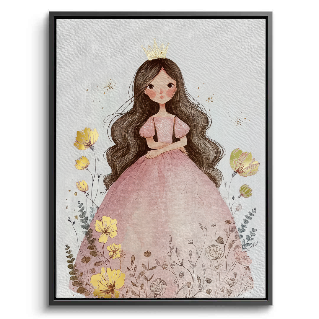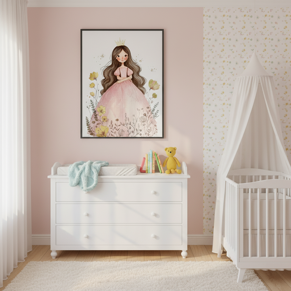 This gold-foiled artwork captures a sweet princess in her flowing blush gown, surrounded by whimsical blooms. With soft pink and golden tones, it brings a dreamy fairytale charm to nurseries, playrooms, or little girls’ royal spaces.