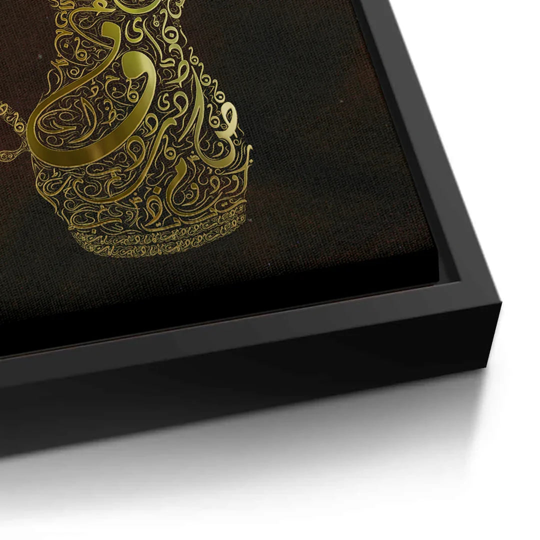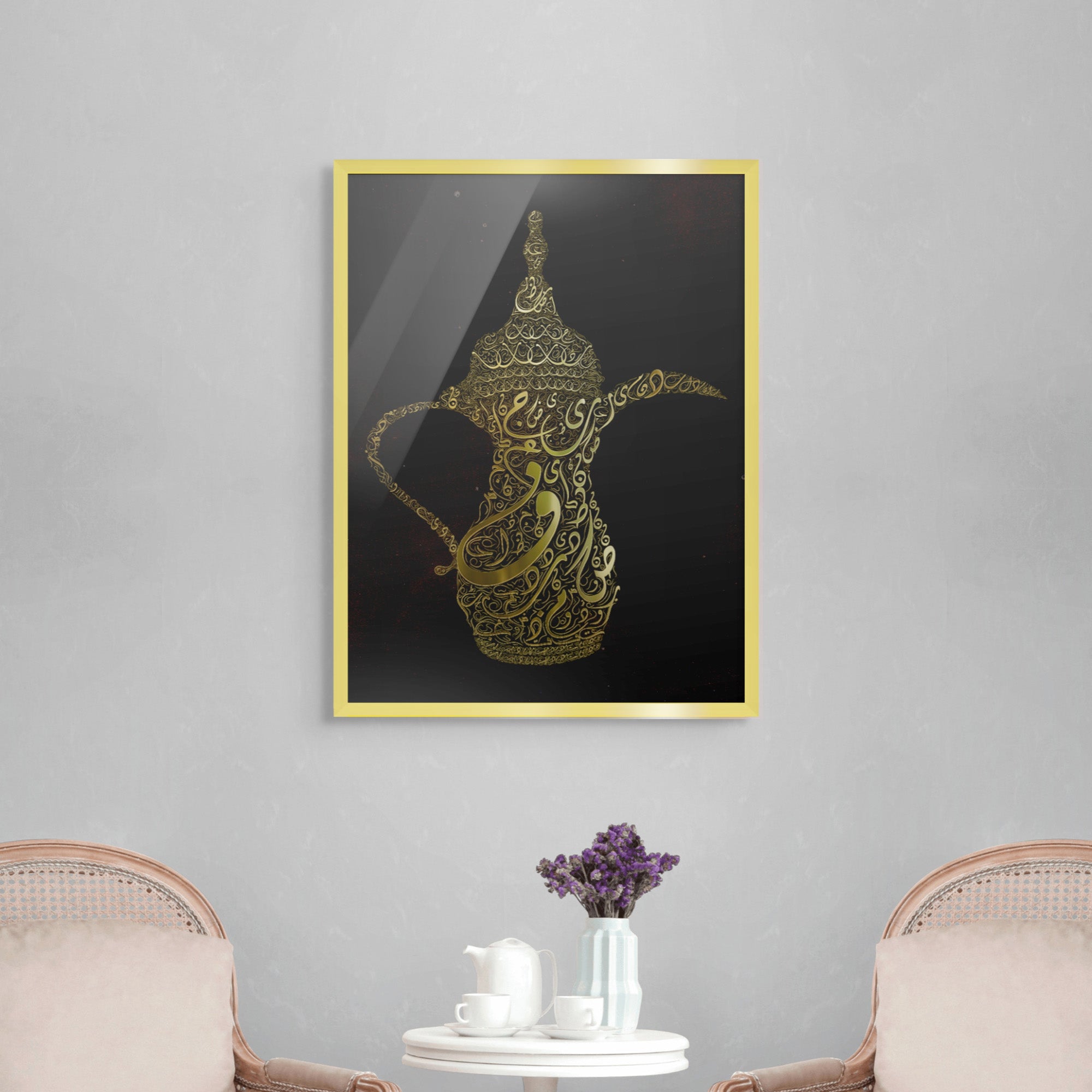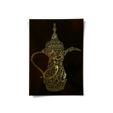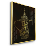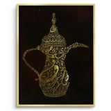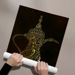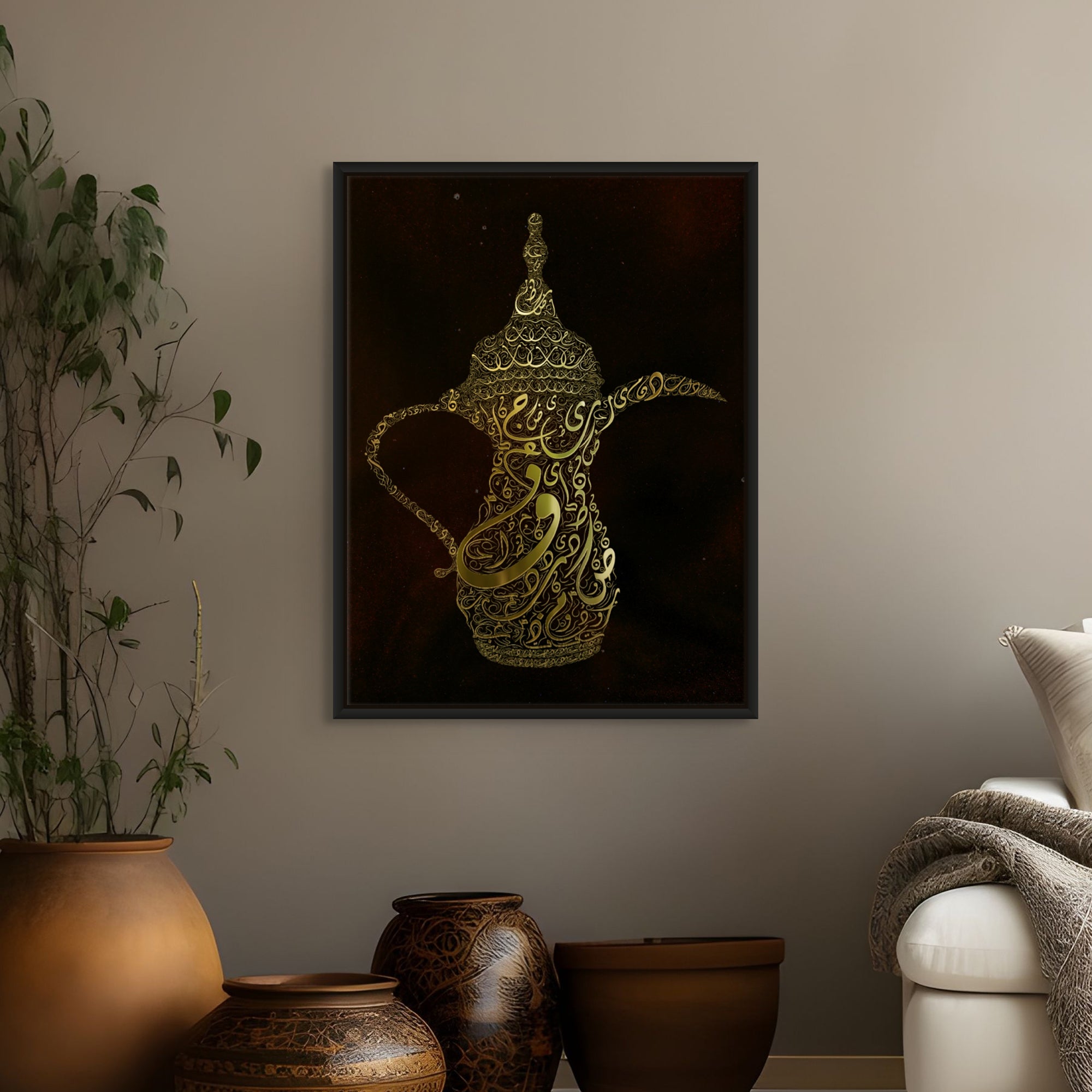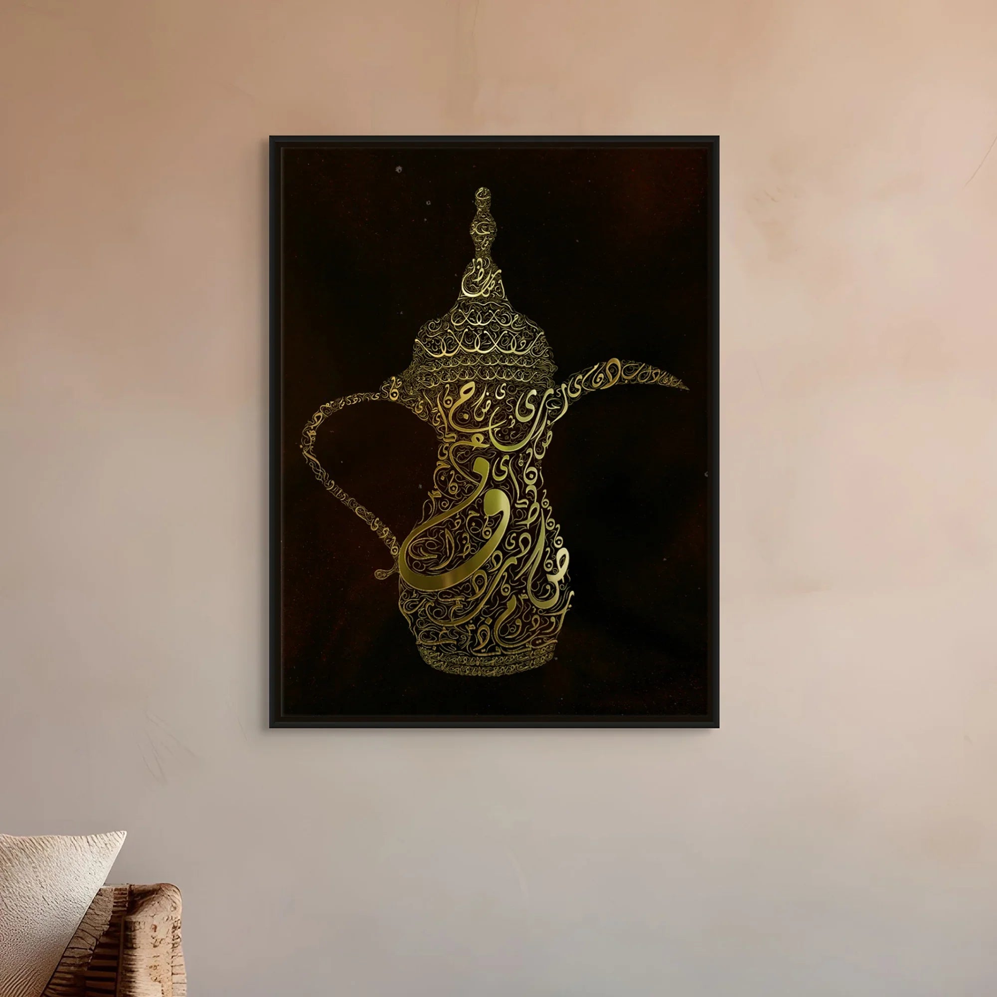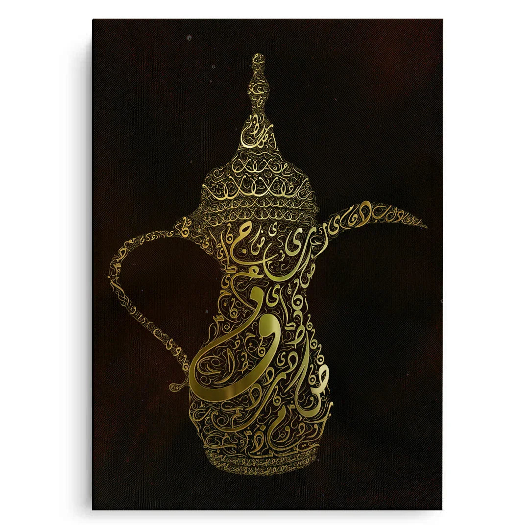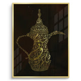 A majestic Arabic coffee pot (dallah) formed entirely from intricate Arabic calligraphy, glowing in rich gold against a deep brown-black background. This piece blends cultural heritage with elegance. Perfect for classic, cozy, or heritage-themed spaces.