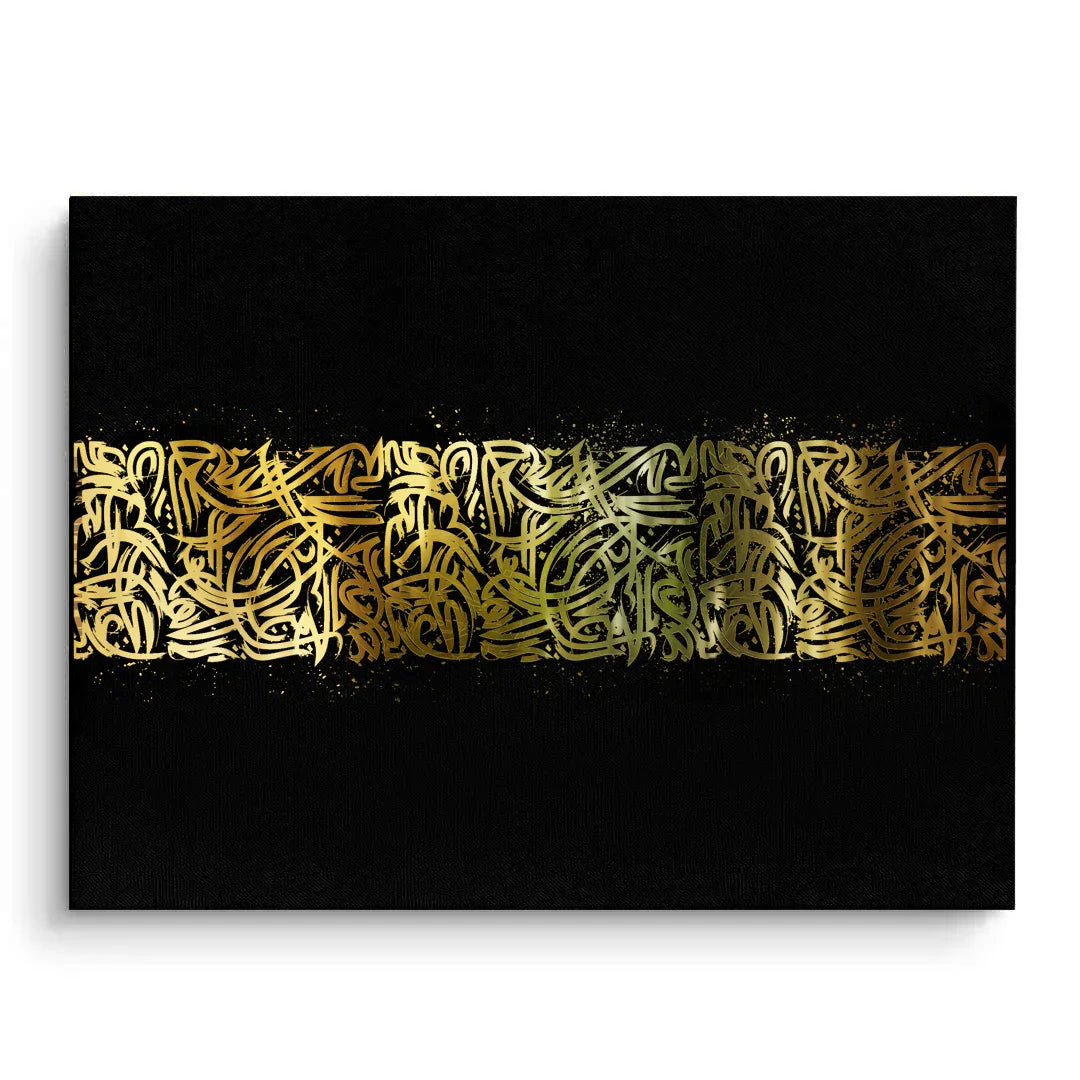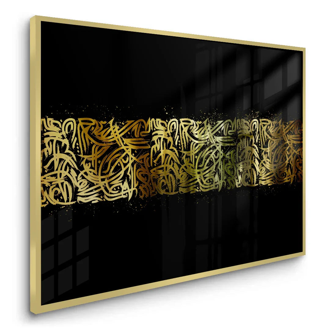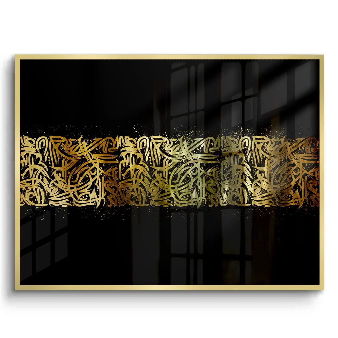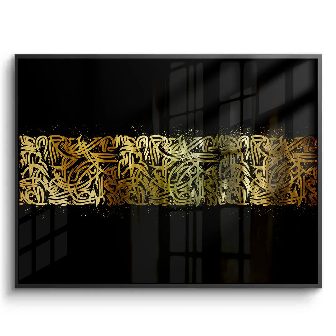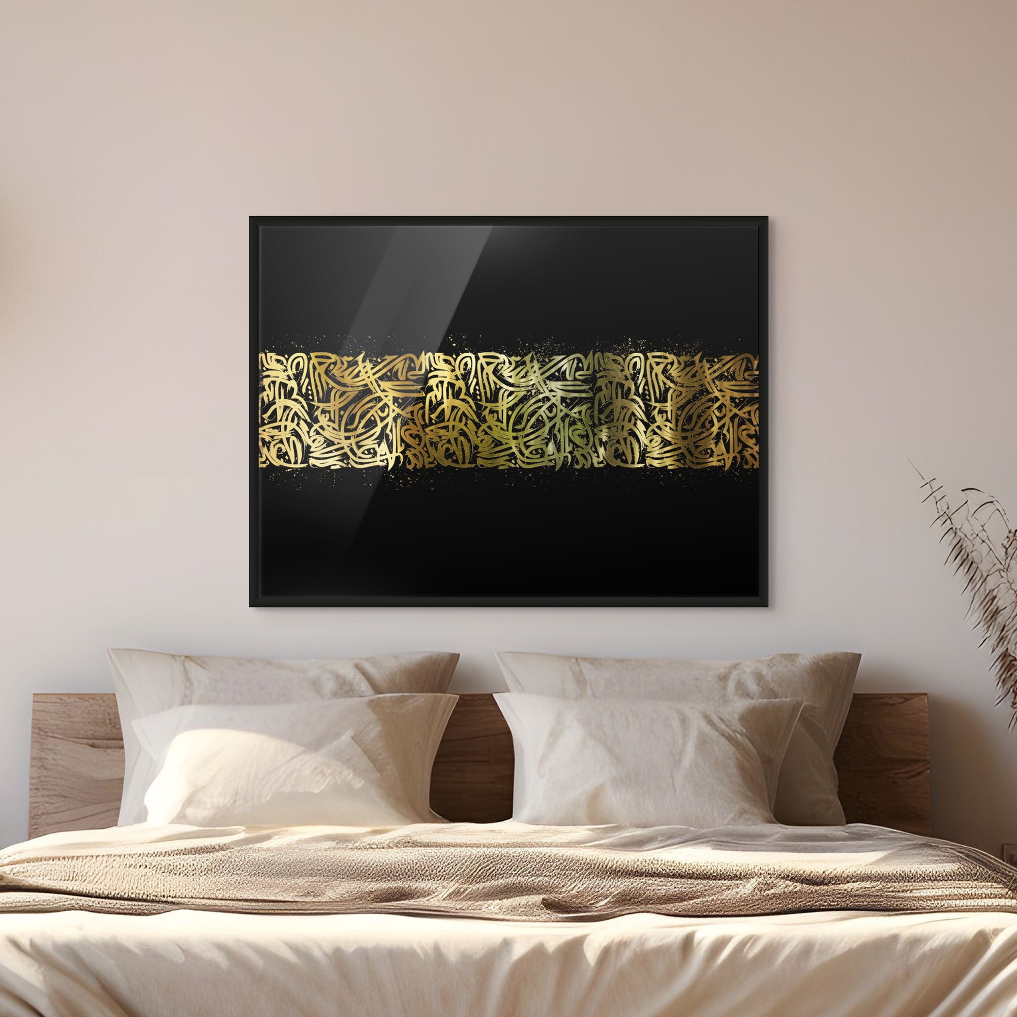 A fluid tapestry of Arabic calligraphy in golden brush-like strokes on a deep black background. This expressive artwork evokes movement and mystique—perfect for statement interiors, artistic spaces, or cultural accent walls.