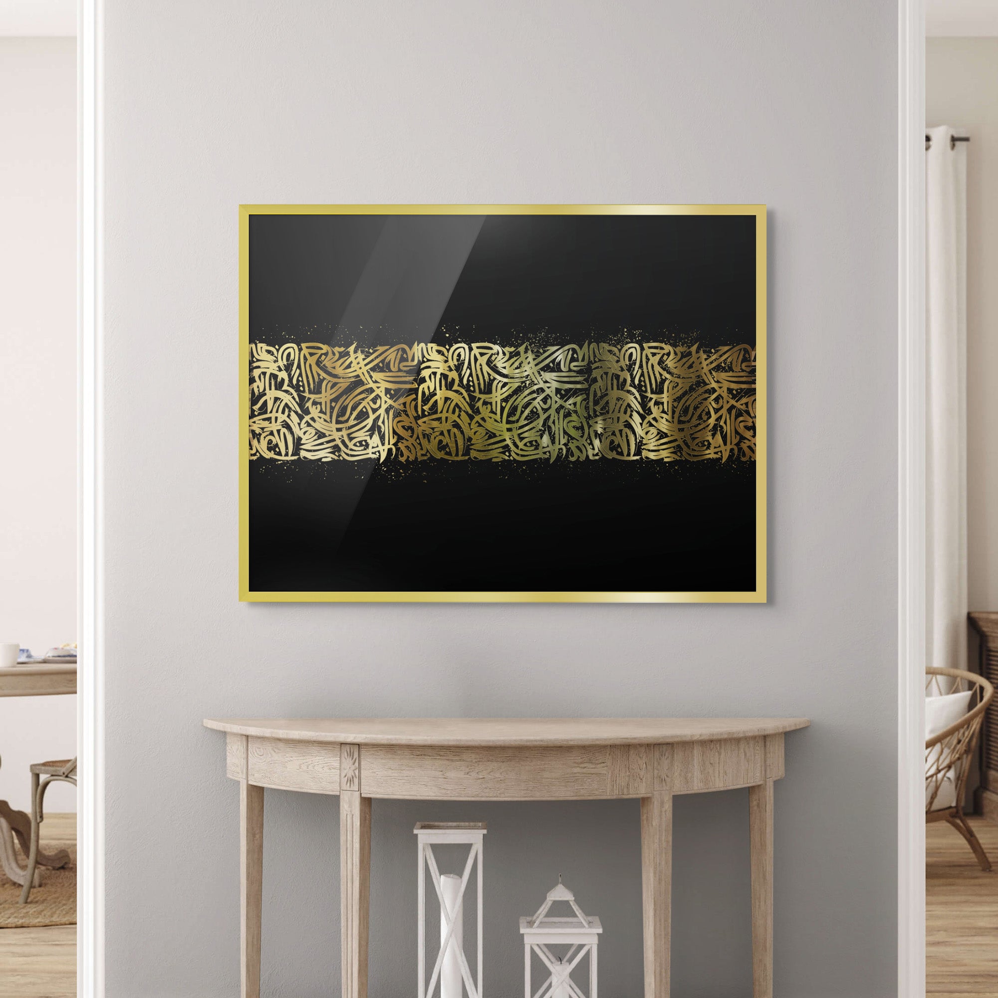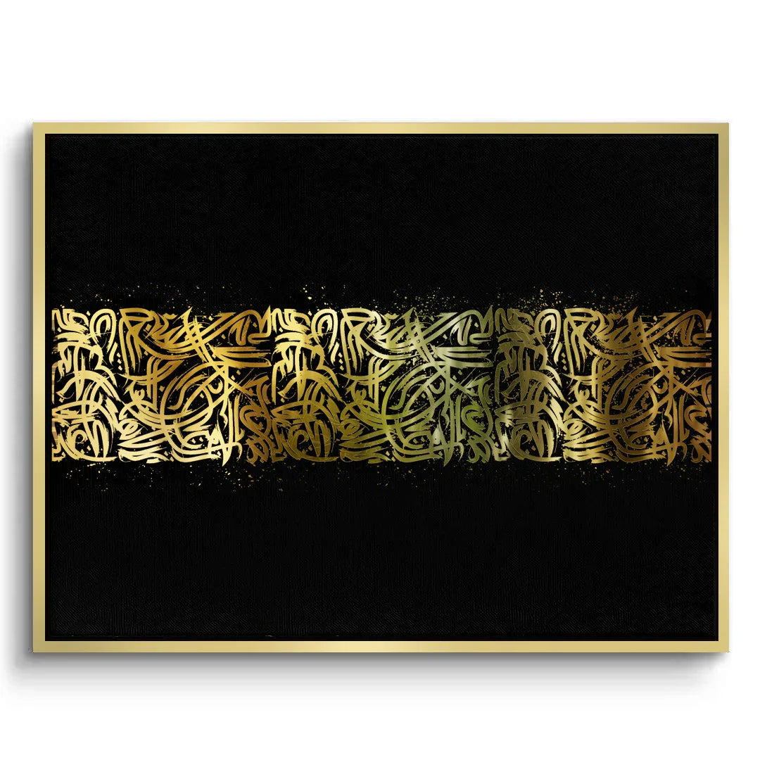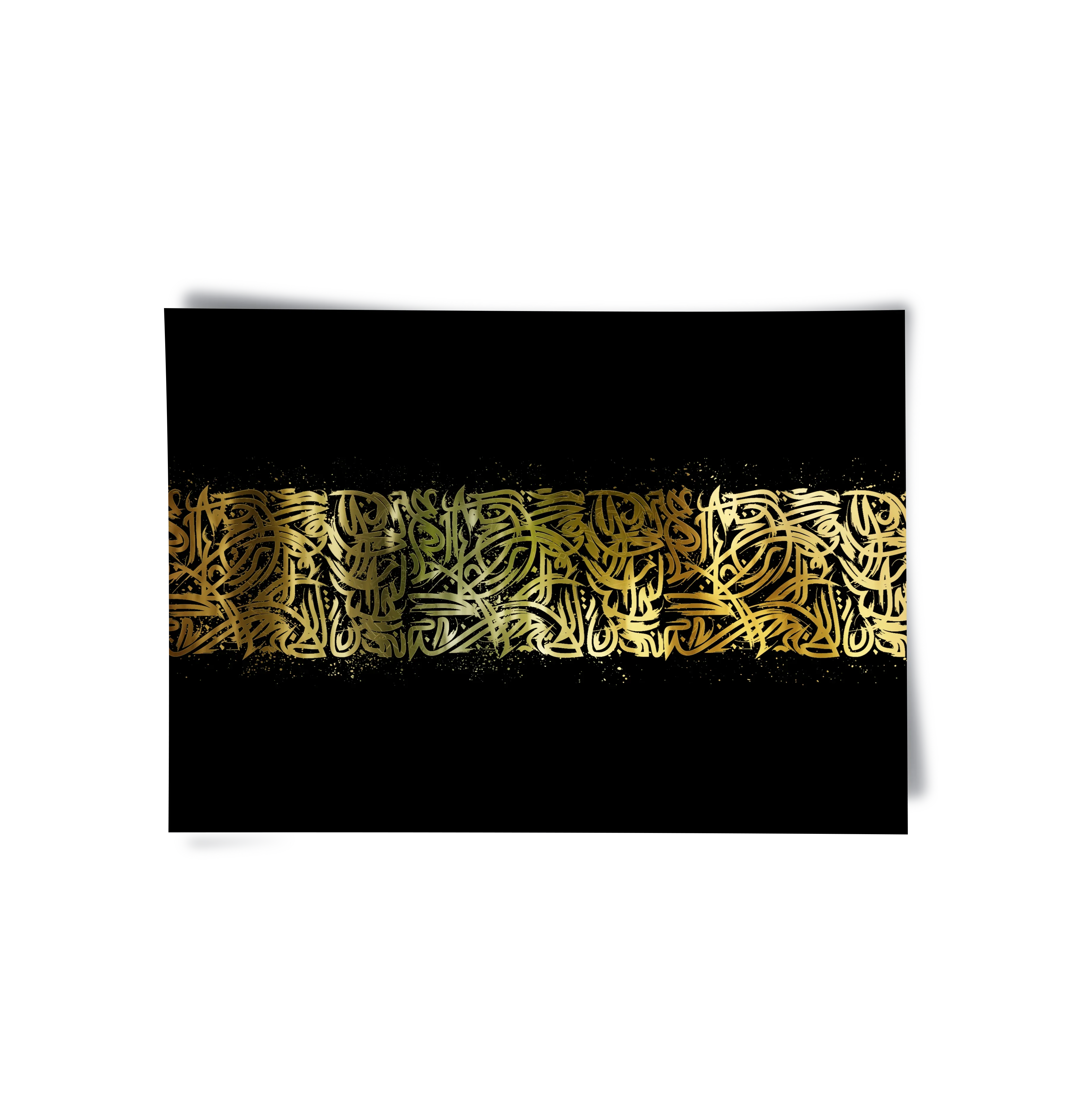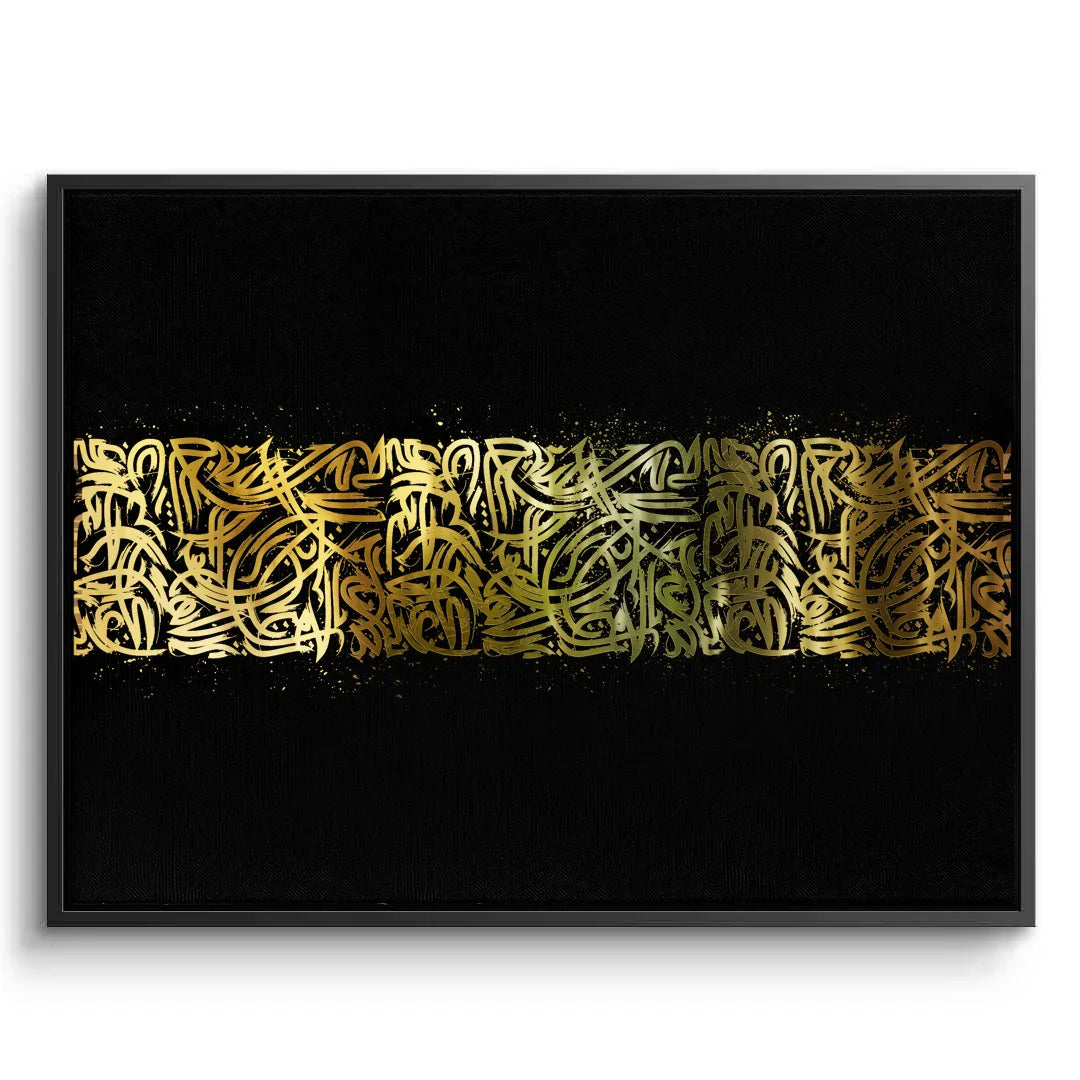 A fluid tapestry of Arabic calligraphy in golden brush-like strokes on a deep black background. This expressive artwork evokes movement and mystique—perfect for statement interiors, artistic spaces, or cultural accent walls.