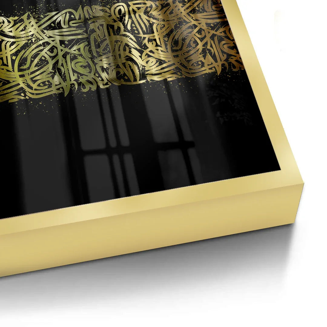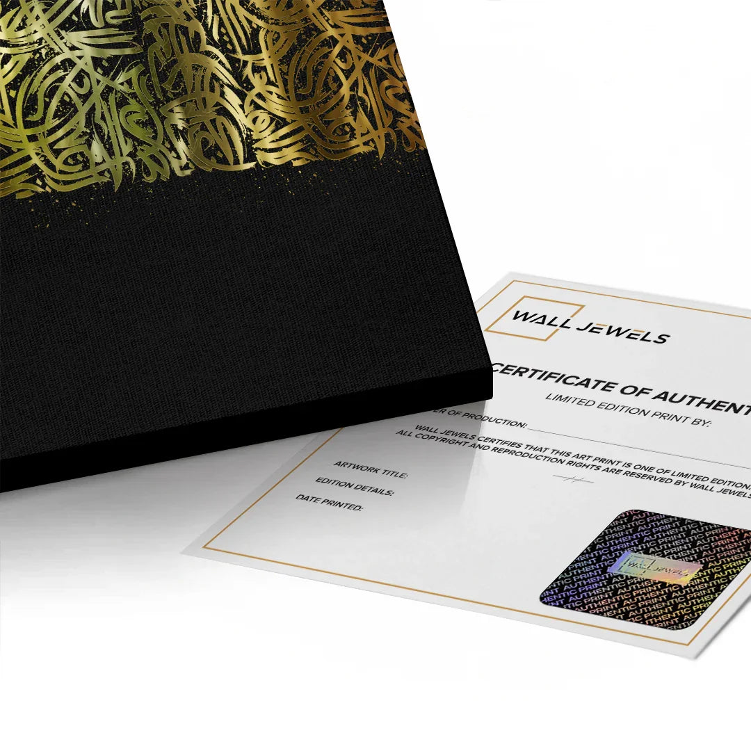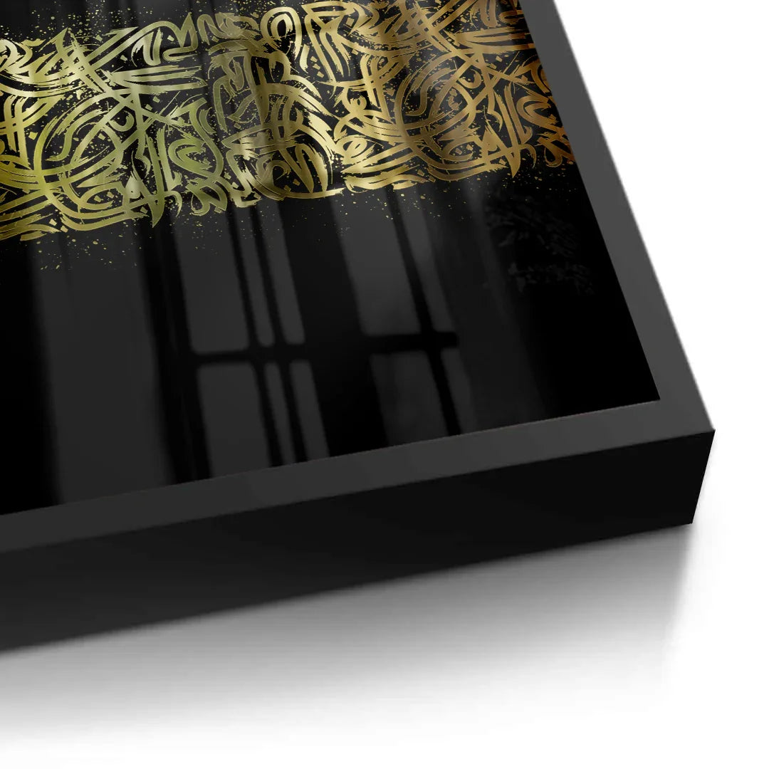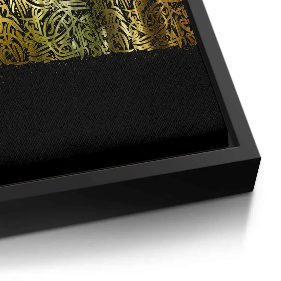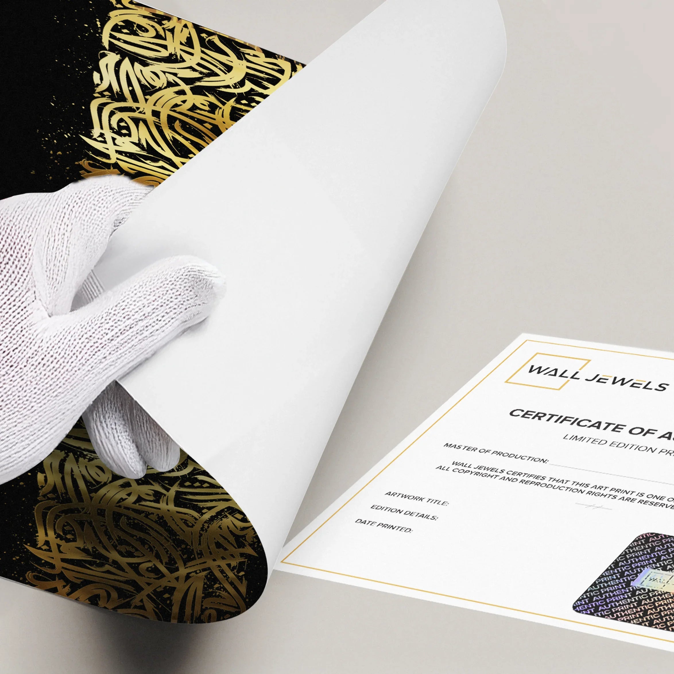 A fluid tapestry of Arabic calligraphy in golden brush-like strokes on a deep black background. This expressive artwork evokes movement and mystique—perfect for statement interiors, artistic spaces, or cultural accent walls.