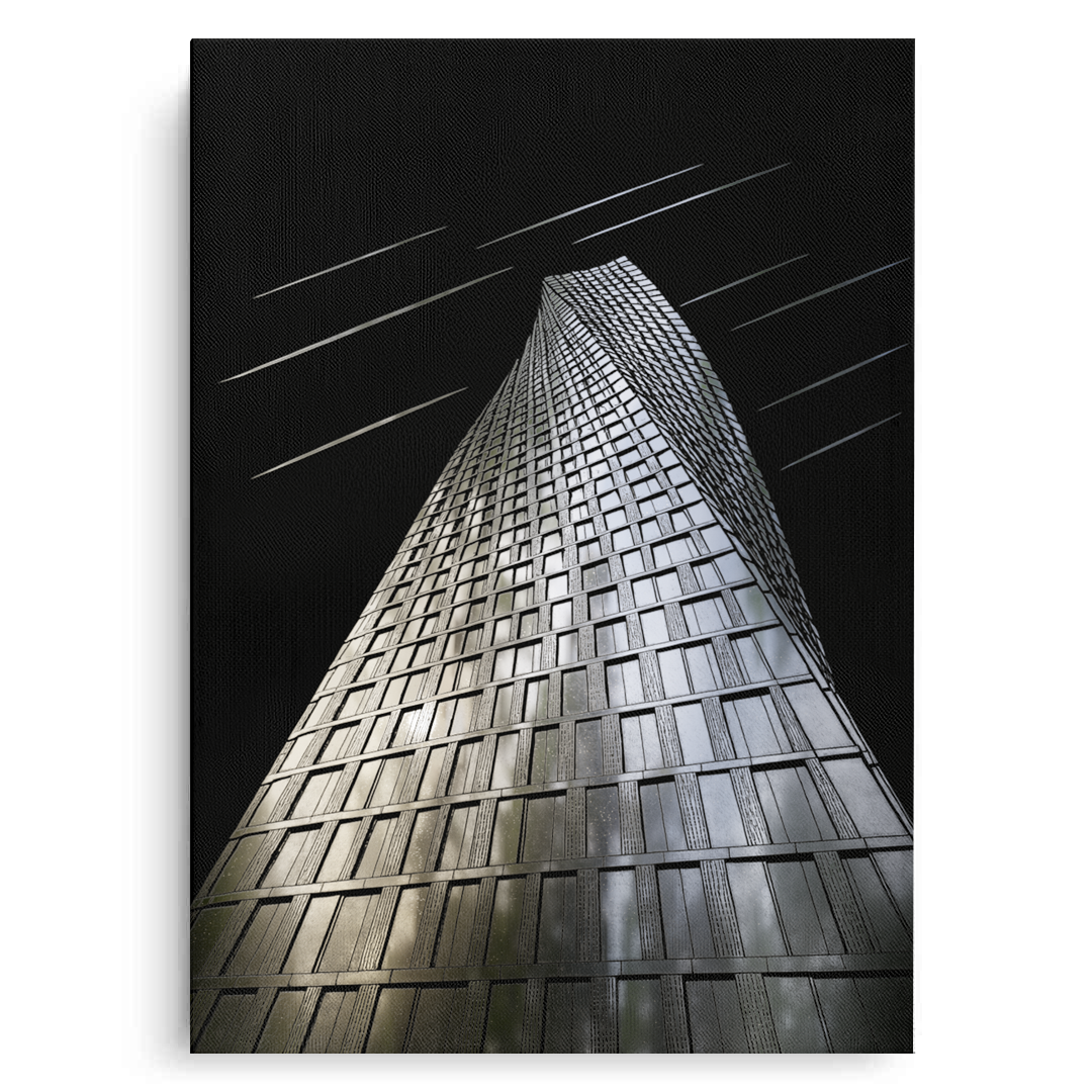 A silver-foiled depiction of Dubai’s iconic Cayan Tower, captured from a bold upward view. Its futuristic twisting design and clean monochrome style bring modern sophistication, perfect for luxury homes, offices, or contemporary interiors.