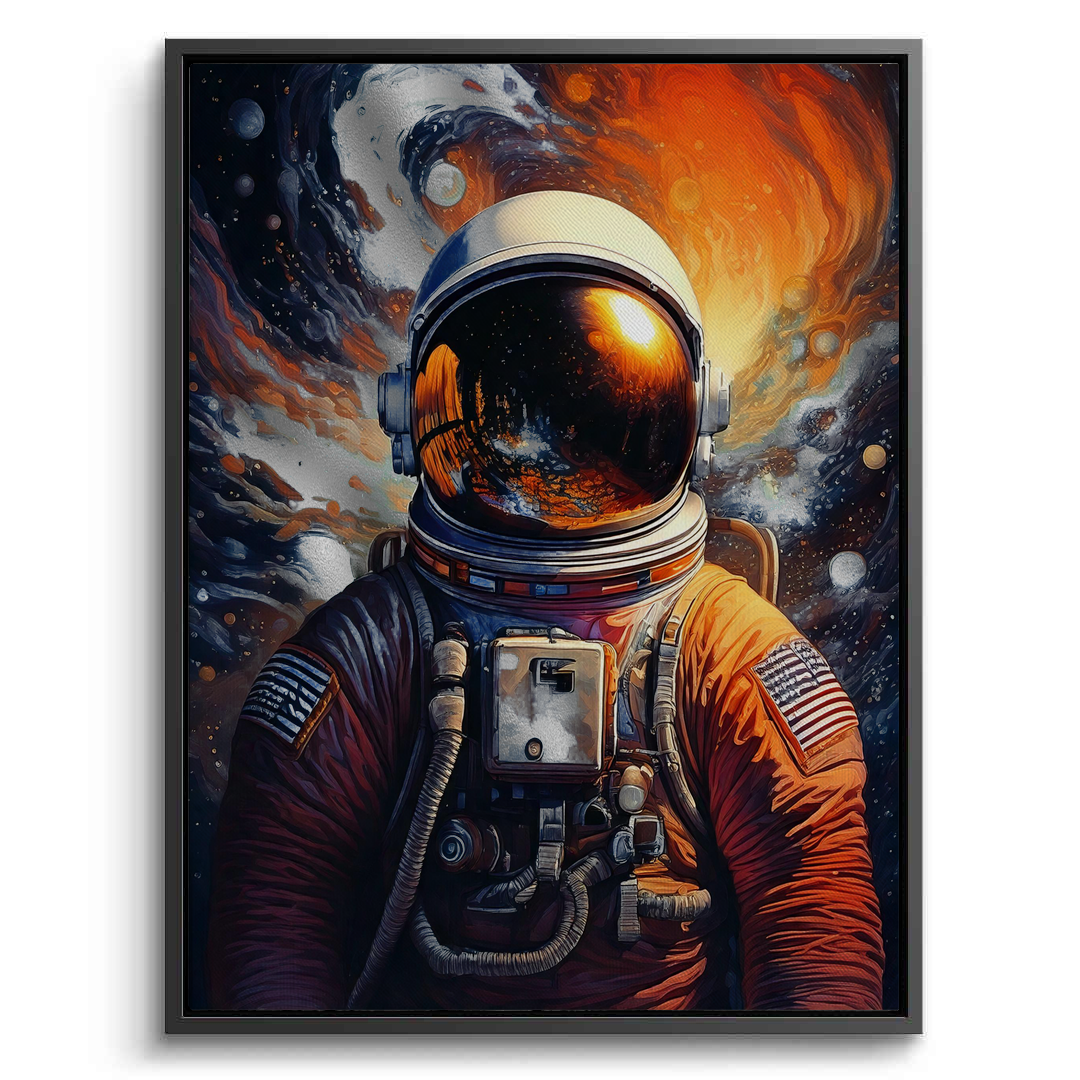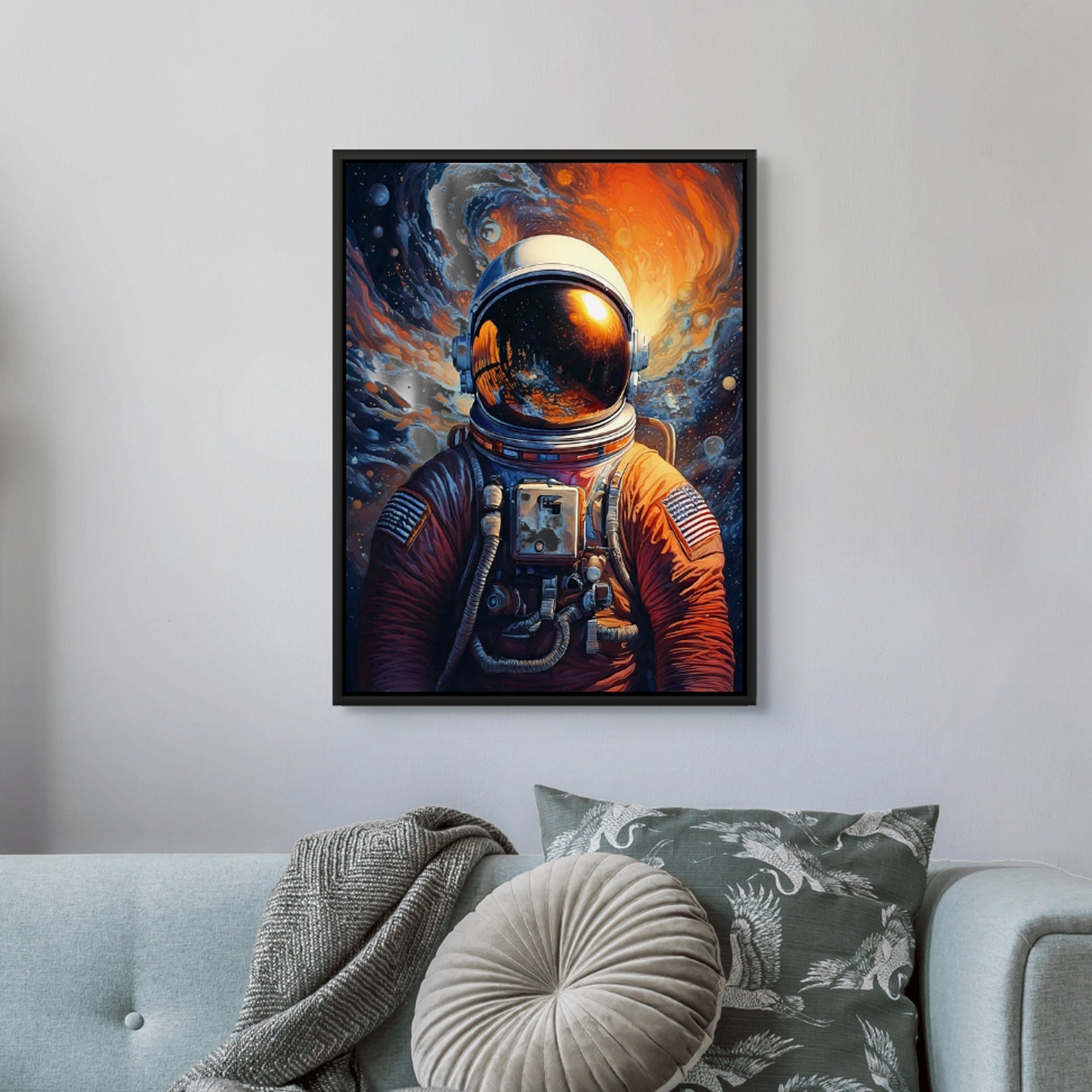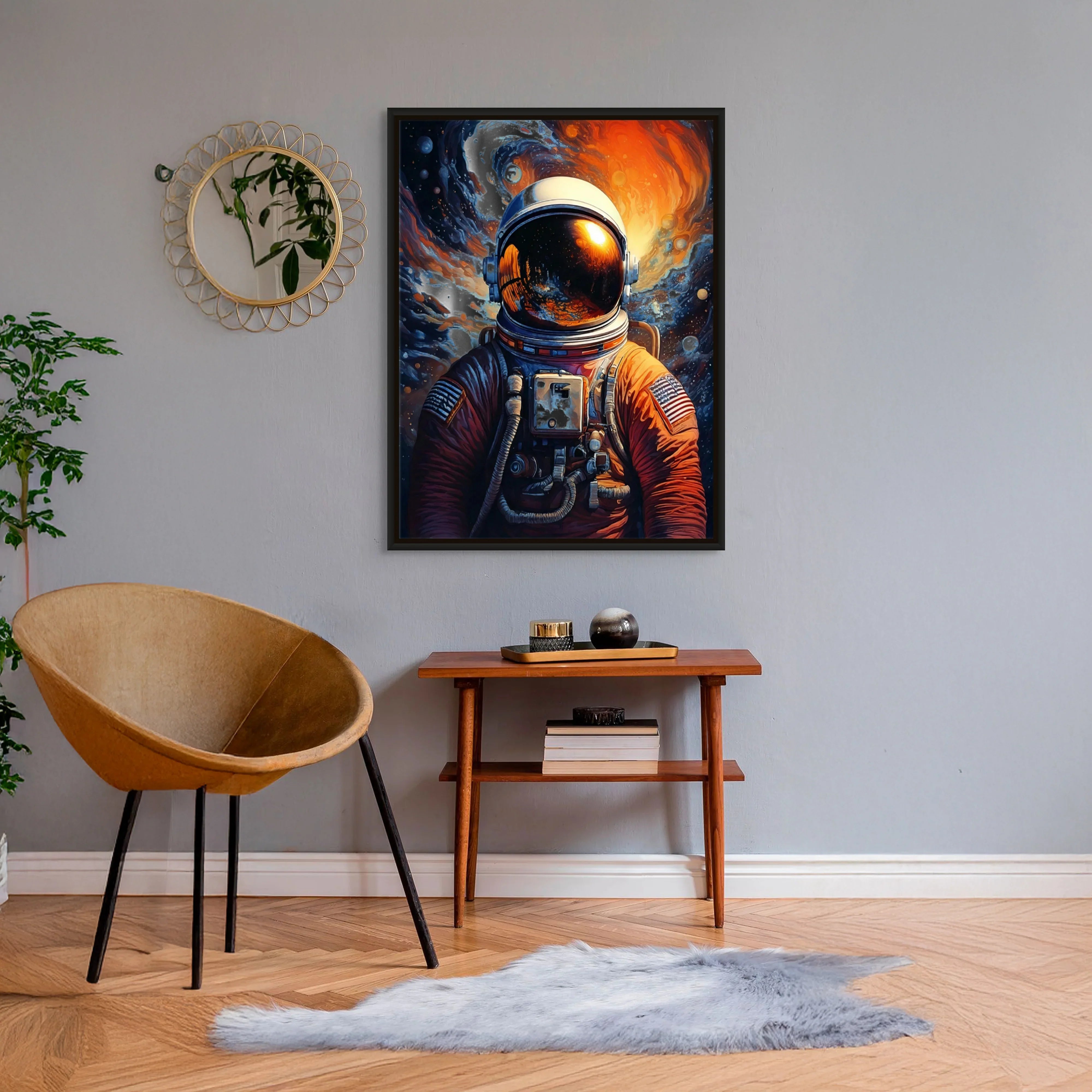 A surreal take on space exploration, this artwork features an astronaut adrift in a vibrant galaxy of swirling hues and glowing stars. Ideal for bold, modern interiors, creative workspaces, or statement gallery walls with a cosmic flair.