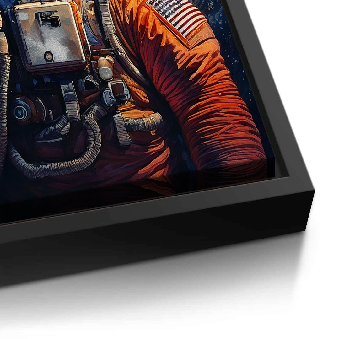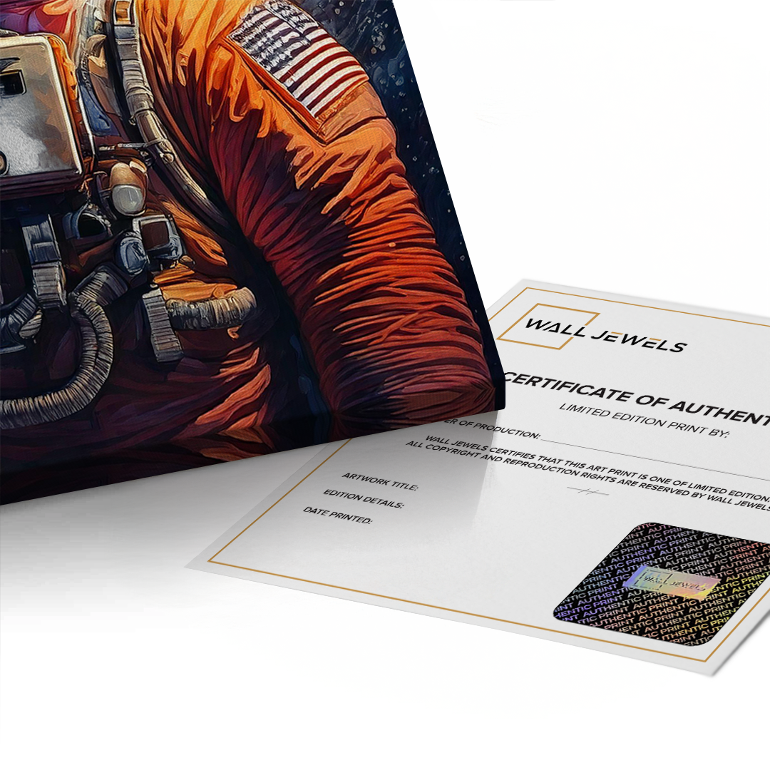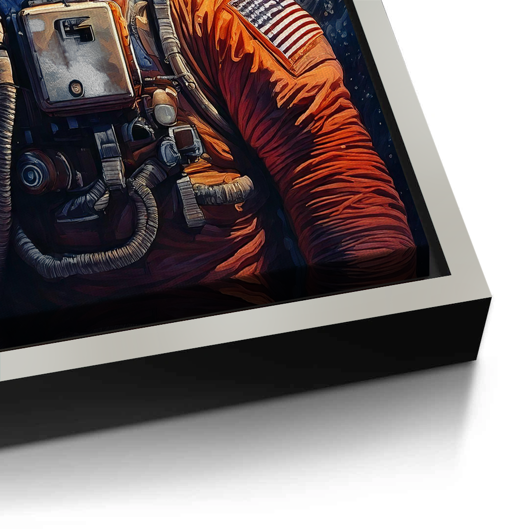A surreal take on space exploration, this artwork features an astronaut adrift in a vibrant galaxy of swirling hues and glowing stars. Ideal for bold, modern interiors, creative workspaces, or statement gallery walls with a cosmic flair.