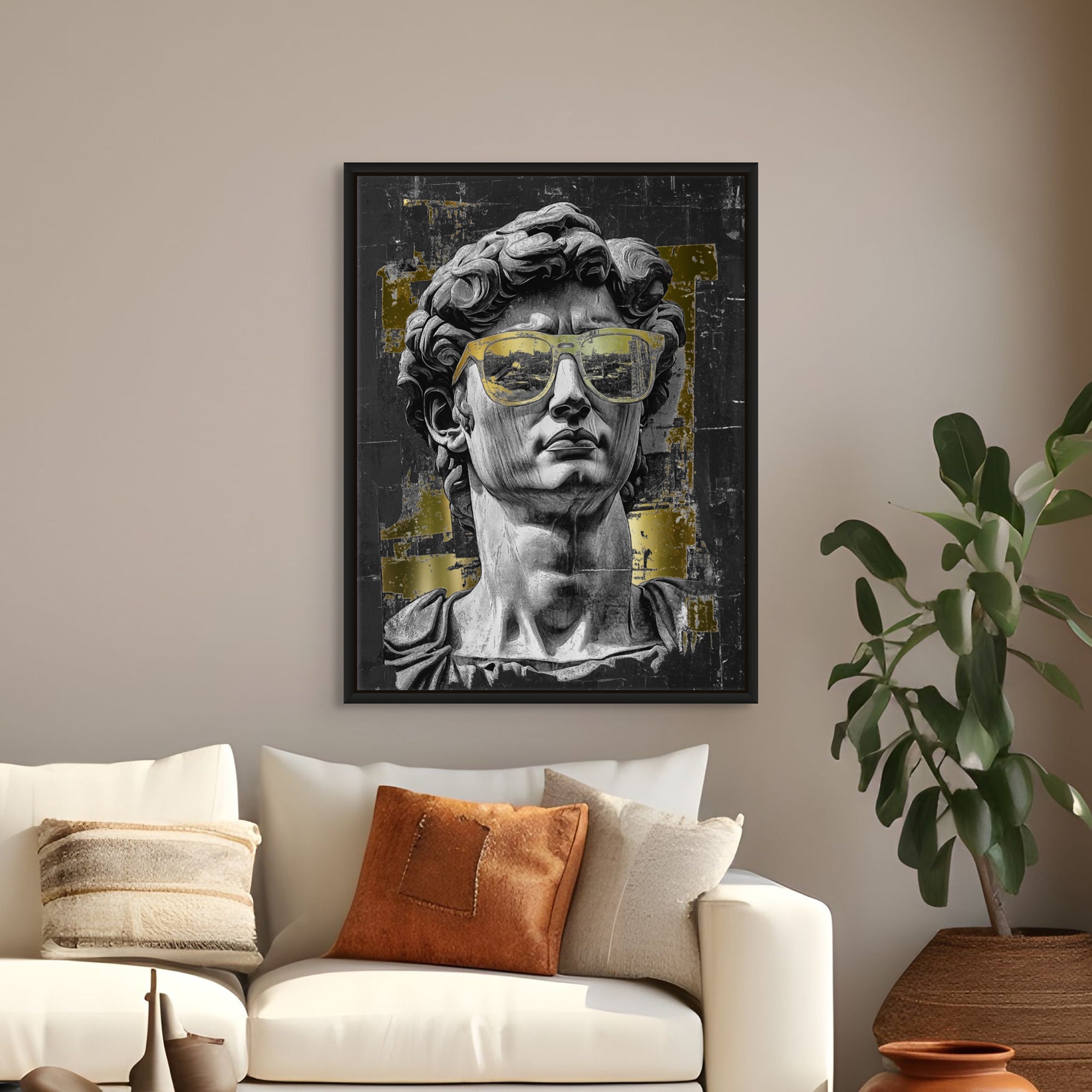 A grayscale reimagining of Michelangelo’s David, fitted with gold-mirrored shades that reflect a modern skyline. This bold twist on a classic sculpture adds pop attitude—perfect for edgy home studios, creative lounges, or art-forward interiors.