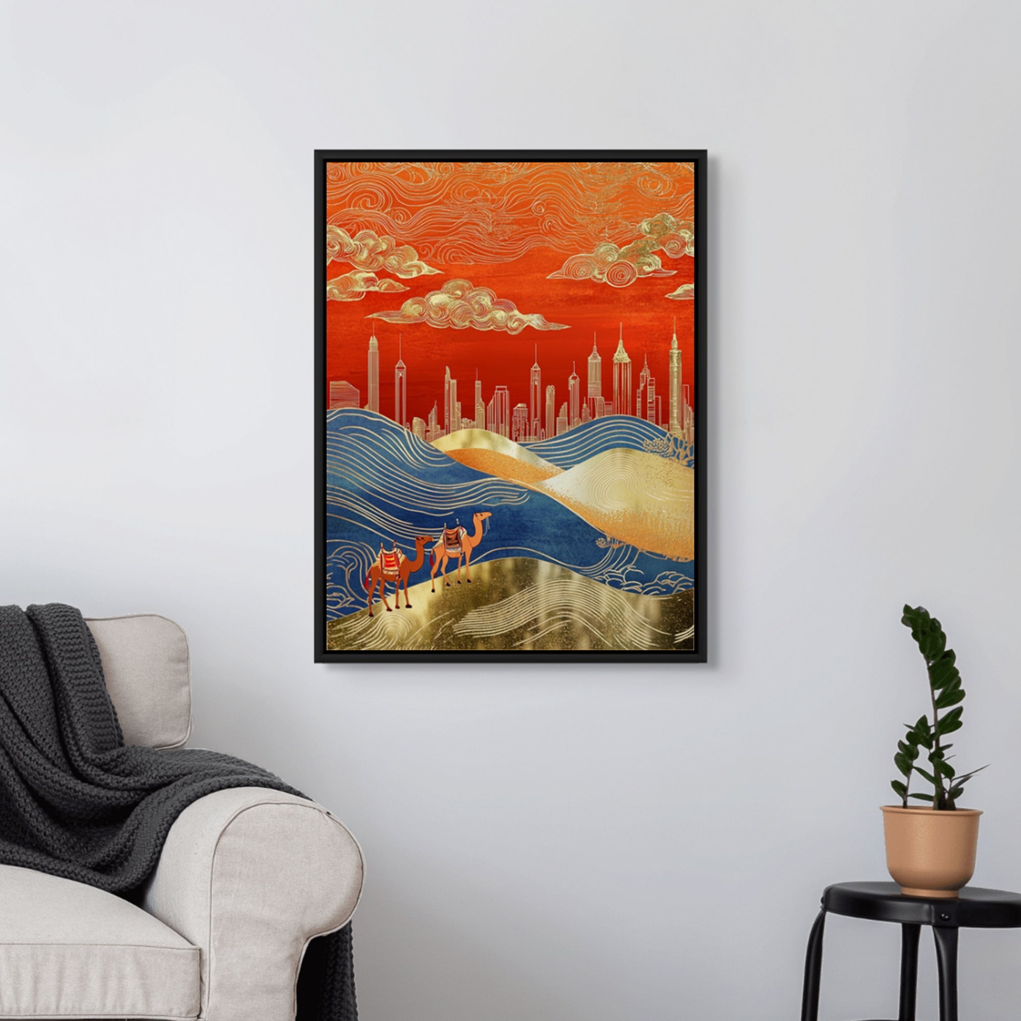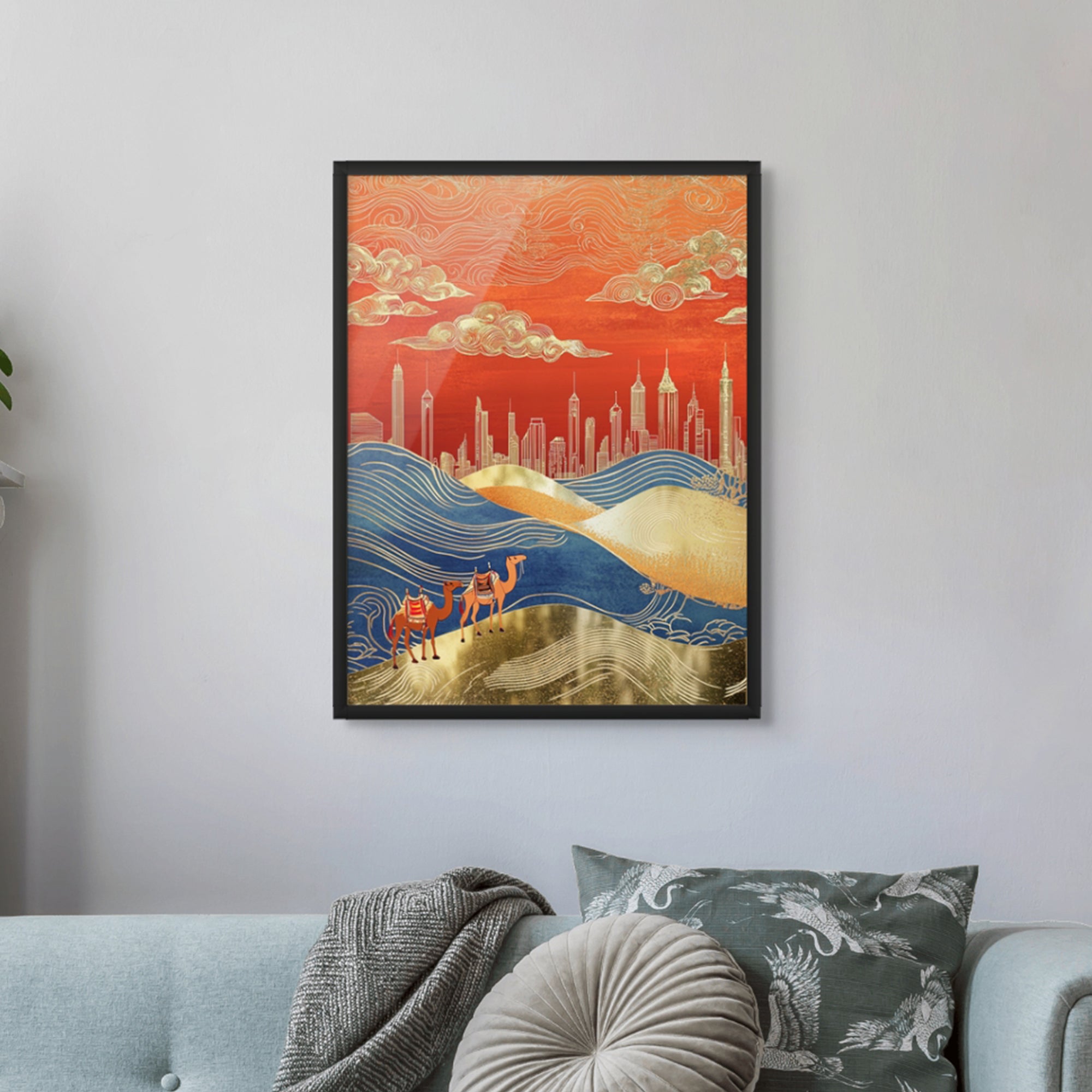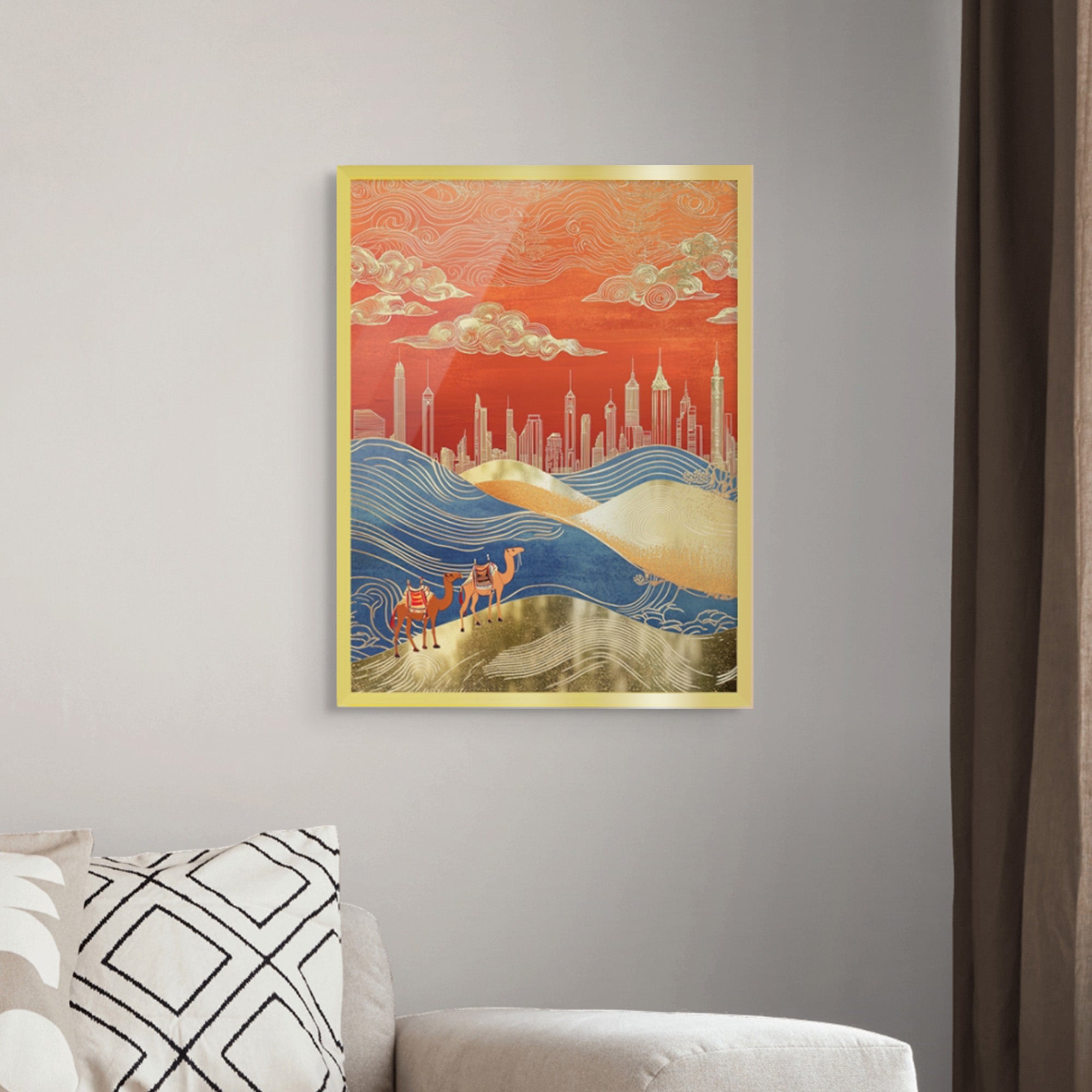 Two camels cross flowing dunes toward a golden skyline, blending tradition with progress in this elegant composition. Finished with gold foiling, this artwork suits entryways, offices, or interiors that honor the spirit of the desert.