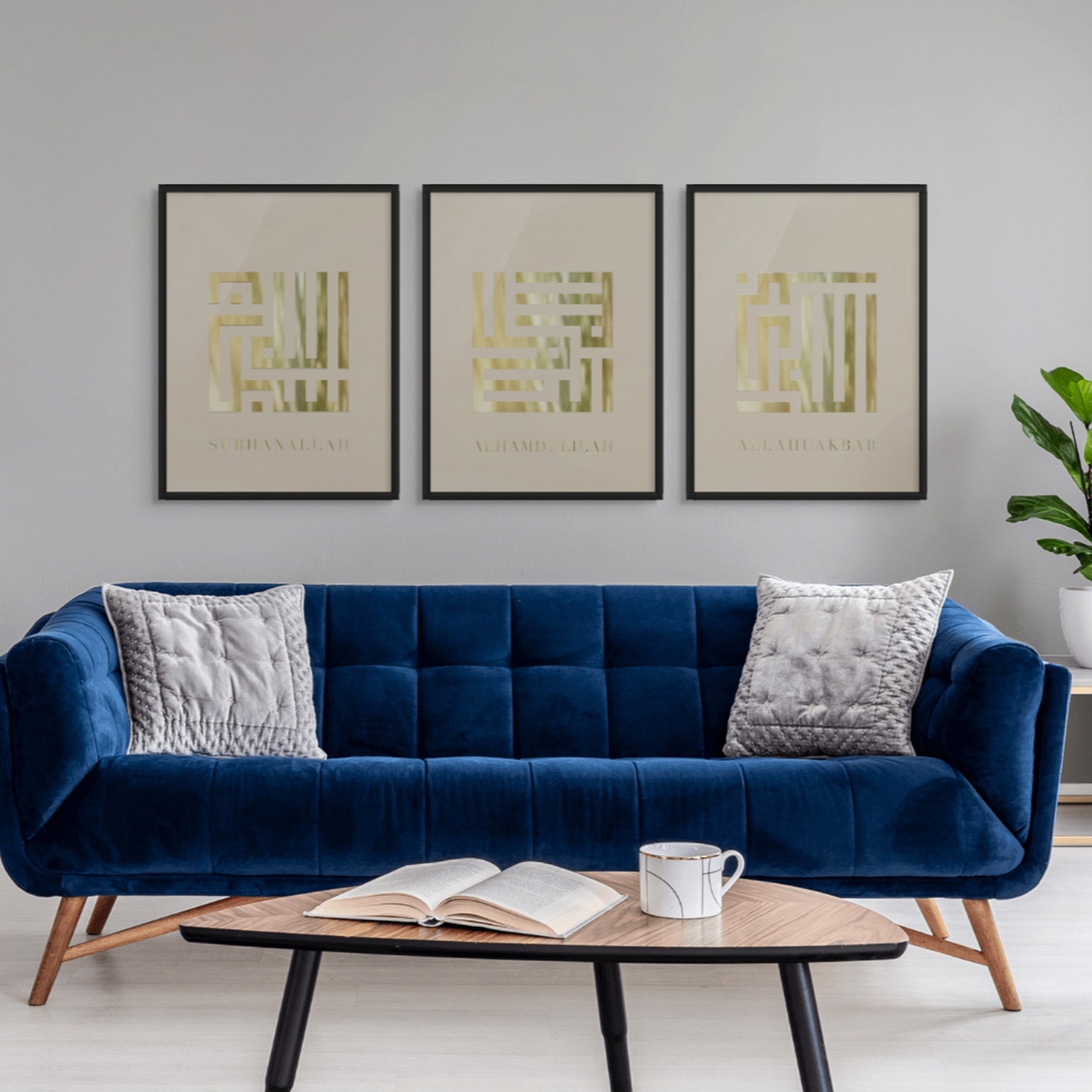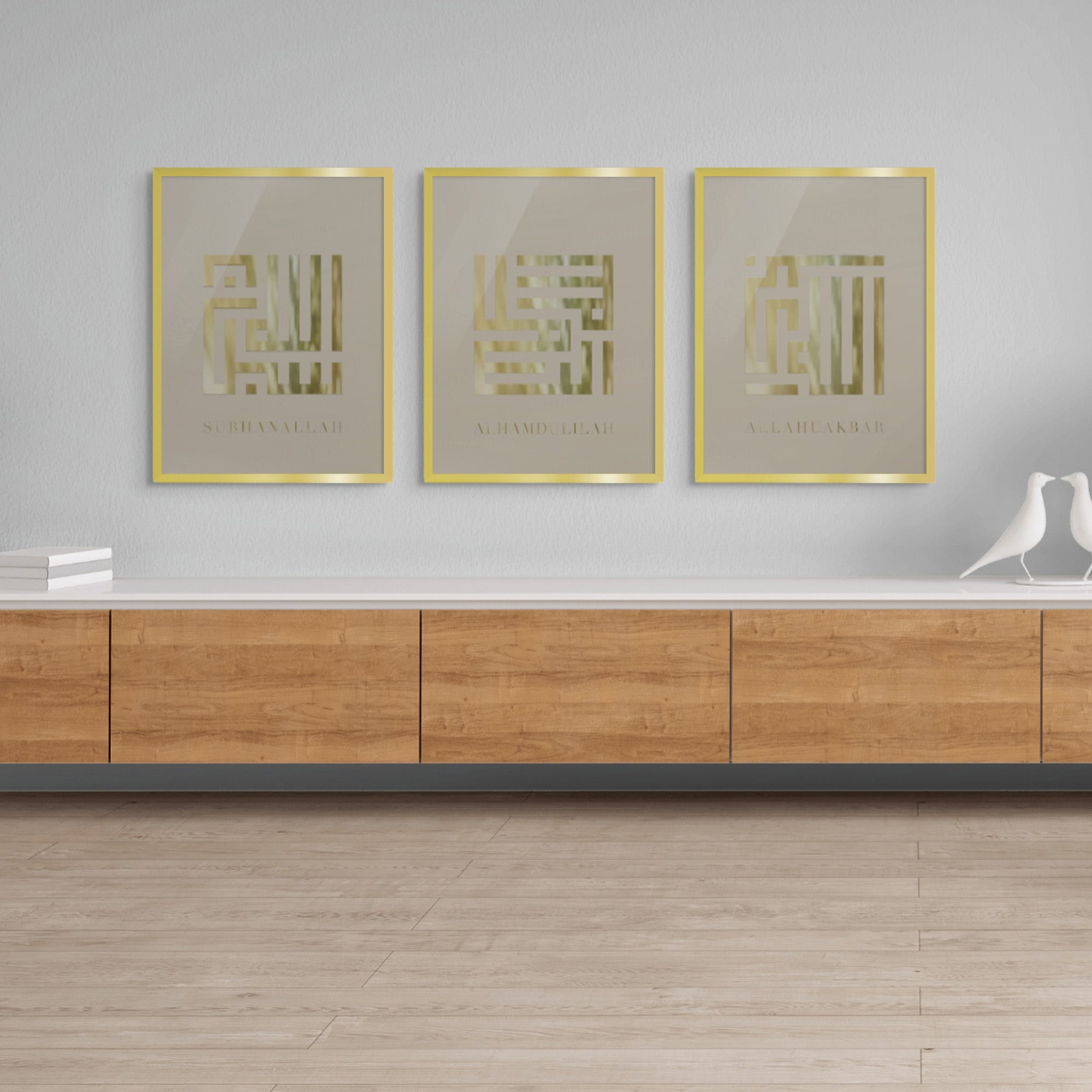 A minimalist trio showcasing essential Islamic phrases—SubhanAllah, Alhamdulillah, and AllahuAkbar—in elegant kufi-style gold foiled calligraphy. Perfect for modern homes, this set adds a refined, spiritual presence to living rooms, hallways, or prayer spaces.