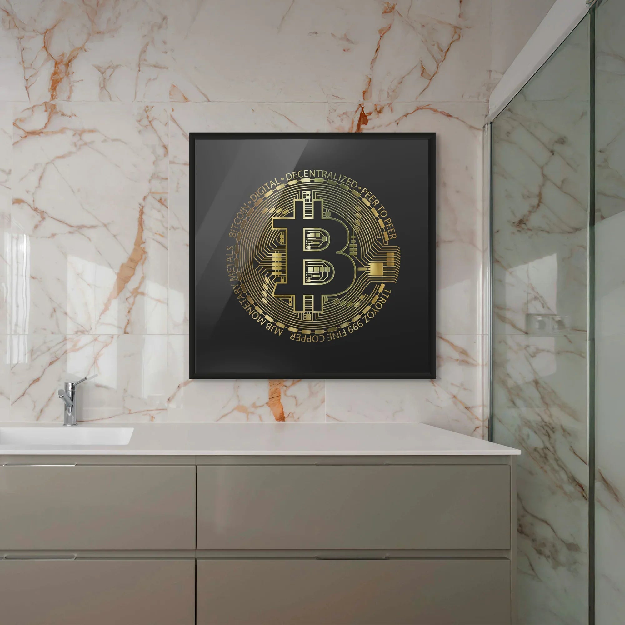 A tribute to the future of currency, this gold-foiled Bitcoin design blends tech and luxury. Perfect for modern offices, trading dens, or edgy lounges—made for crypto lovers who appreciate sharp design and bold statements.