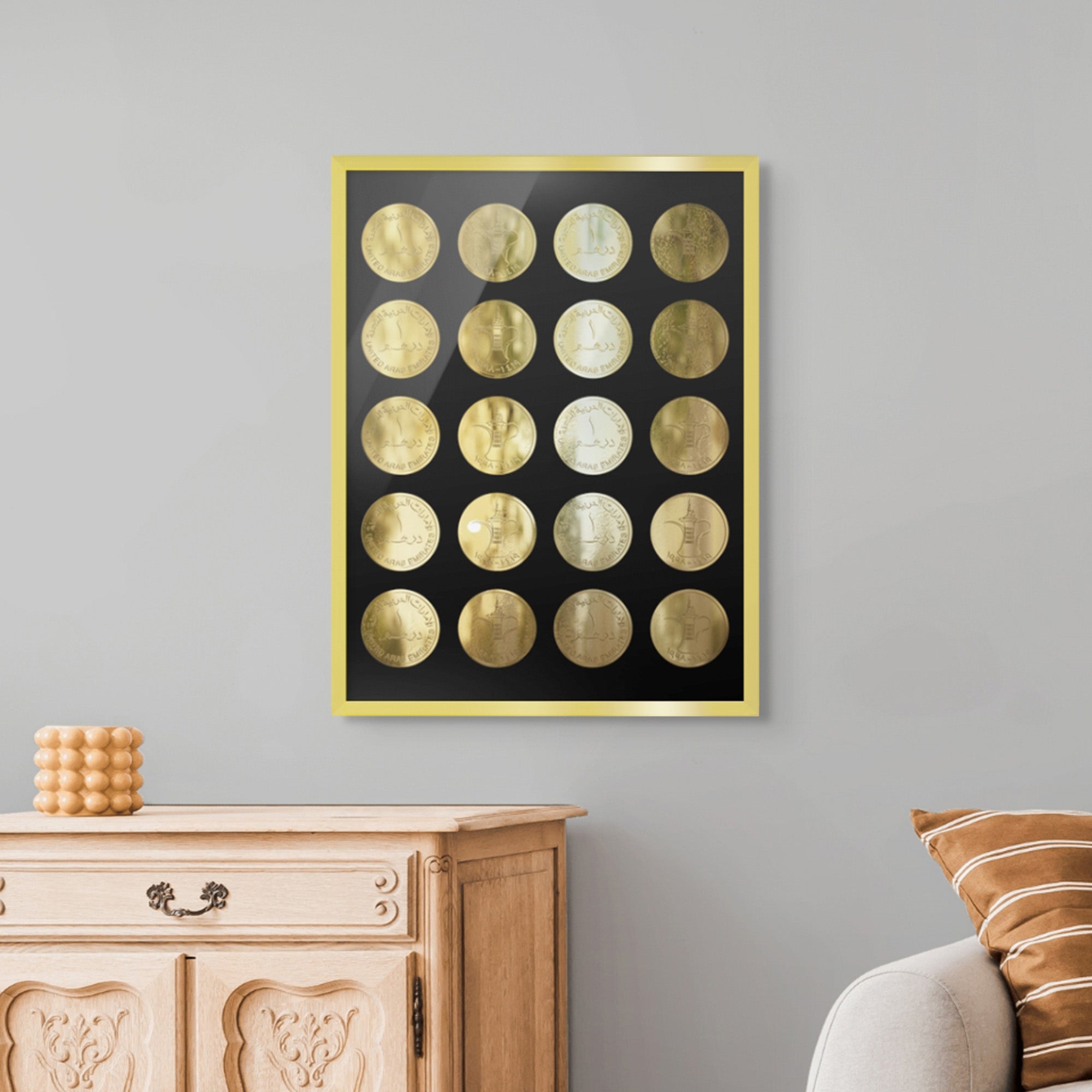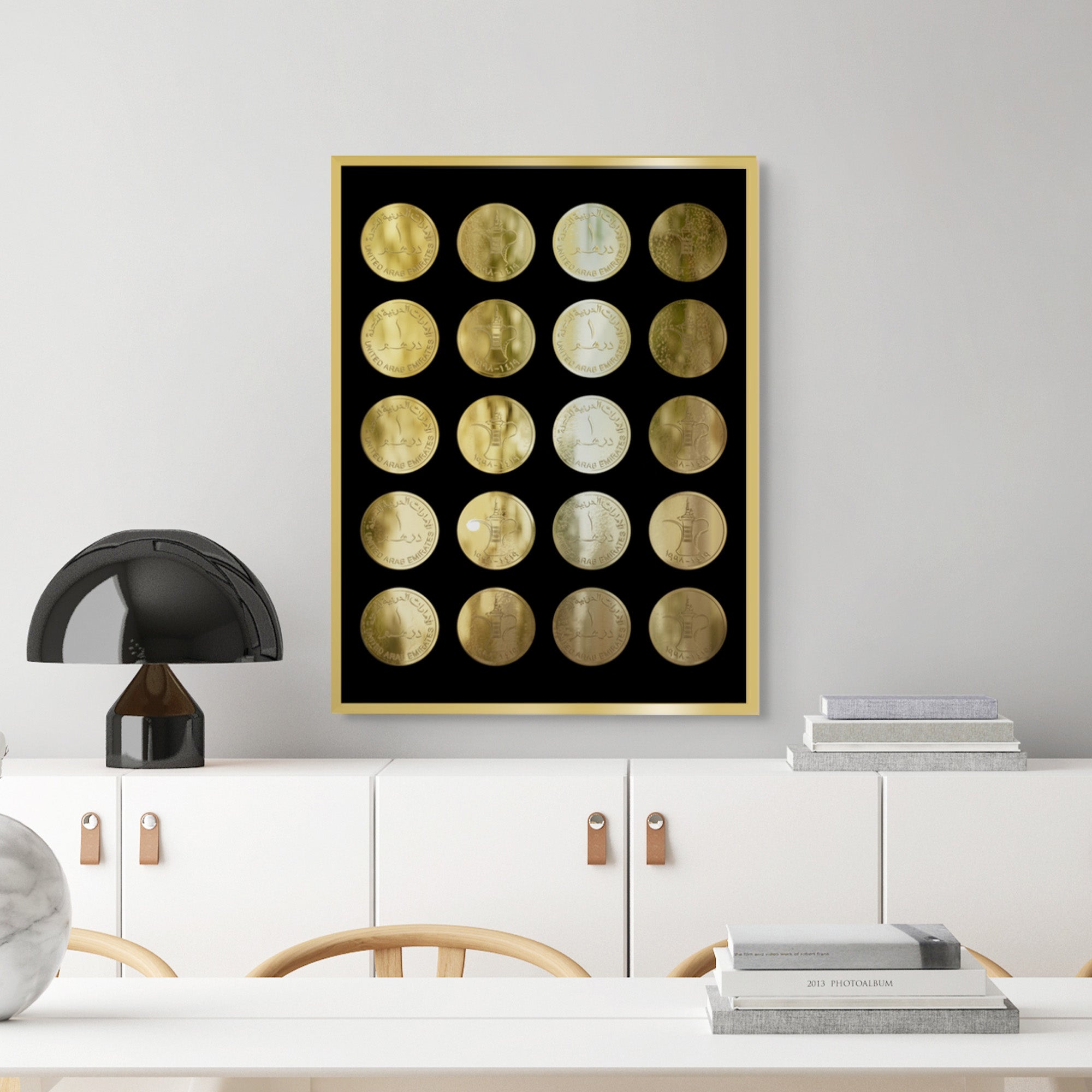 This golden-toned artwork reimagines the UAE’s one-dirham coin—Dirham Dhahabi, meaning “Golden Dirham.” Featuring the iconic Dallah and Arabic script, it blends cultural pride with elegance, ideal for heritage-inspired interiors and refined statement spaces.