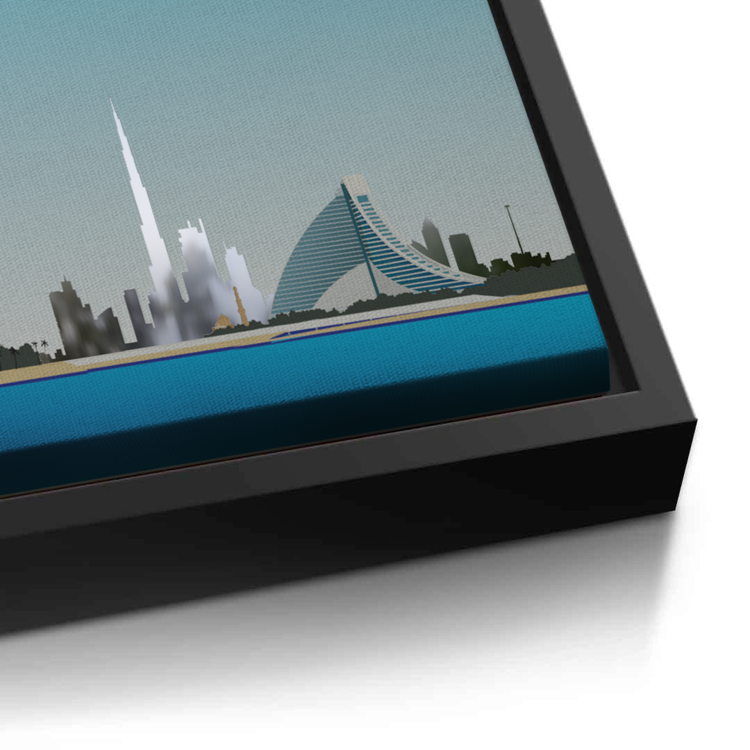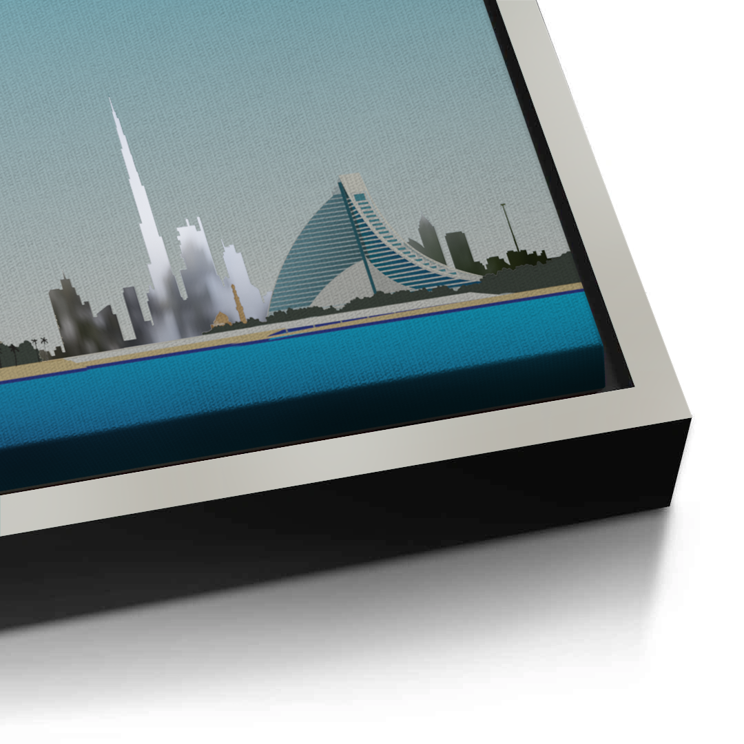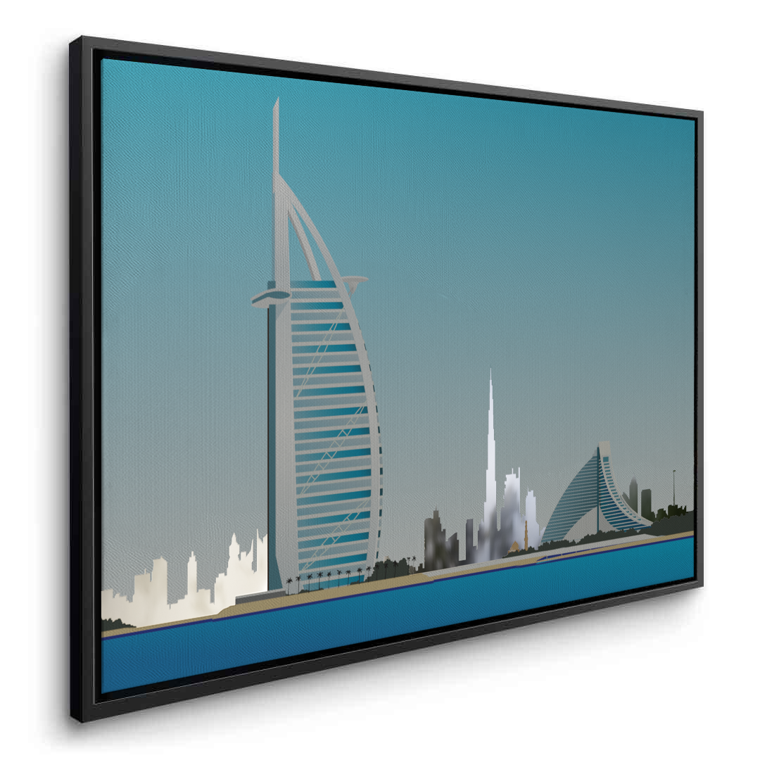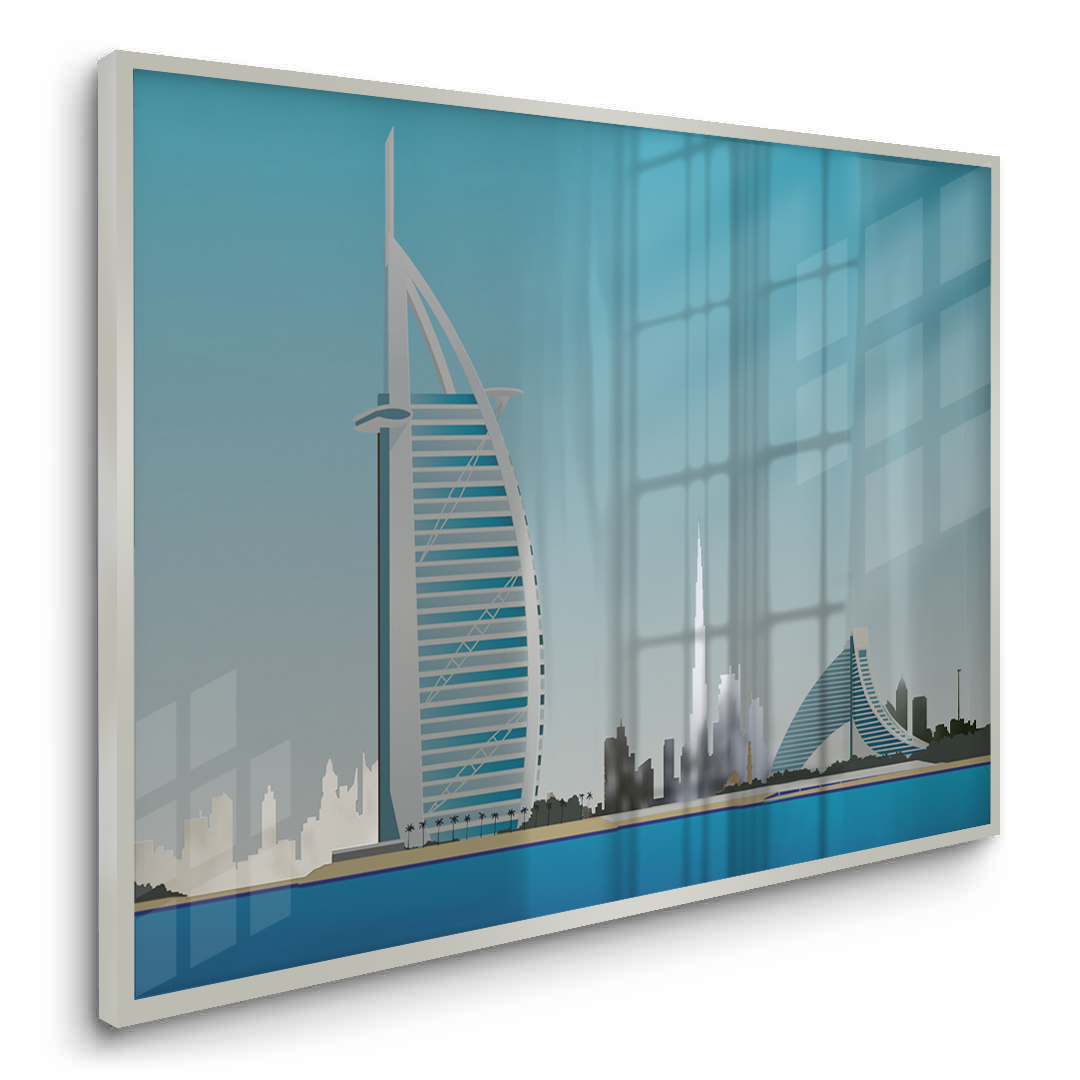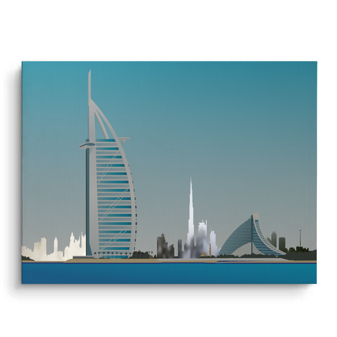 This striking artwork highlights the Burj Al Arab by the sea, framed by Dubai’s iconic skyline. Its clean colours and architectural detail make it ideal for modern homes, offices, or waterfront-inspired spaces.