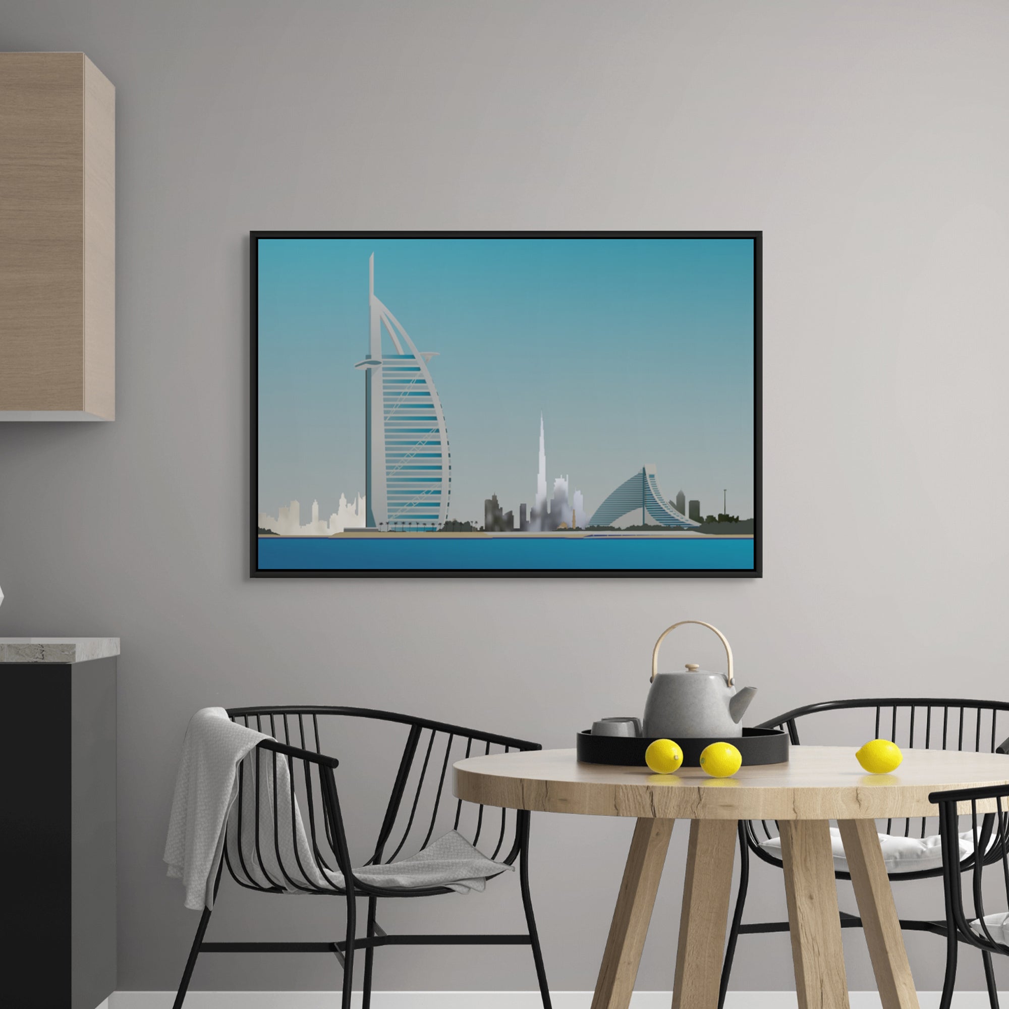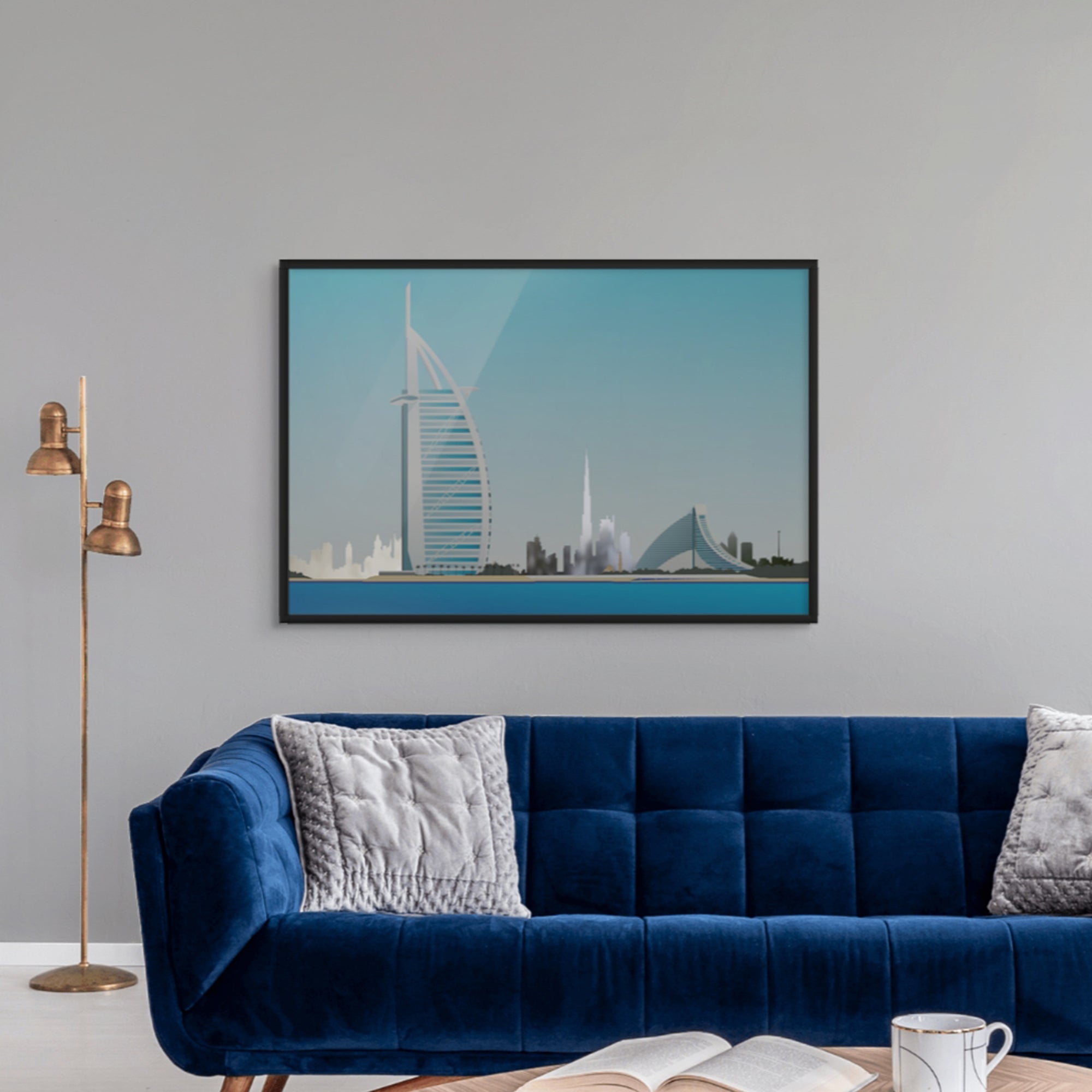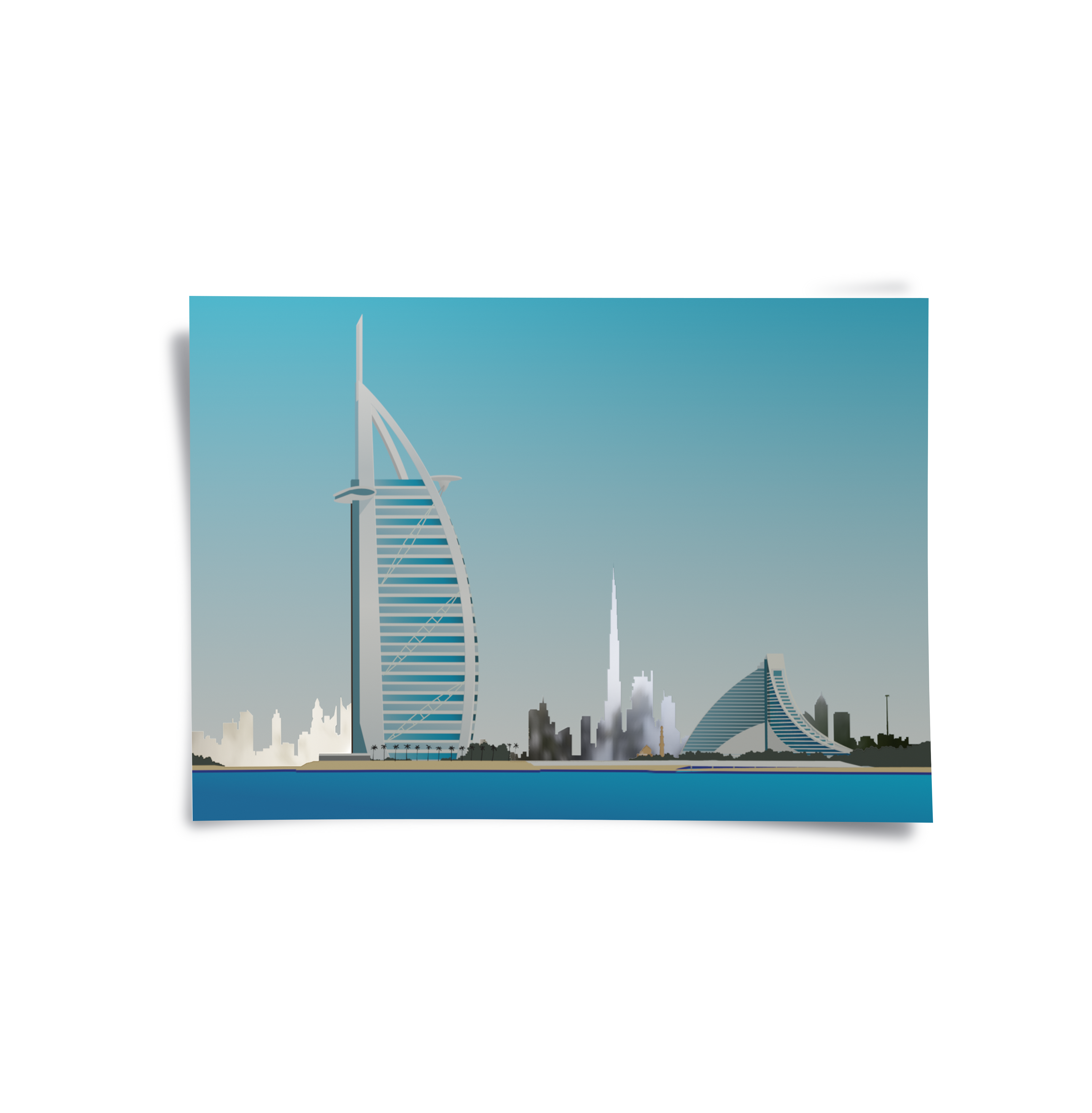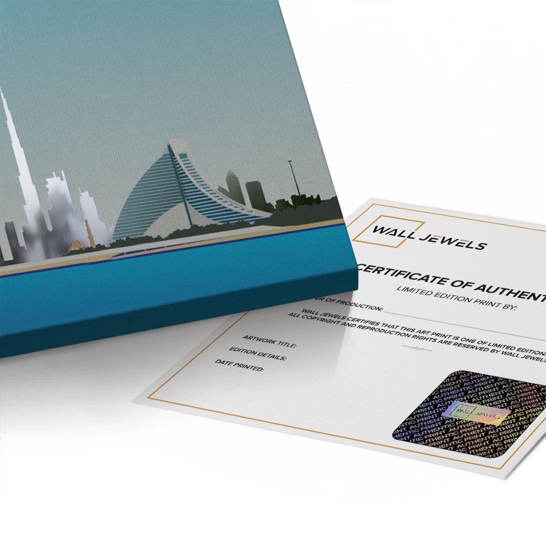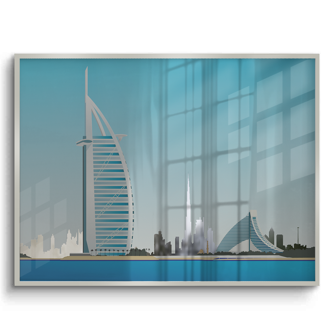 This striking artwork highlights the Burj Al Arab by the sea, framed by Dubai’s iconic skyline. Its clean colours and architectural detail make it ideal for modern homes, offices, or waterfront-inspired spaces.
