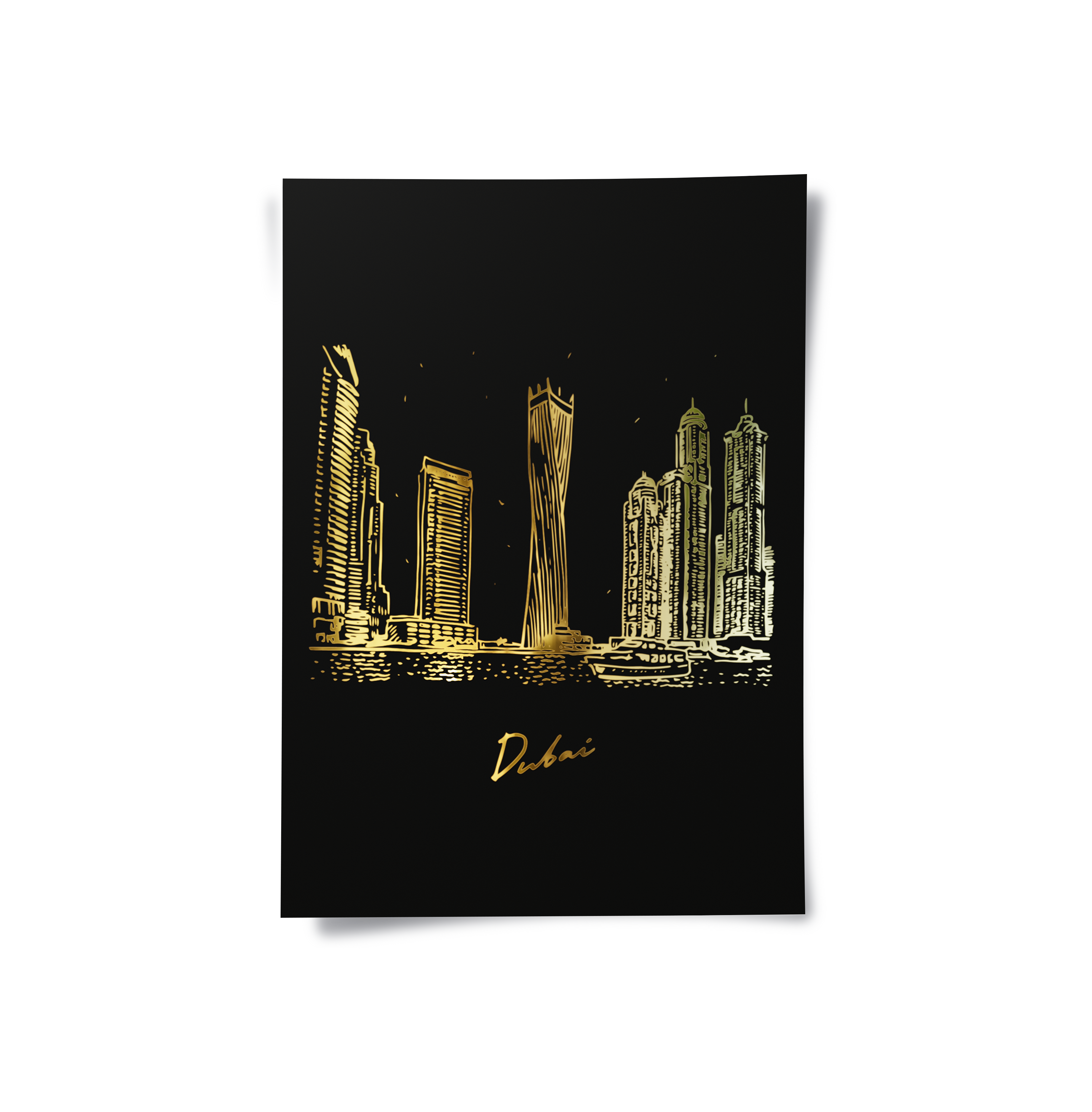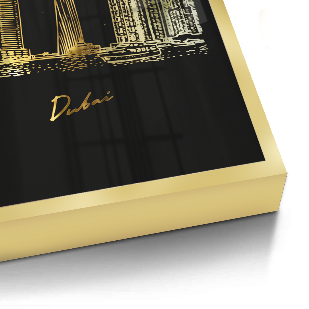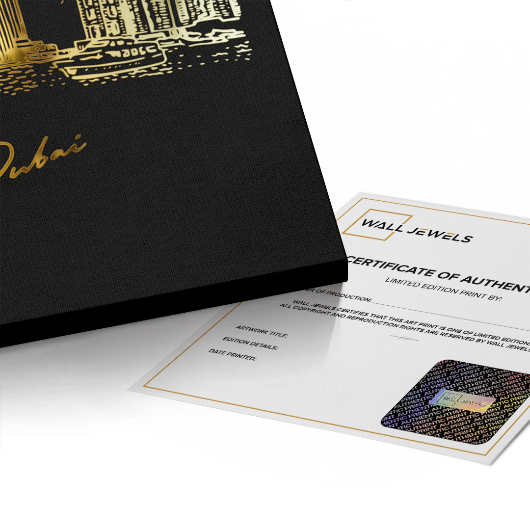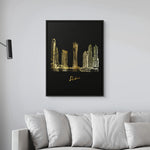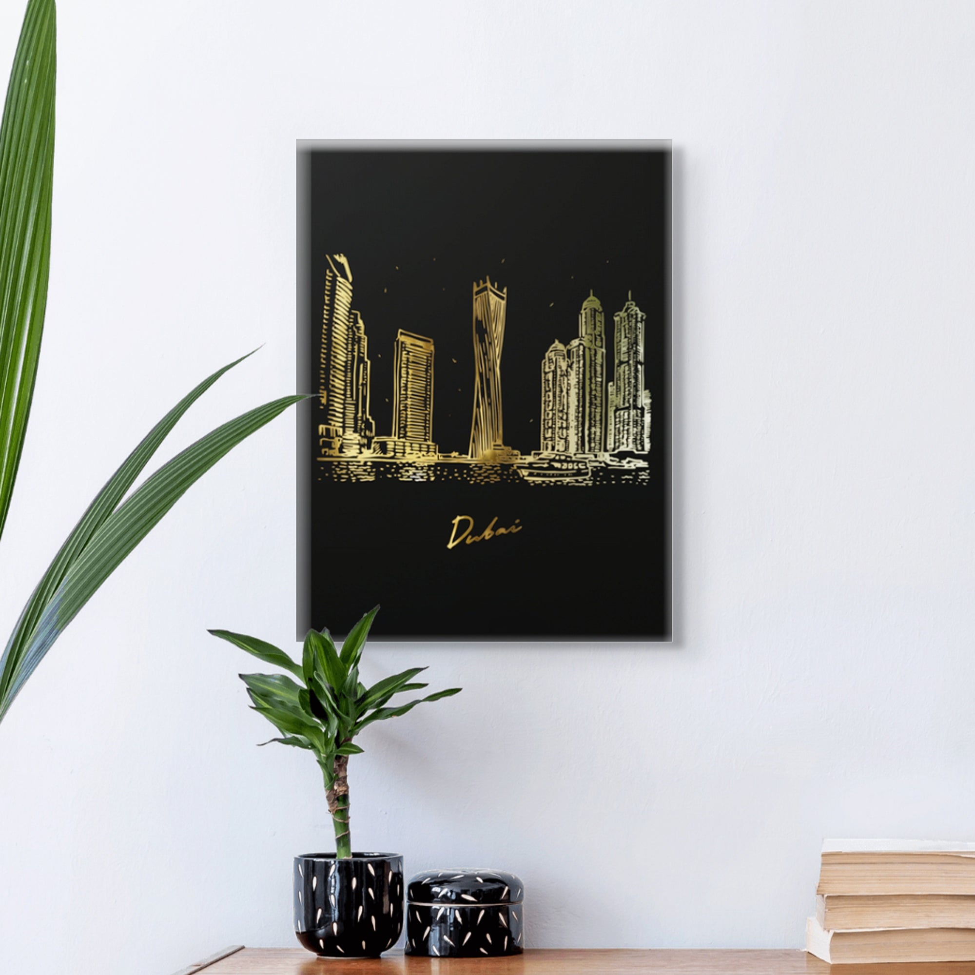 Featuring Dubai Marina’s iconic towers in radiant gold foil, this artwork blends modern architecture with luxury. A bold piece for contemporary homes, lounges, or offices celebrating Dubai’s architectural landmarks.